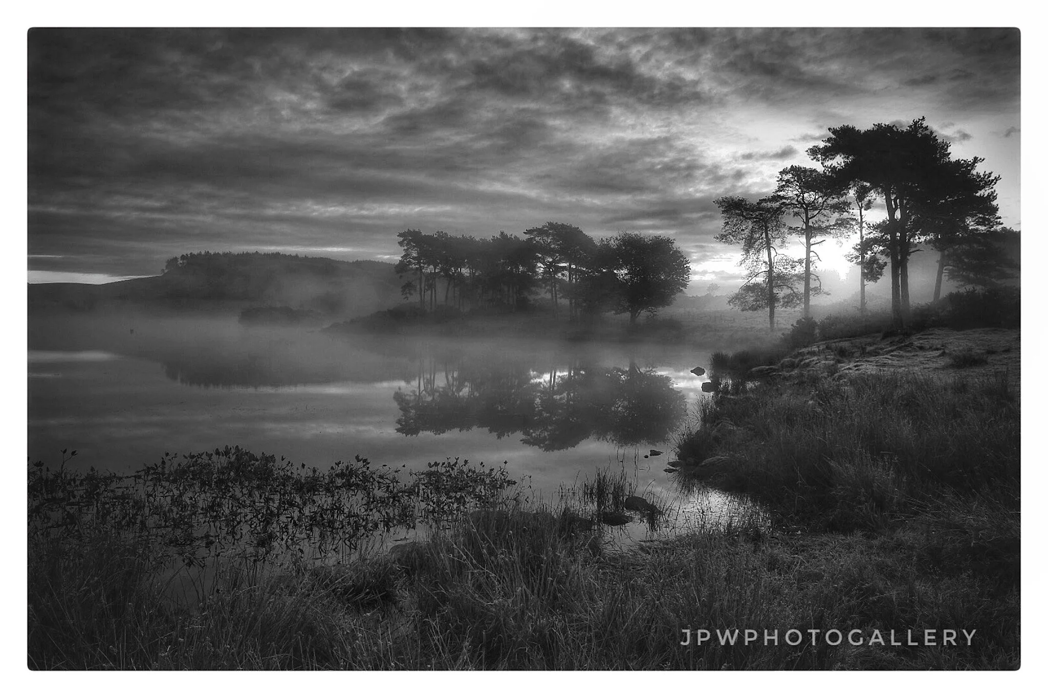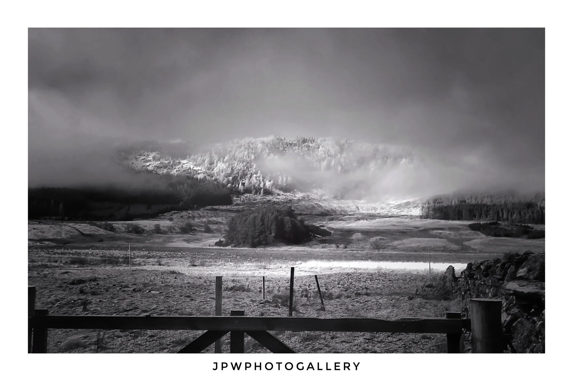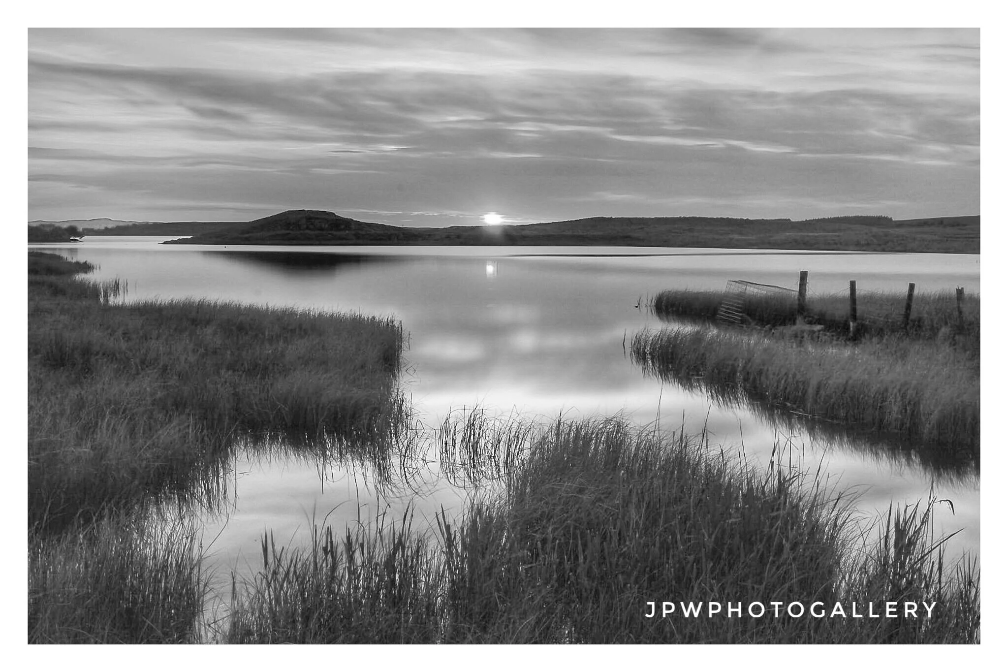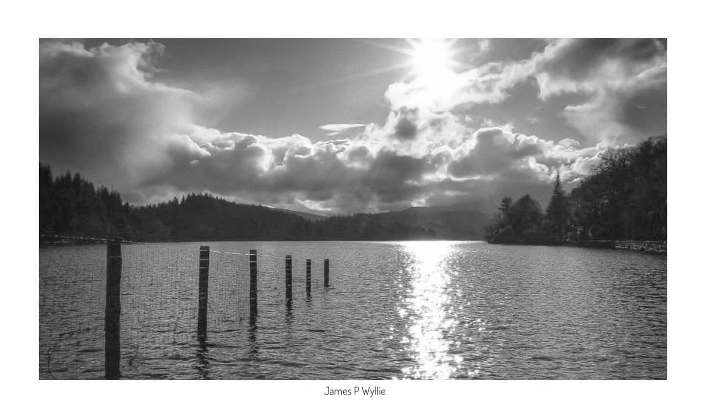 Black and white landscape photo of a lake with a line of wooden posts, surrounded by trees, with a cloudy sky and sunlight reflecting on the water, credited to James P Wyllie. View fullsize