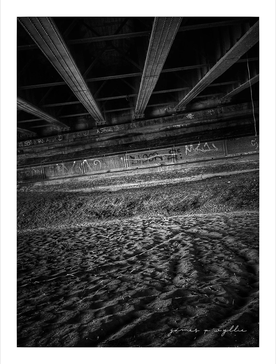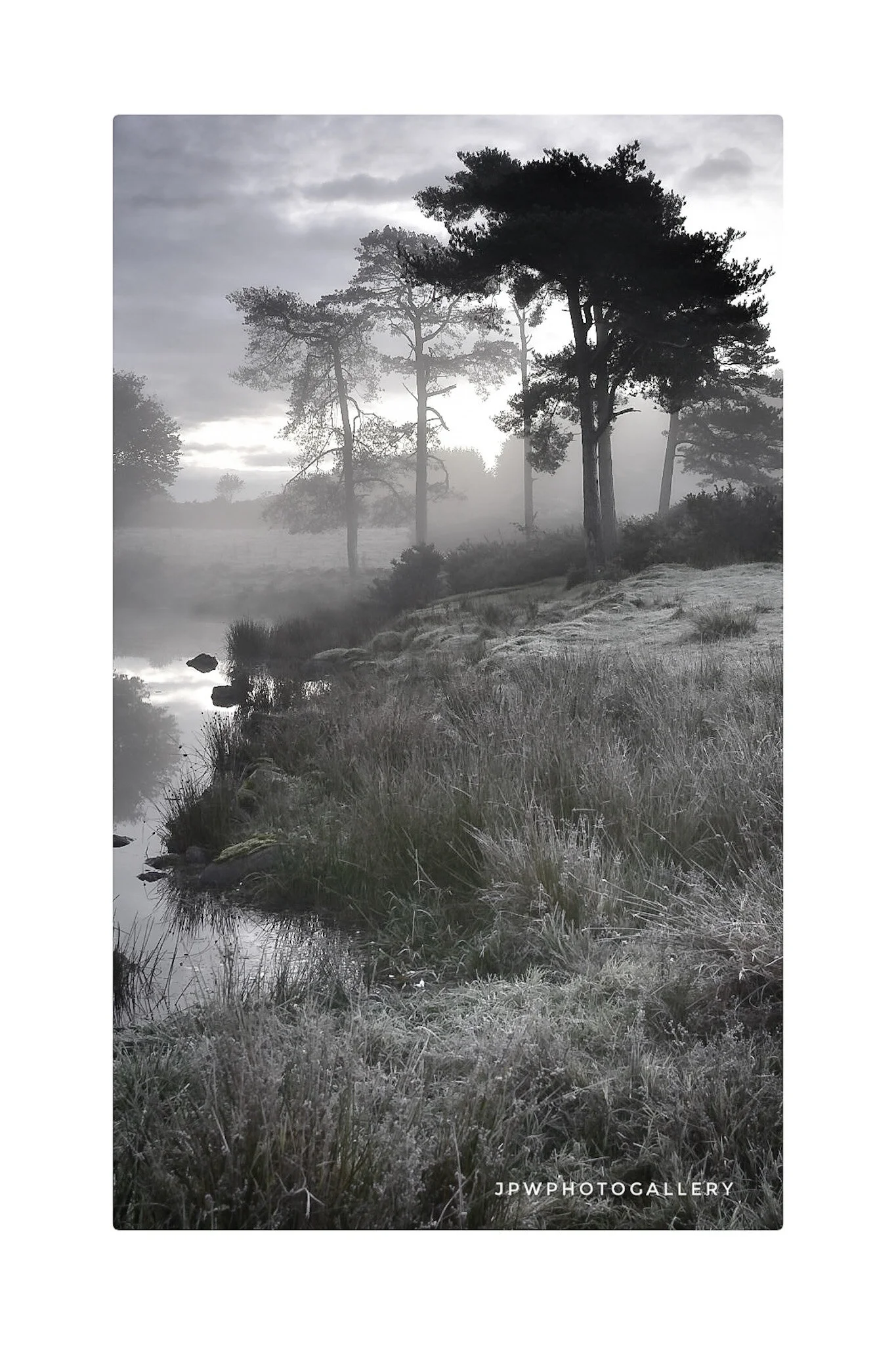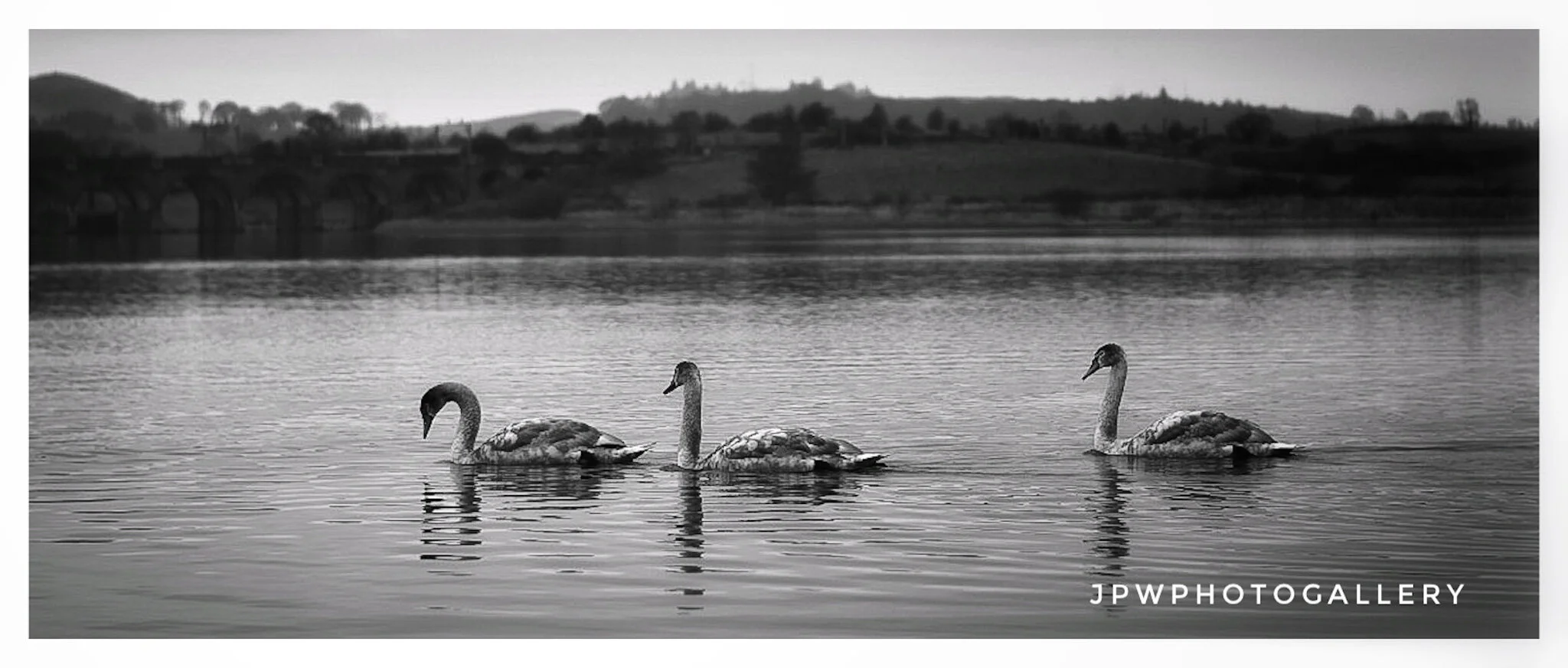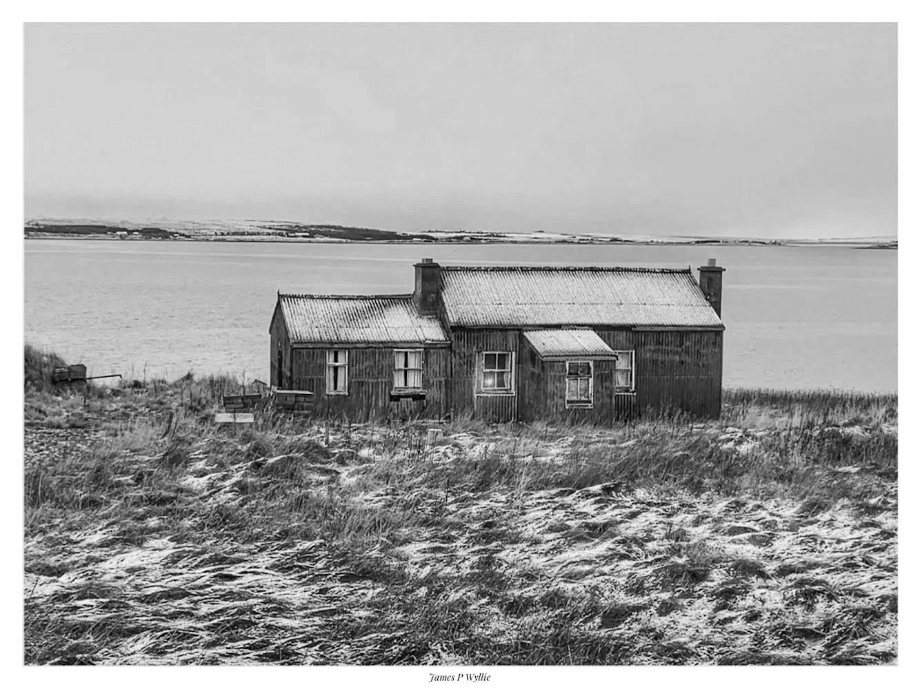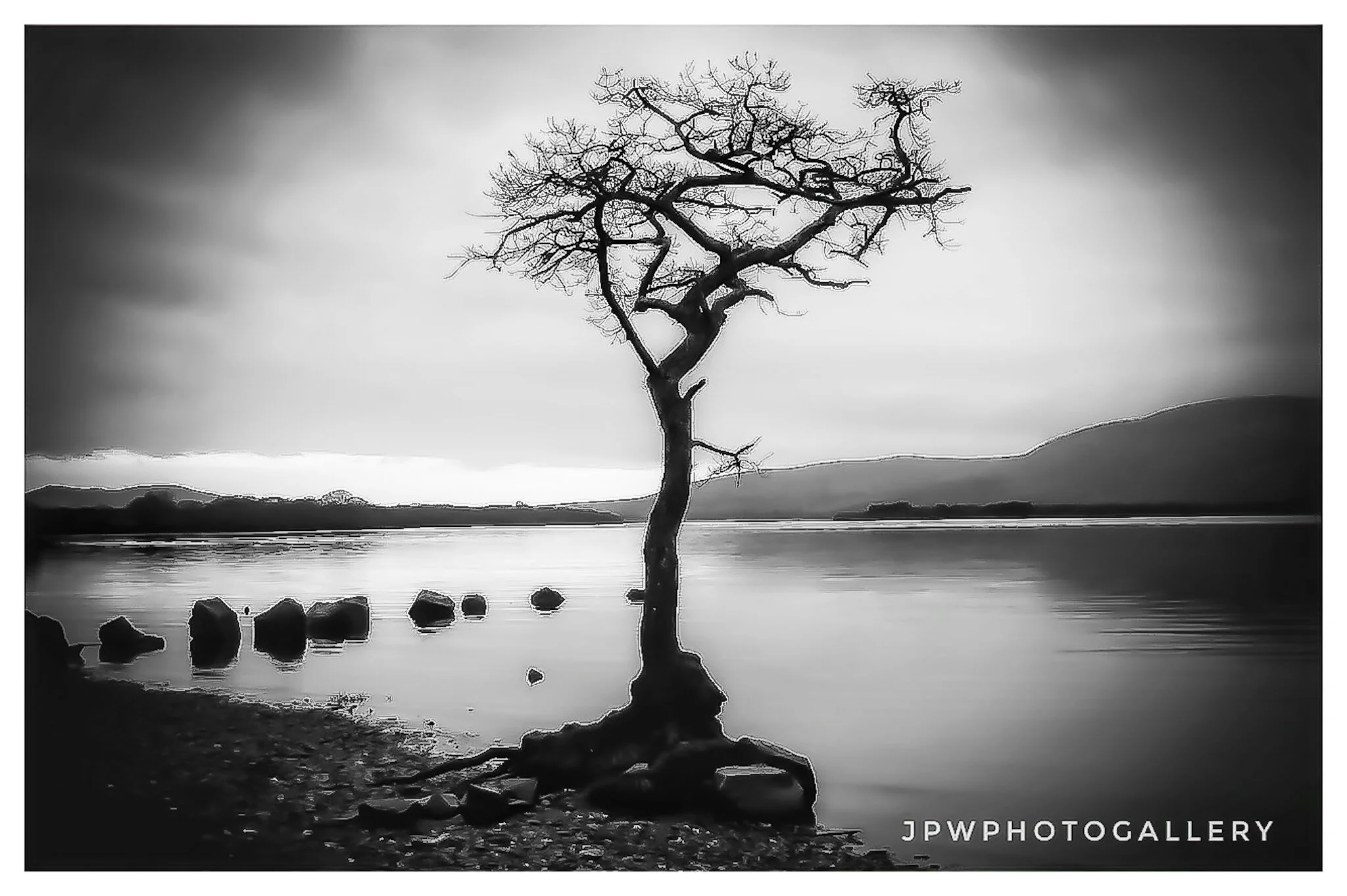 Black and white landscape photo of a lake with a line of wooden posts, surrounded by trees, with a cloudy sky and sunlight reflecting on the water, credited to James P Wyllie. View fullsize