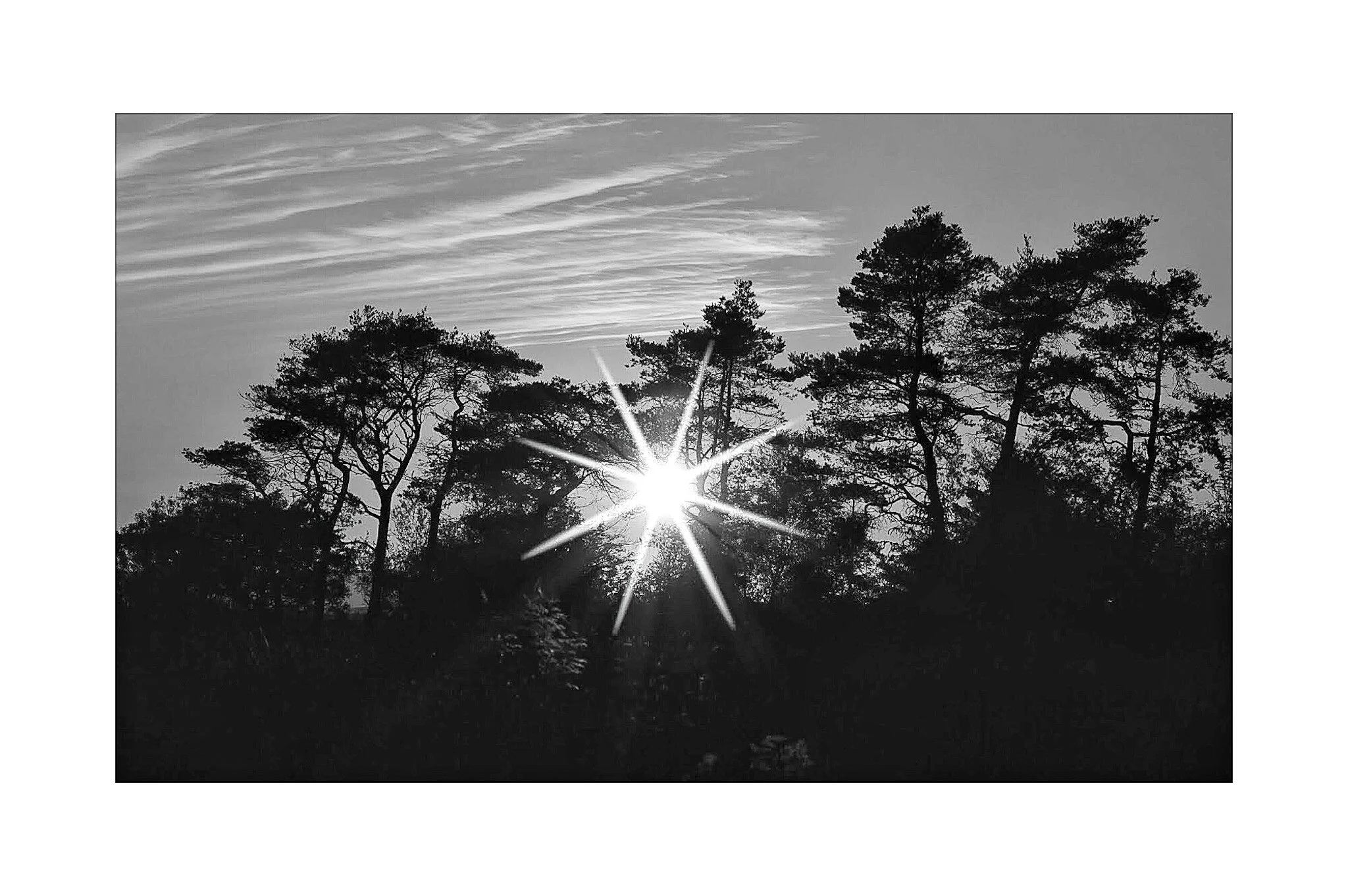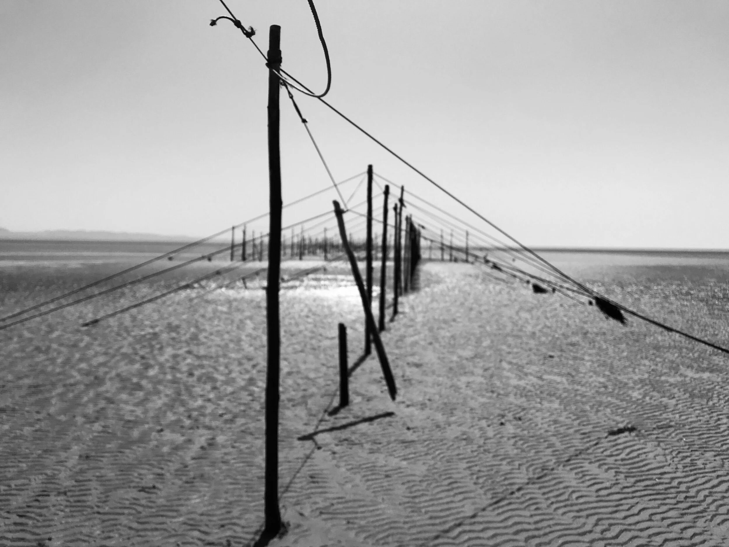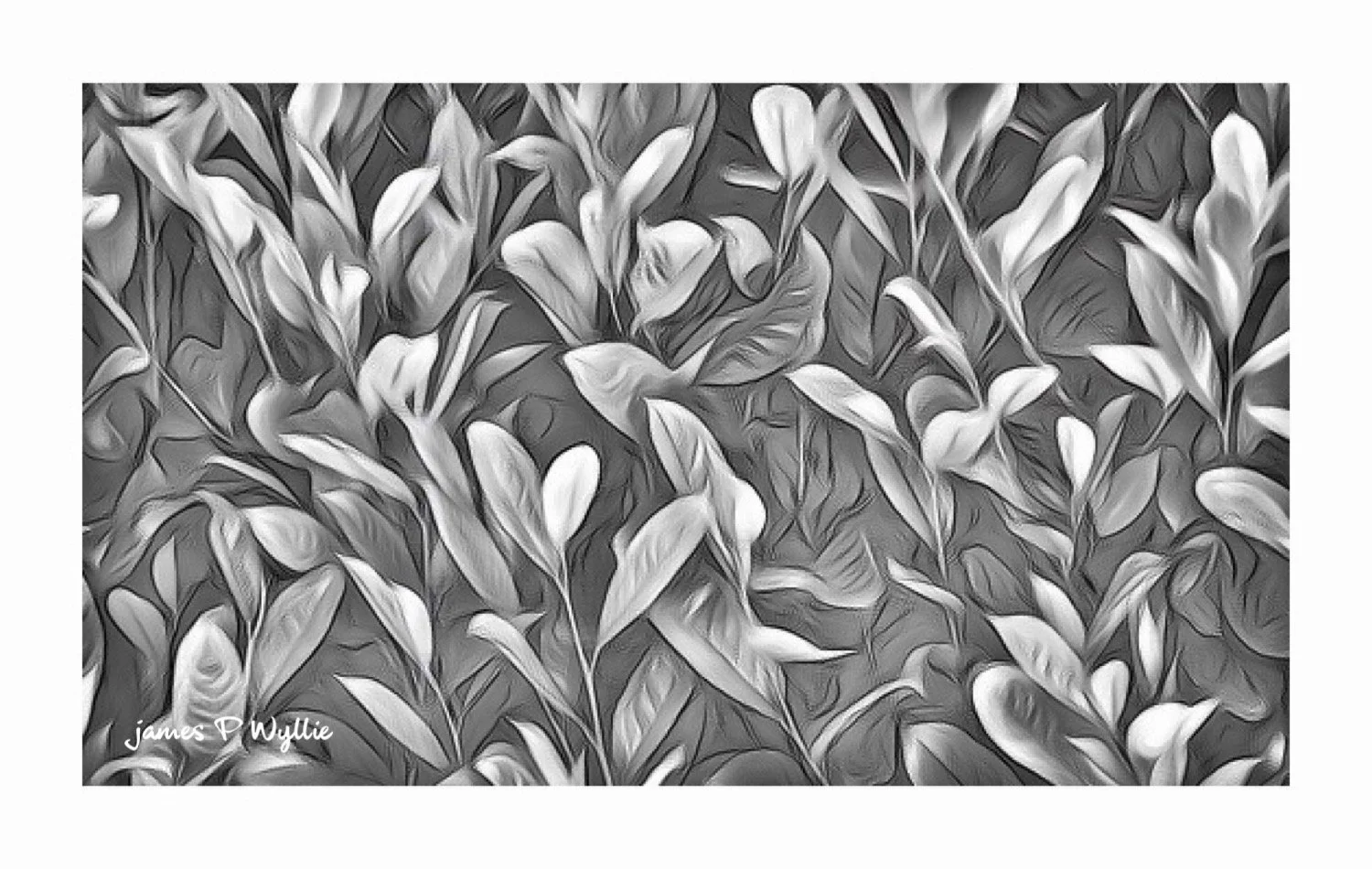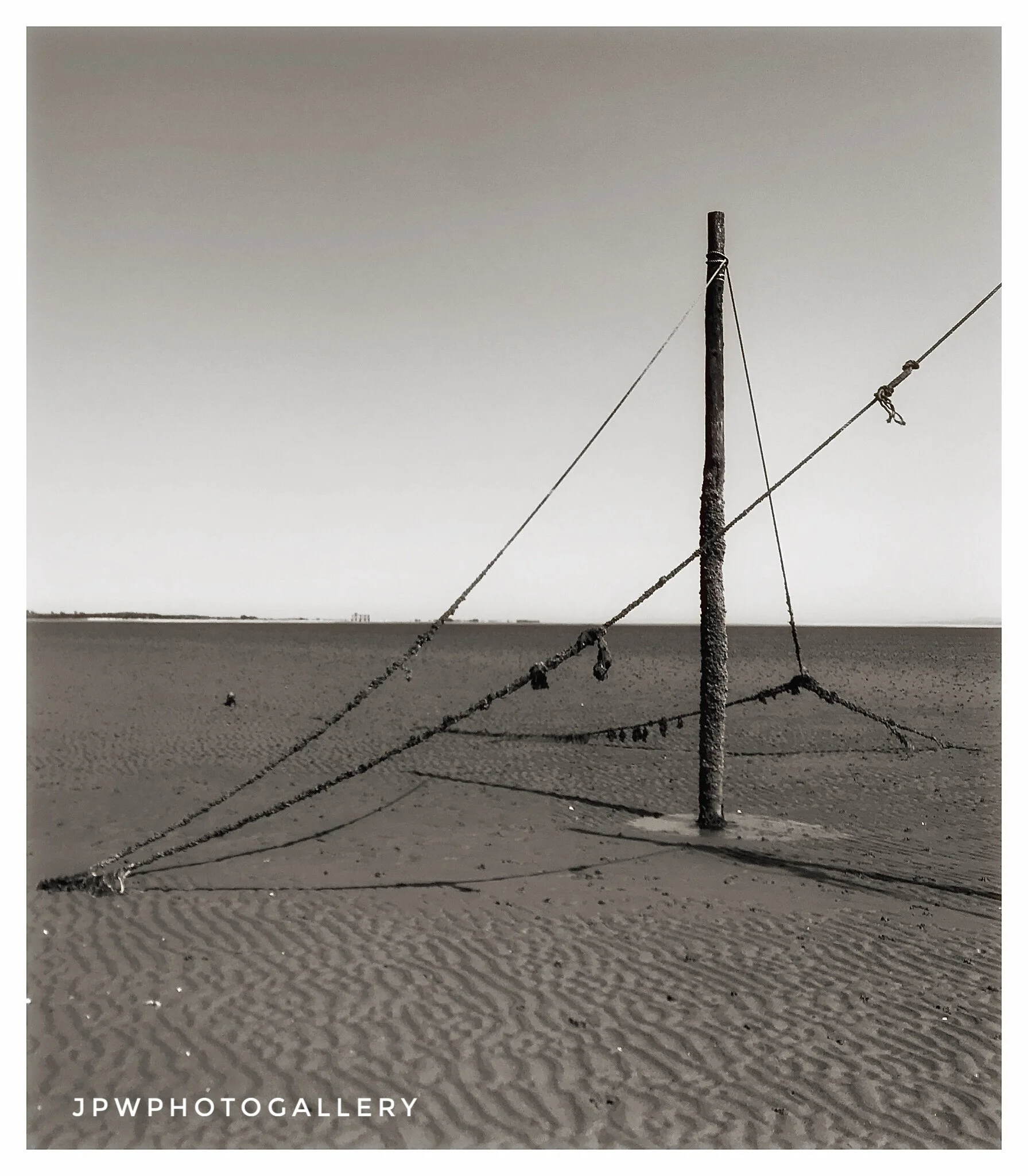 Black and white landscape photo of a lake with a line of wooden posts, surrounded by trees, with a cloudy sky and sunlight reflecting on the water, credited to James P Wyllie. View fullsize