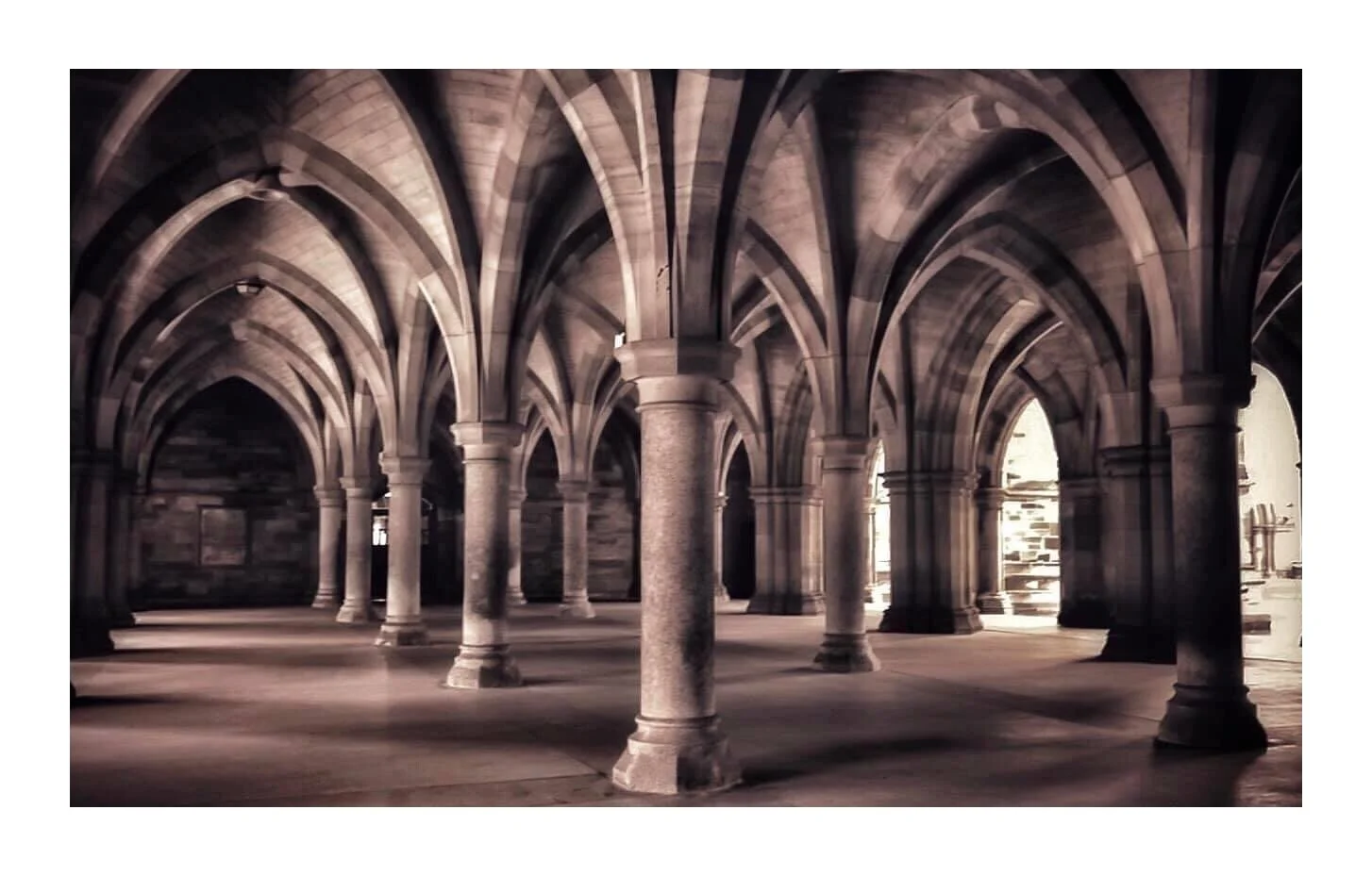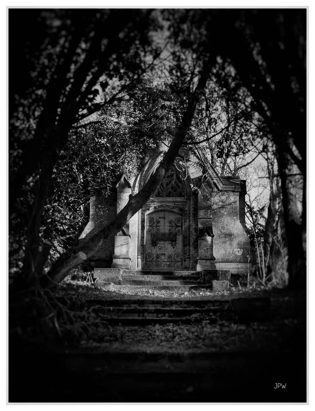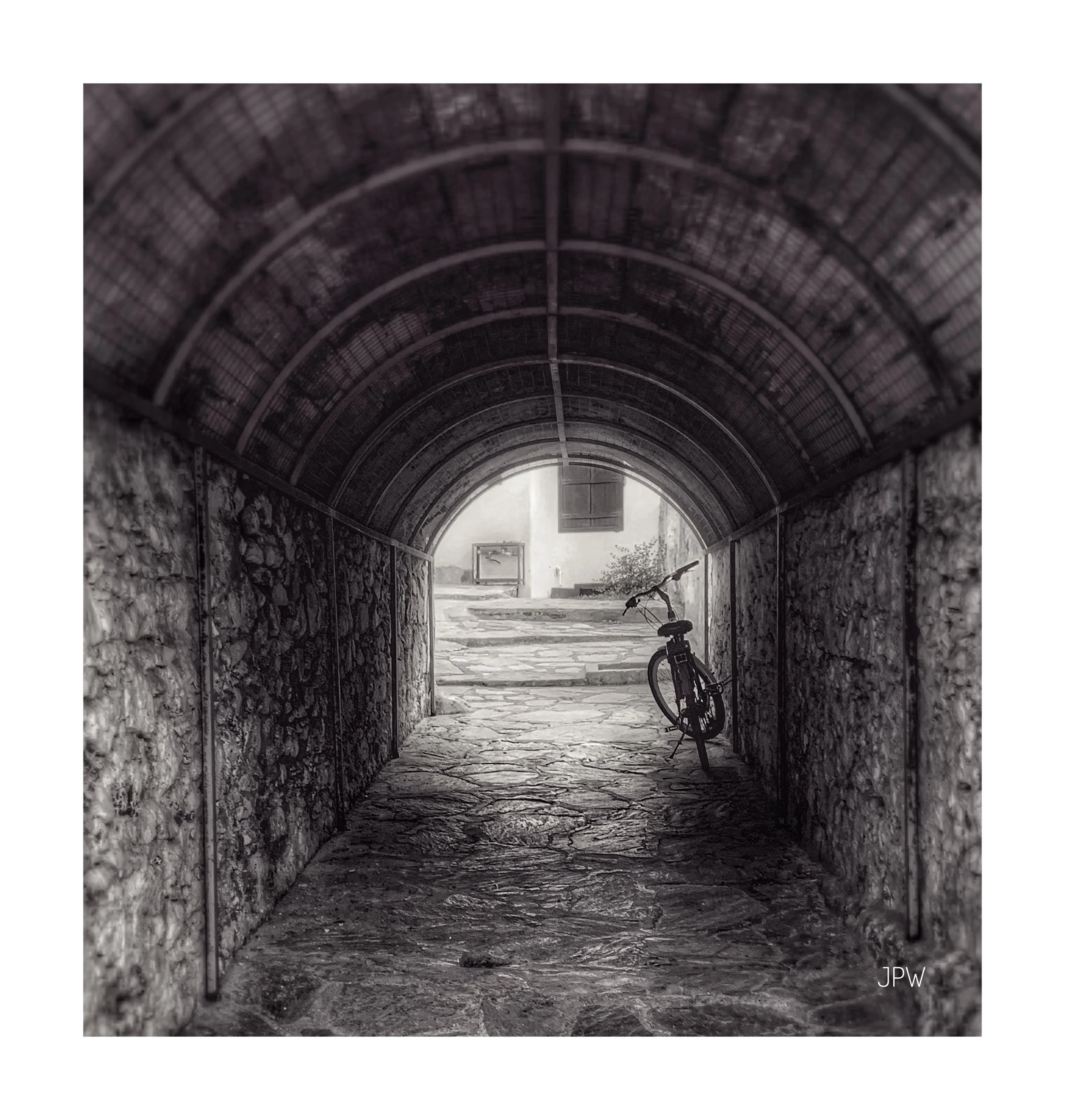 Black and white photo of a stone tunnel with a bicycle leaning against the right wall, leading to a bright outdoor area with steps and a small plant. View fullsize
