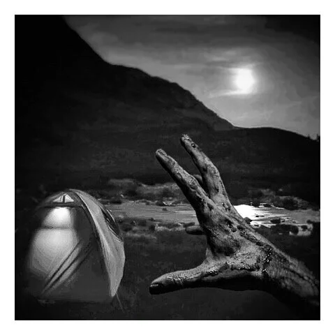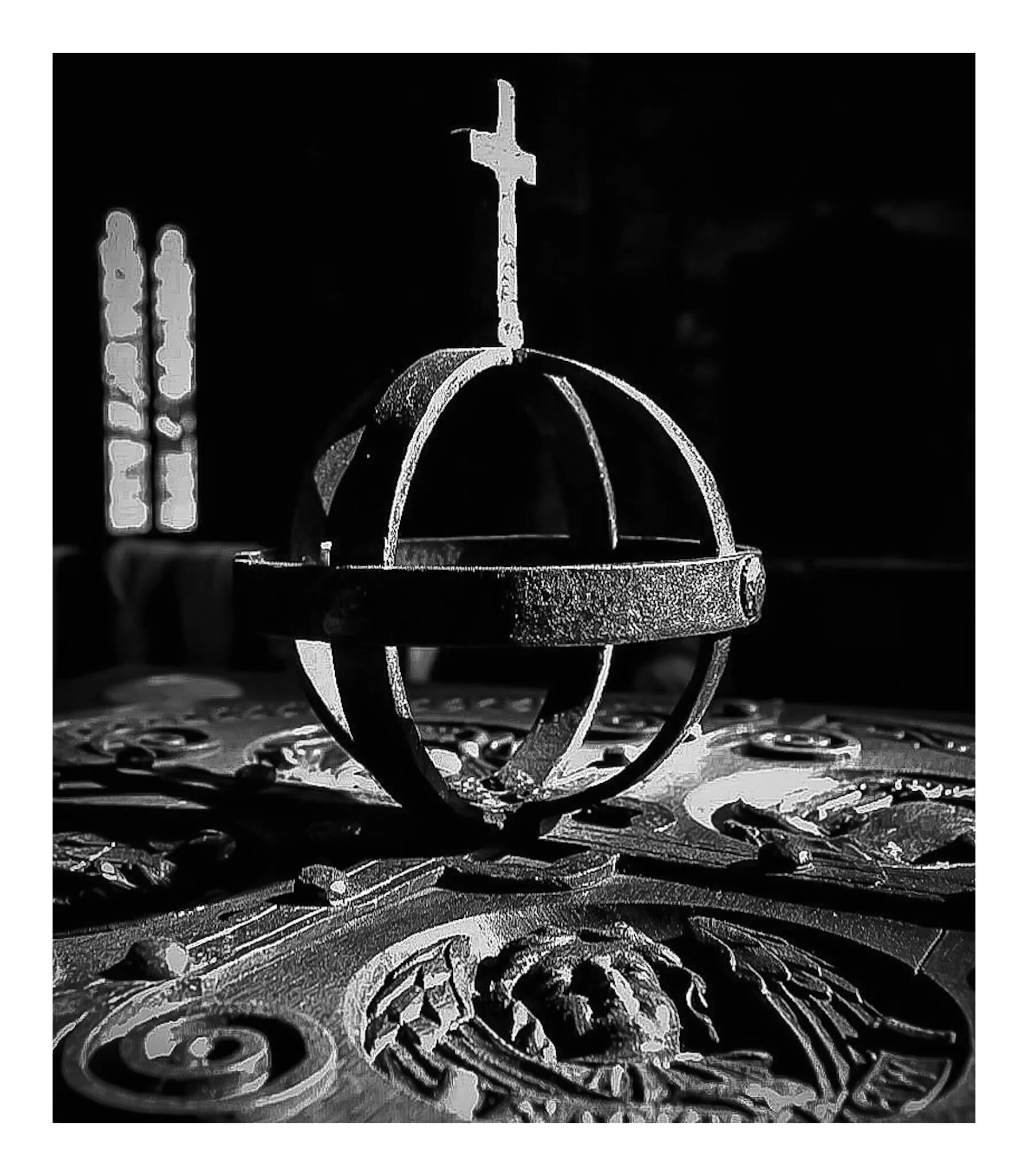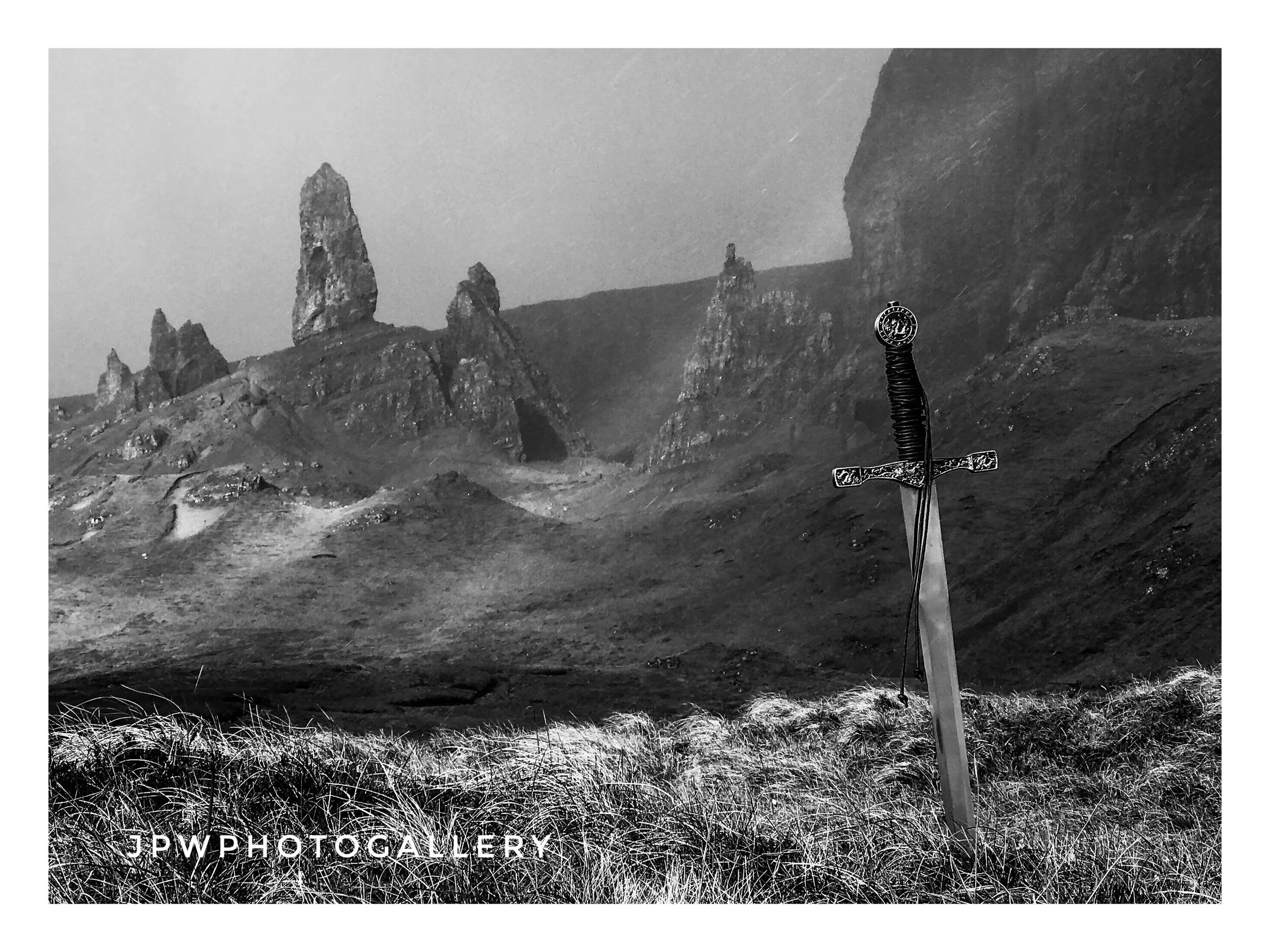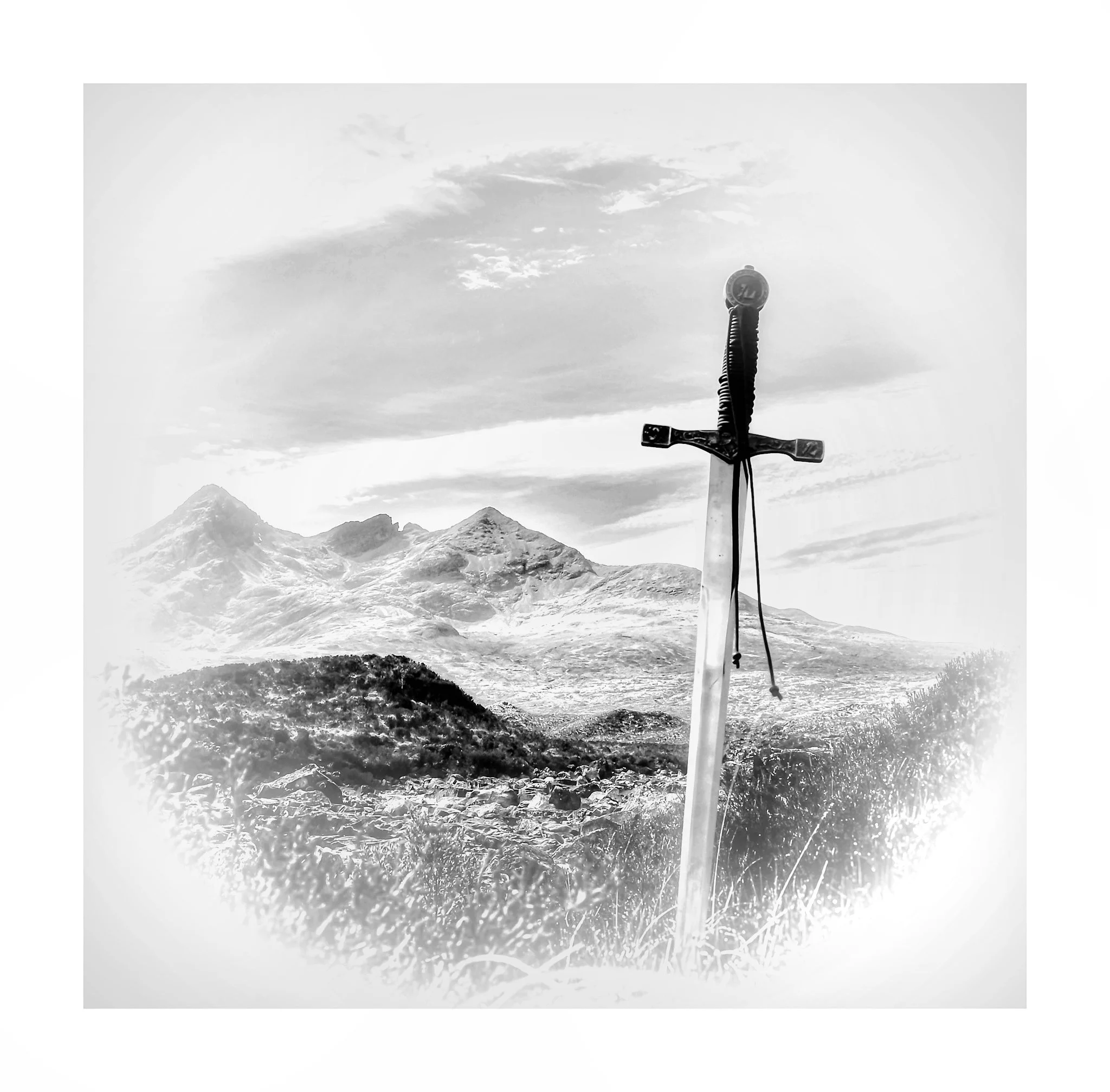 A sword planted in the ground with mountains in the background and a cloudy sky, in black and white. View fullsize