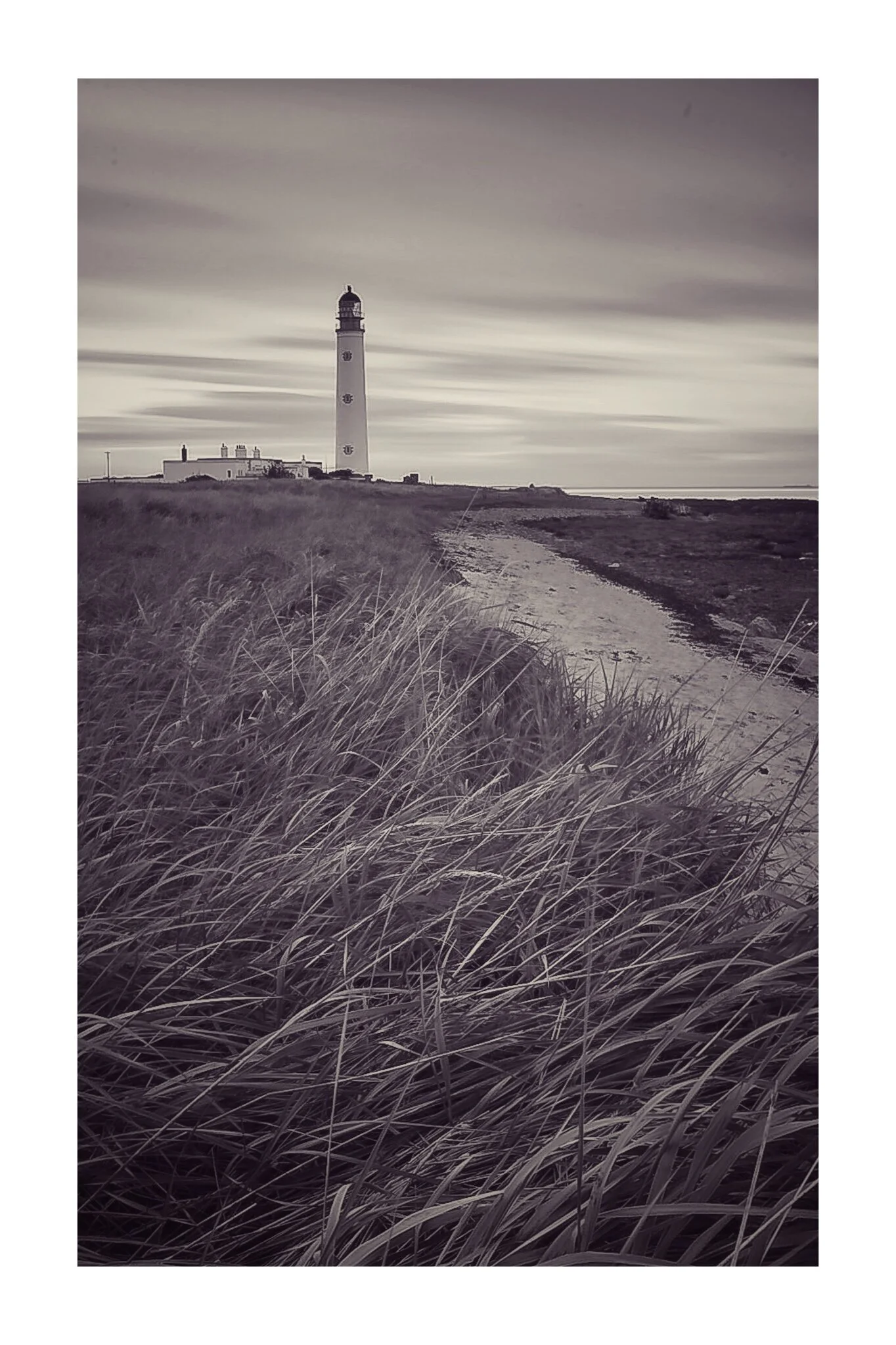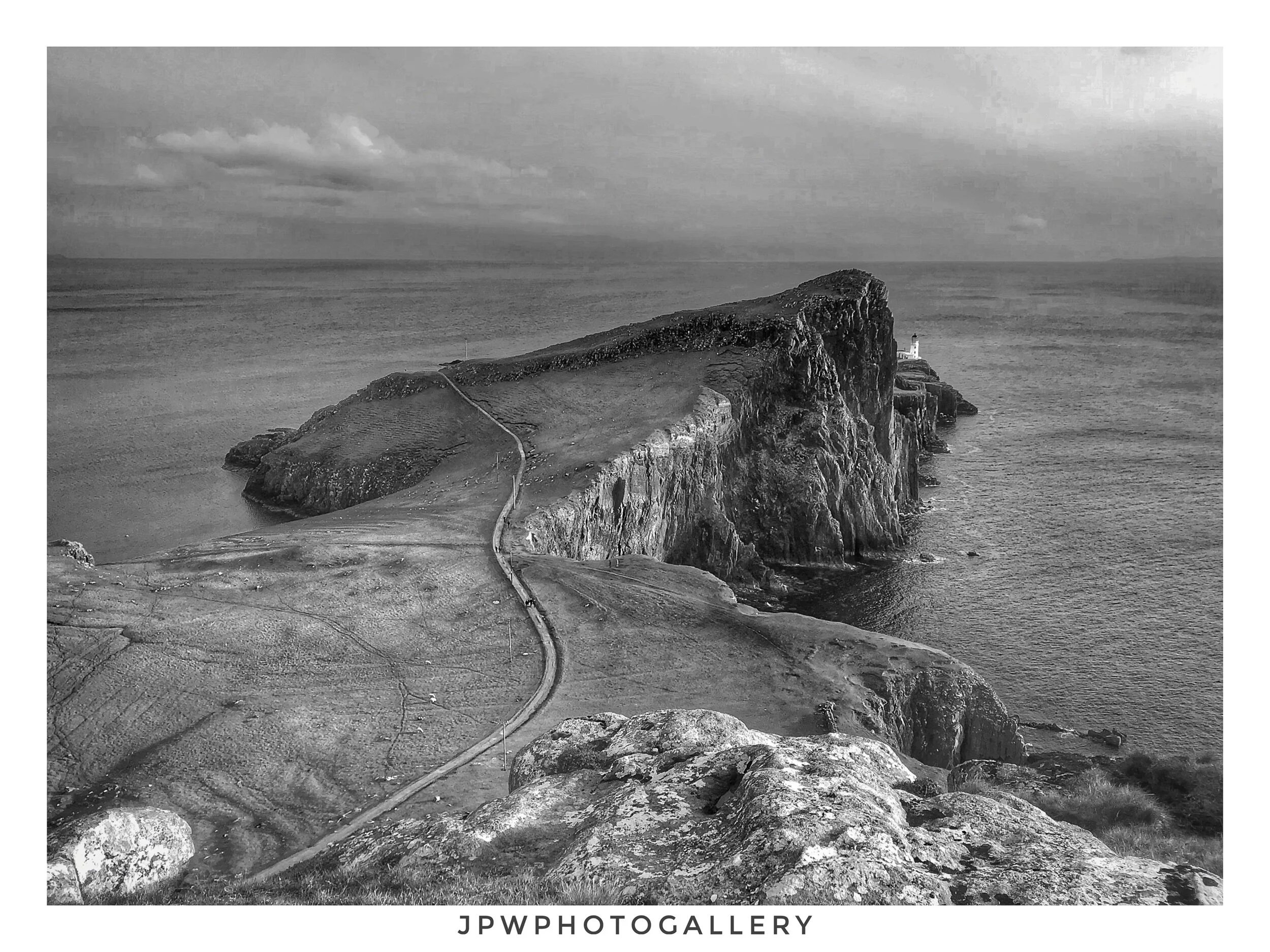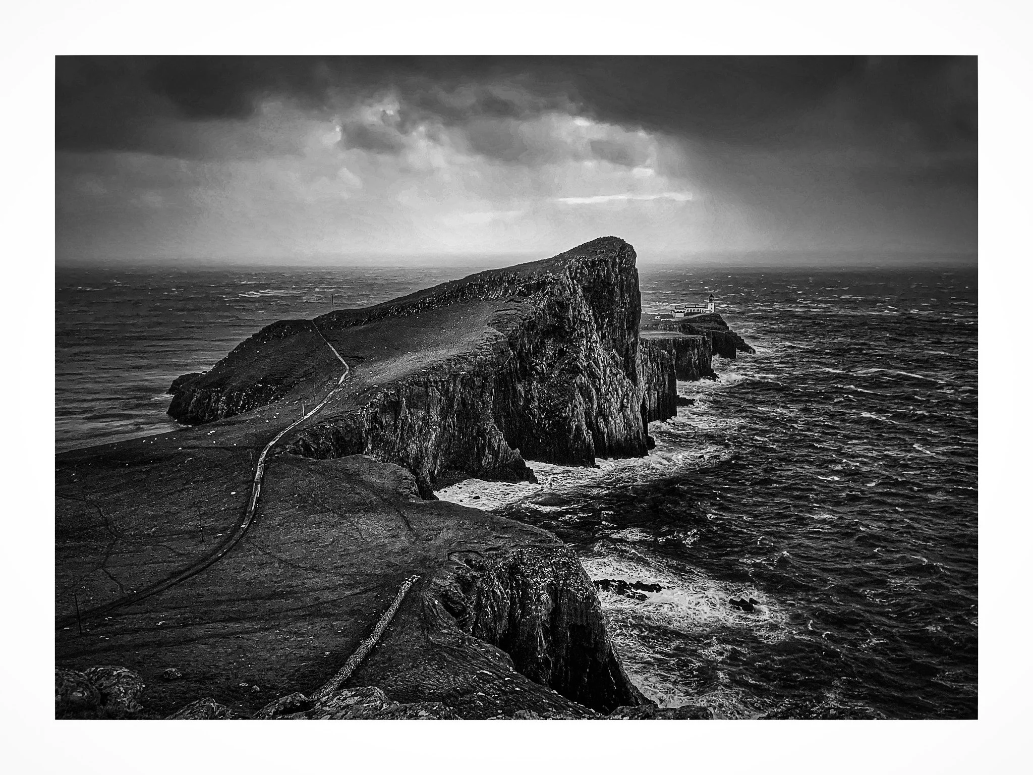 Black and white photo of a dramatic coastal scene with a large, rocky cliff jutting into the ocean. A path runs along the cliff's edge leading to a white lighthouse in the distance, under a moody, cloudy sky. View fullsize