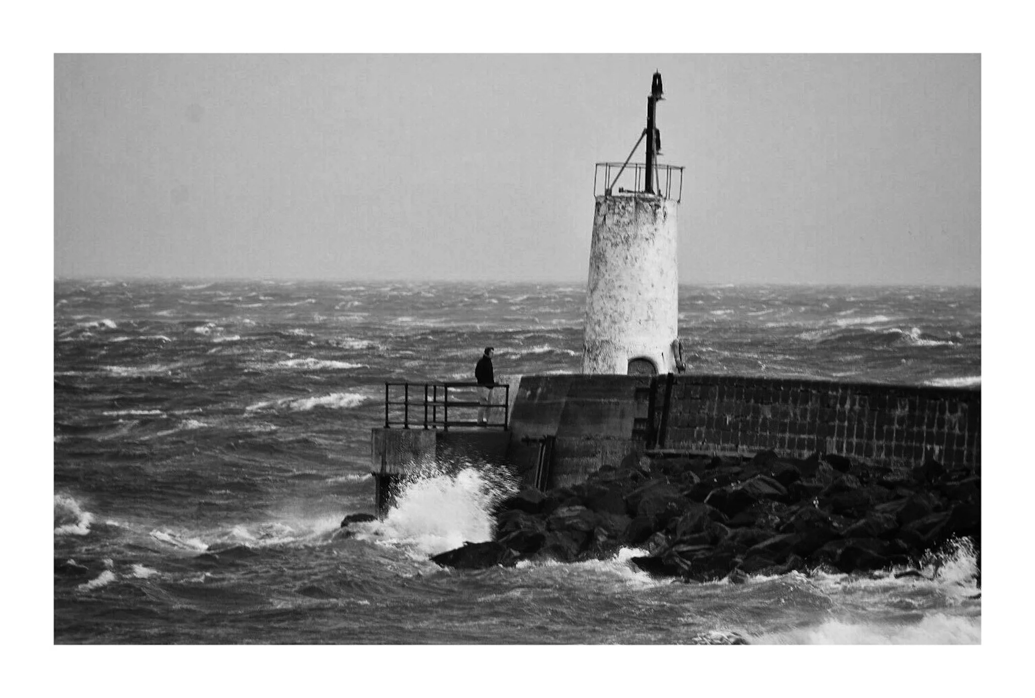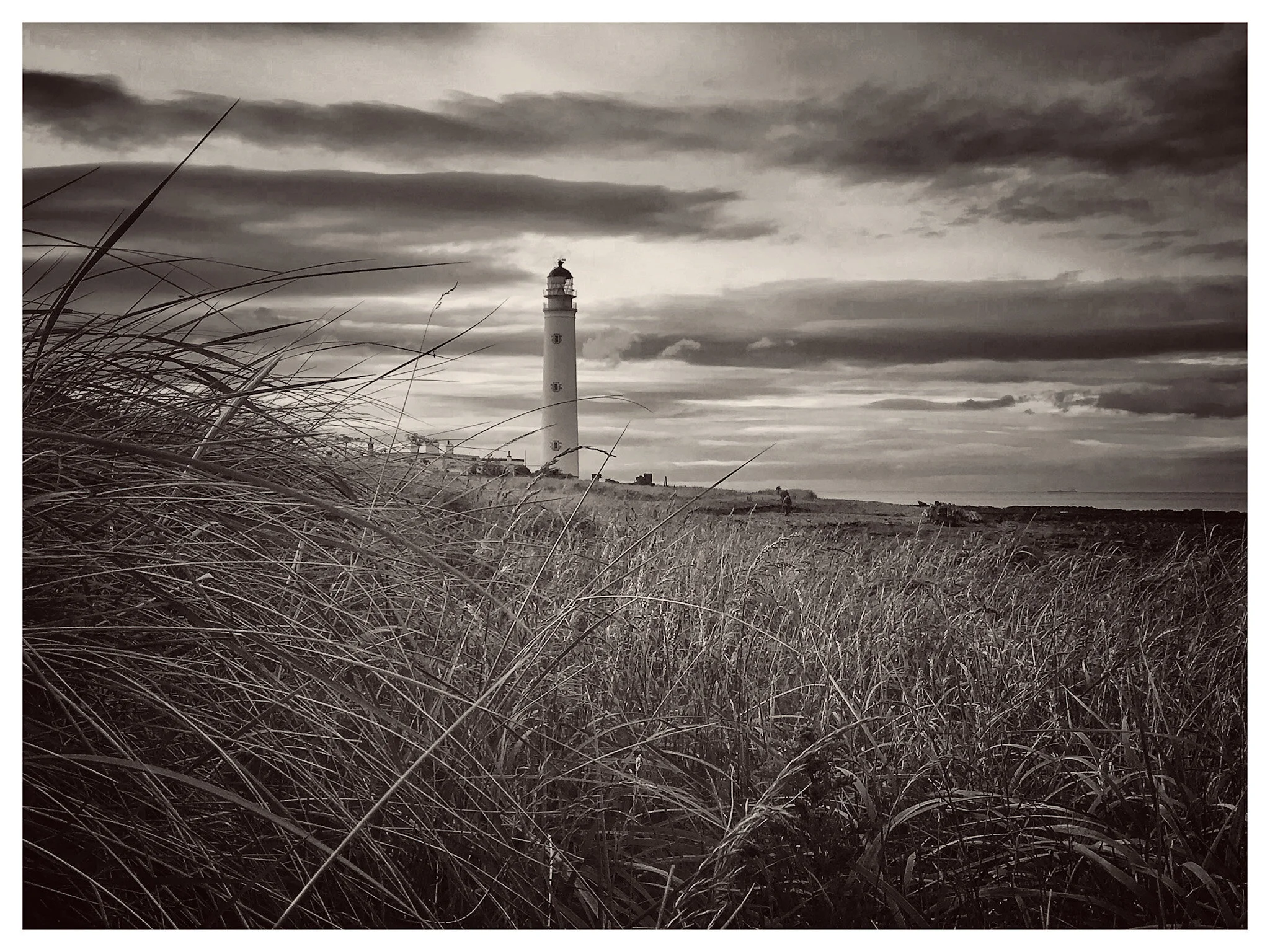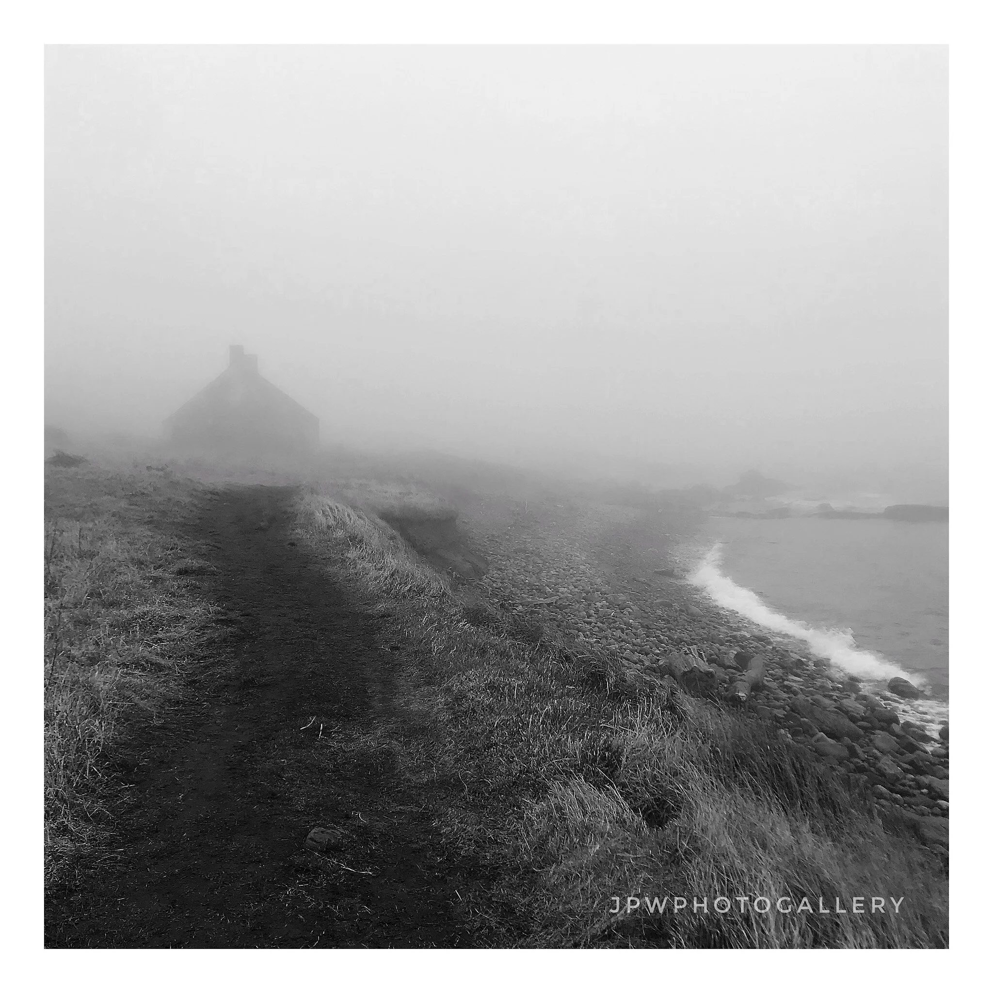 Black and white photo of a dramatic coastal scene with a large, rocky cliff jutting into the ocean. A path runs along the cliff's edge leading to a white lighthouse in the distance, under a moody, cloudy sky. View fullsize