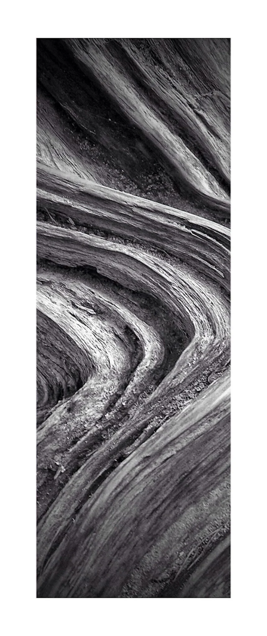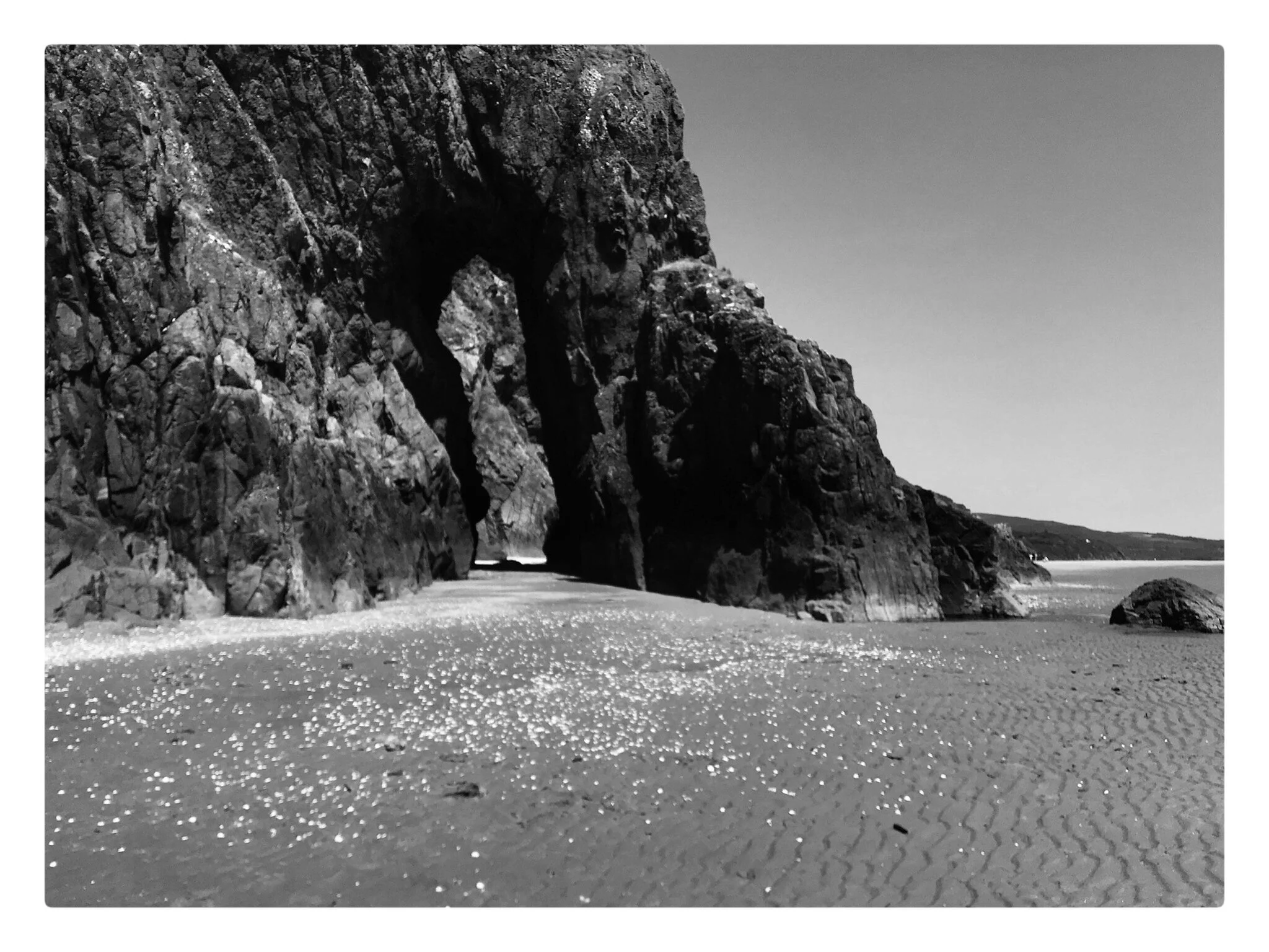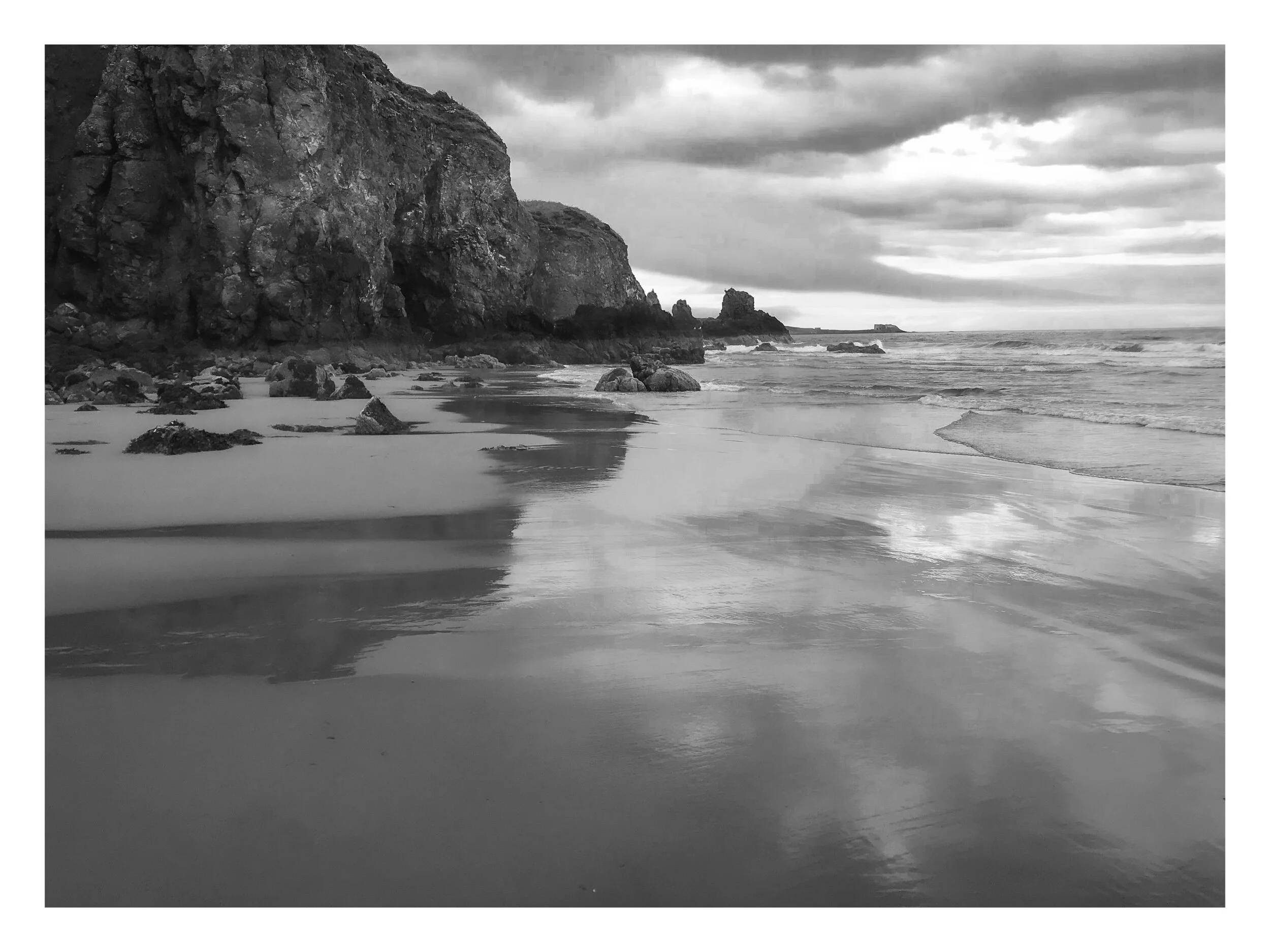 Black and white photo of a large, tilted rocky seafloor formation with smaller rocks nearby and a cloudy sky in the background. View fullsize