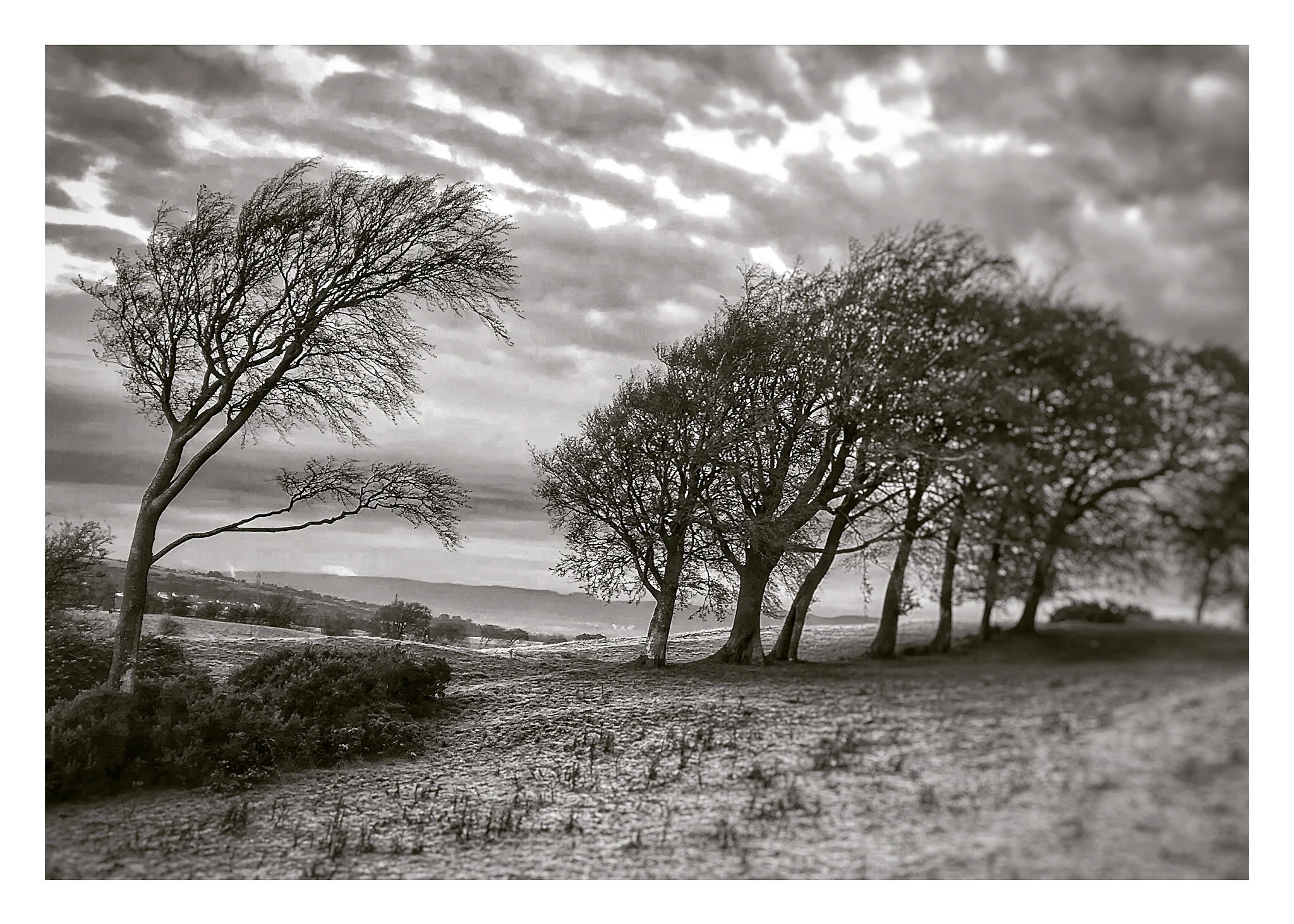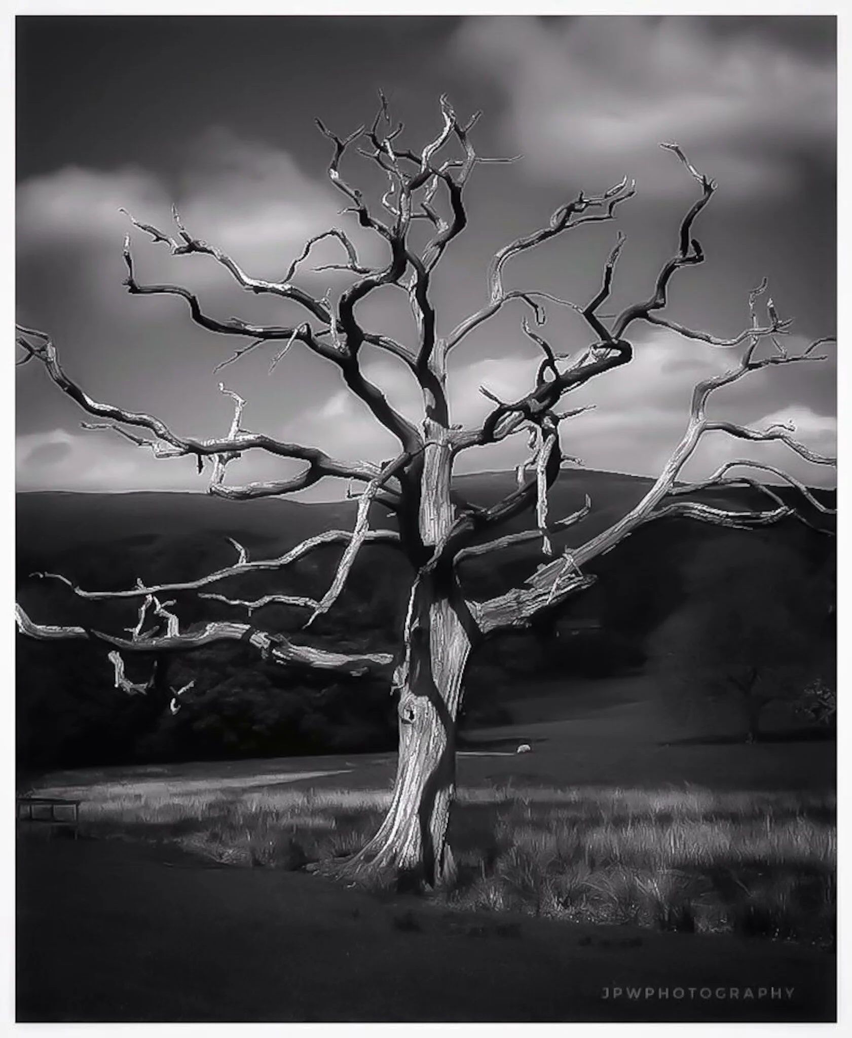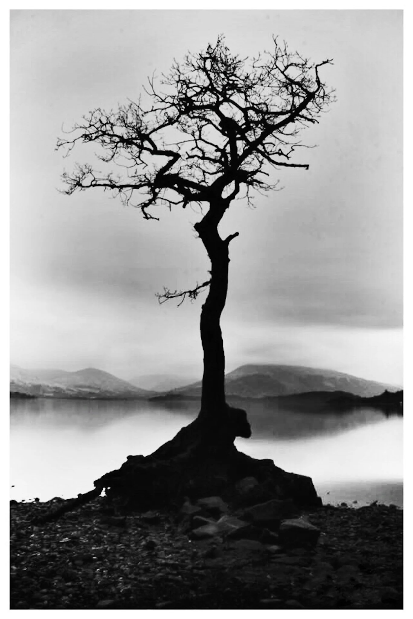 Black and white photograph of a barren tree leaning to the left in front of a stone wall with a cross-shaped stick nearby. Rolling hills and fields extend into the distance under a cloudy sky. View fullsize