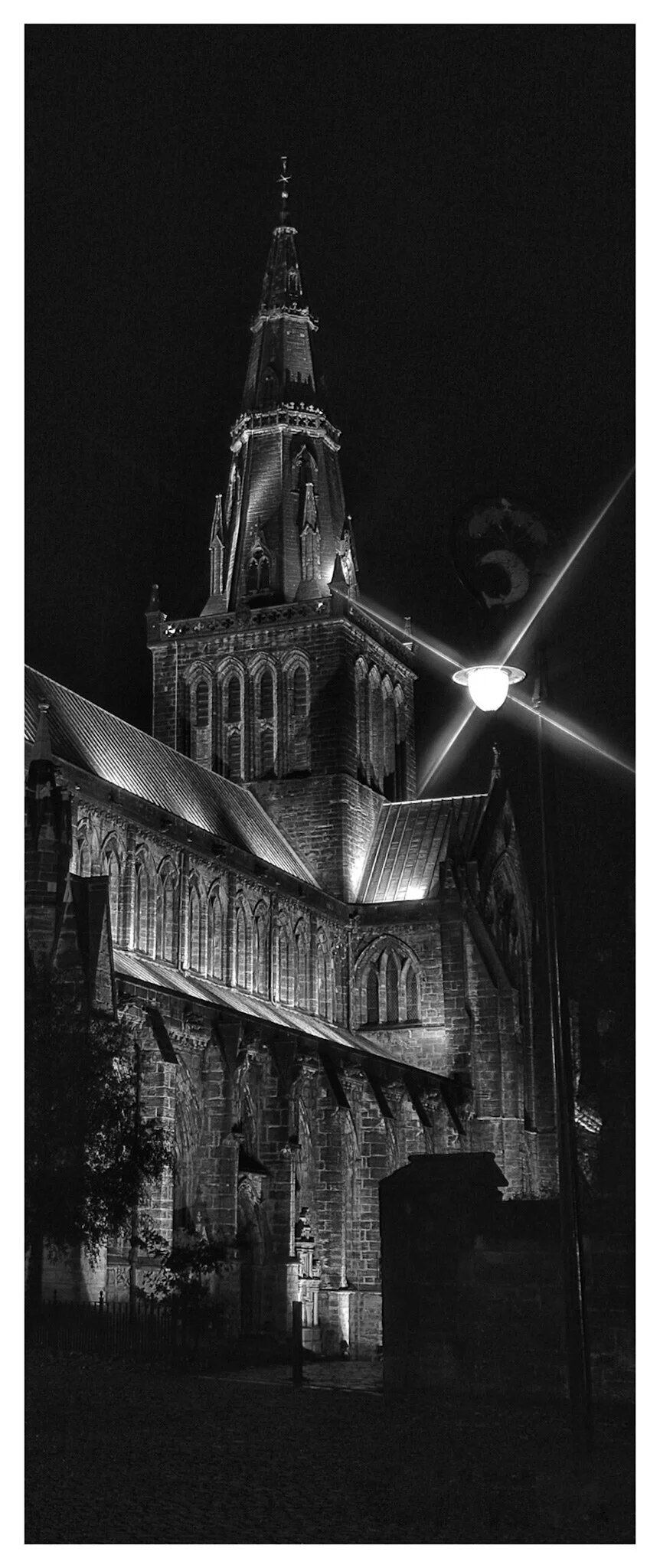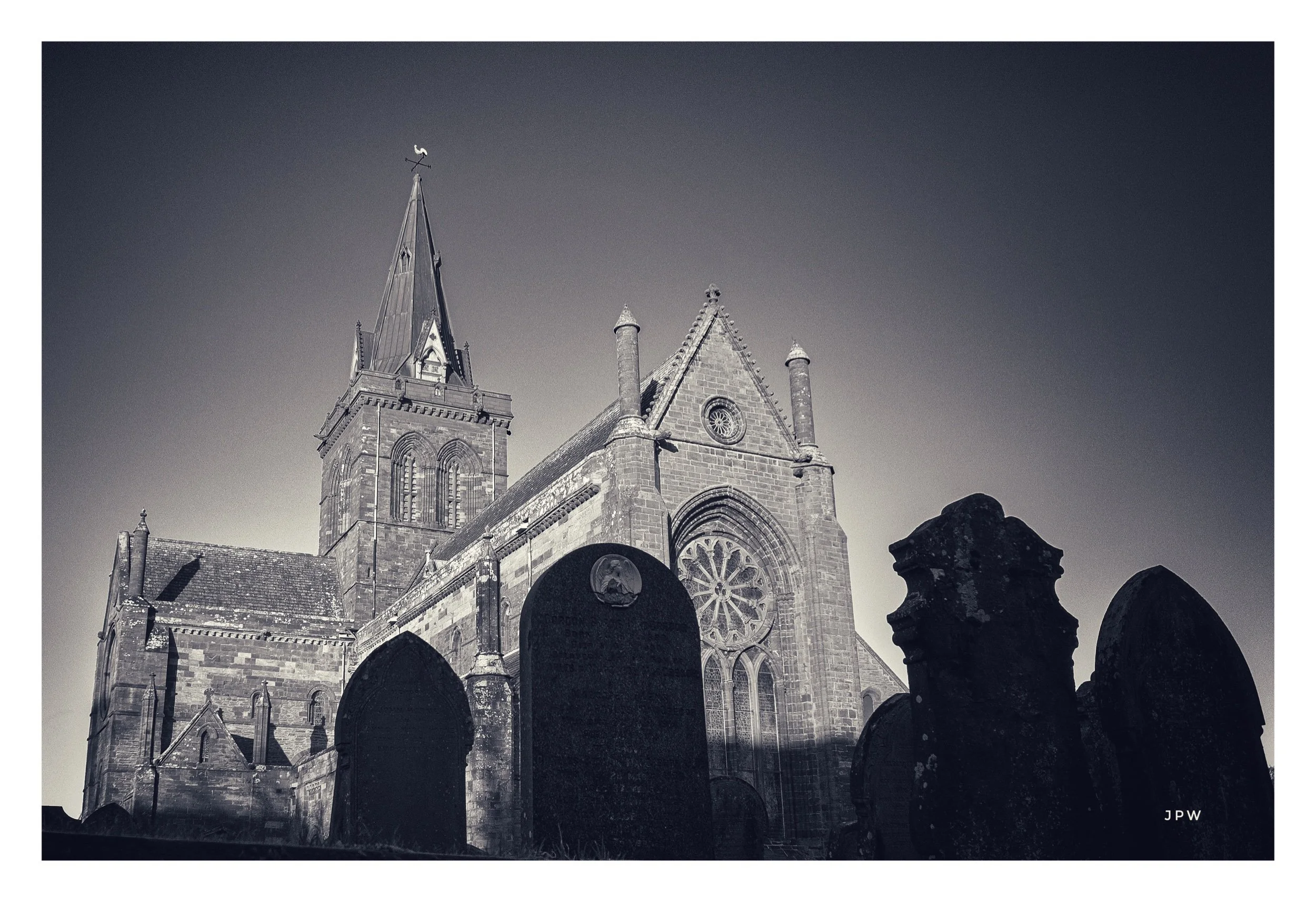 Black and white photo of an old stone church with a tall steeple, surrounded by graveyard headstones. View fullsize