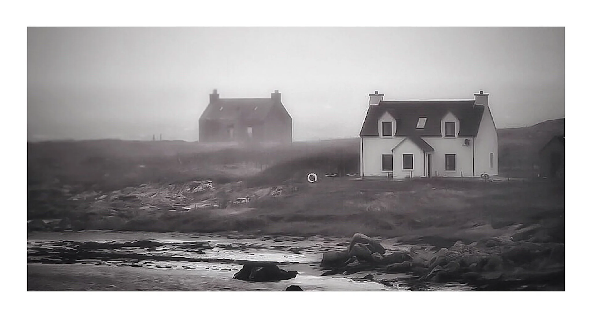 A black and white photograph of a stone cottage with a tiled roof, situated on a rocky landscape with mountains in the background. View fullsize