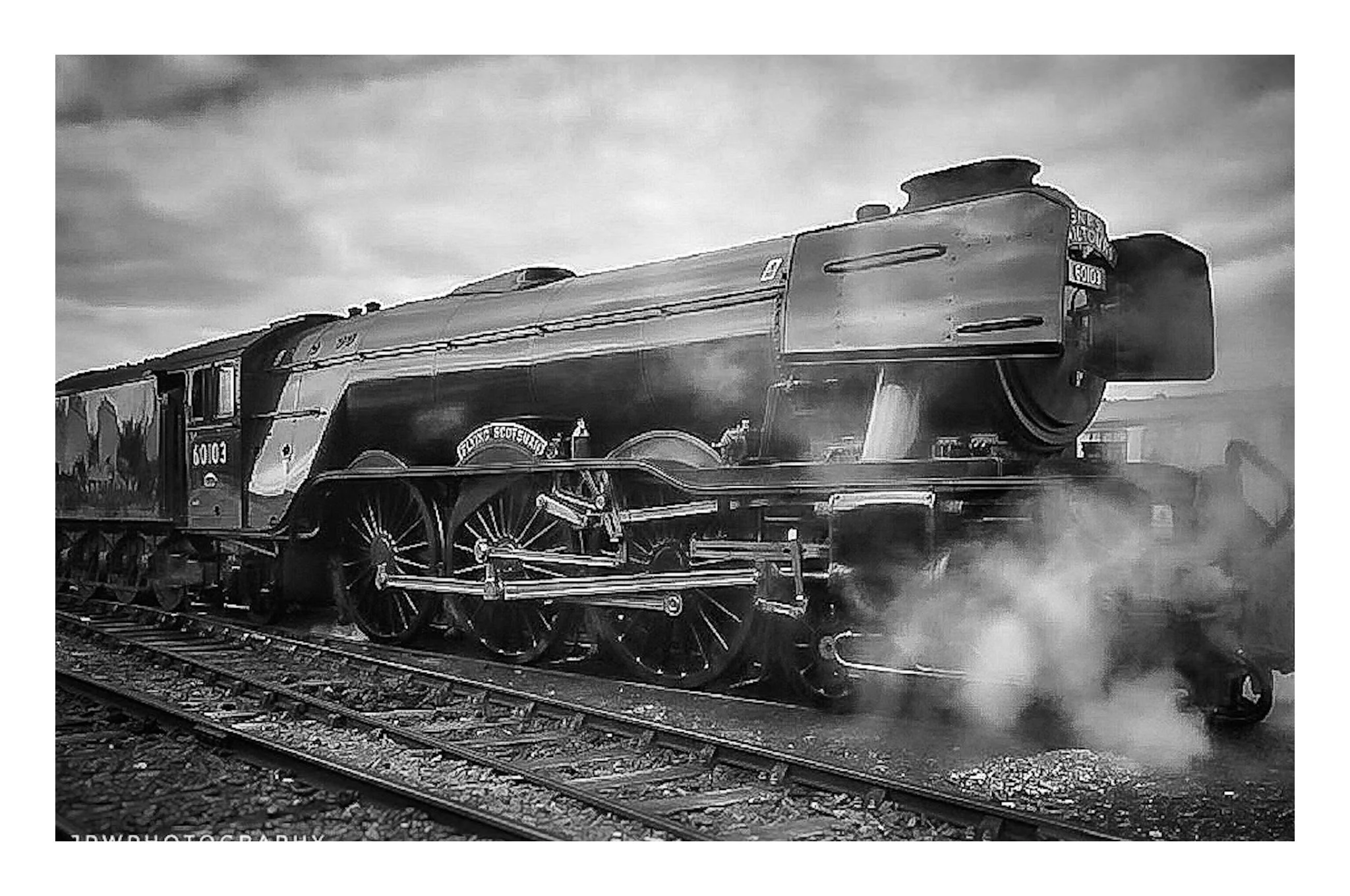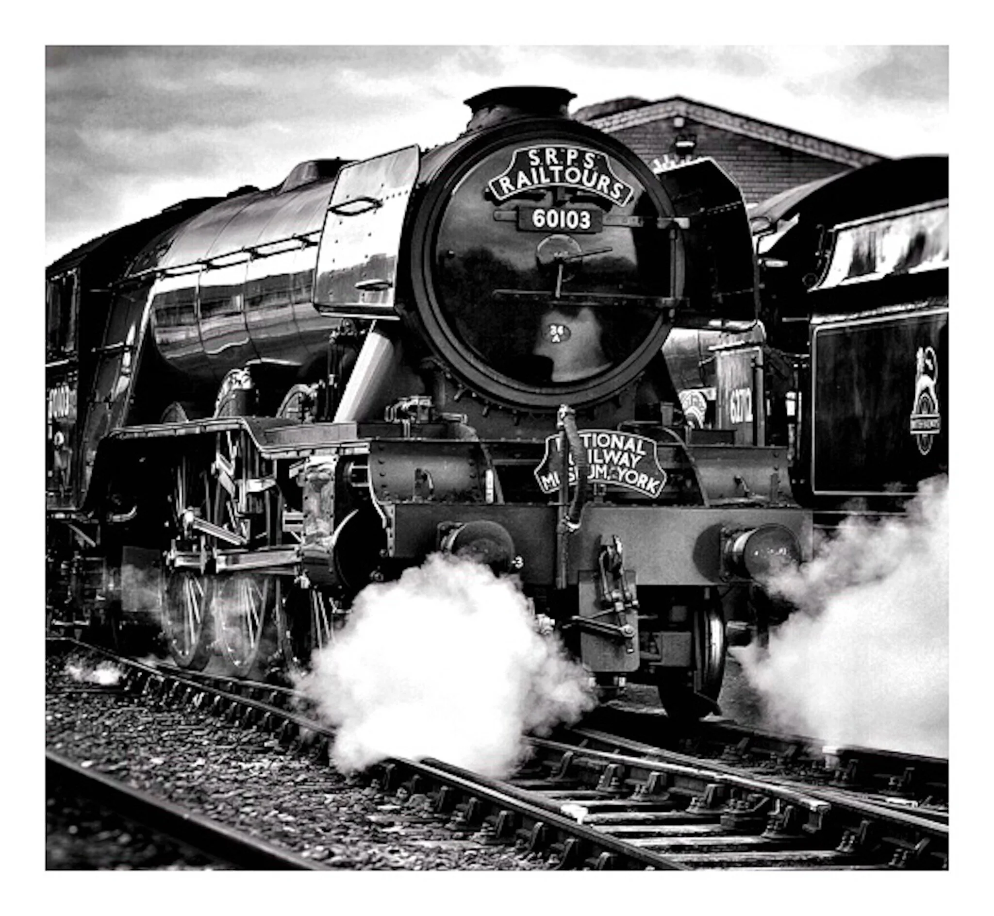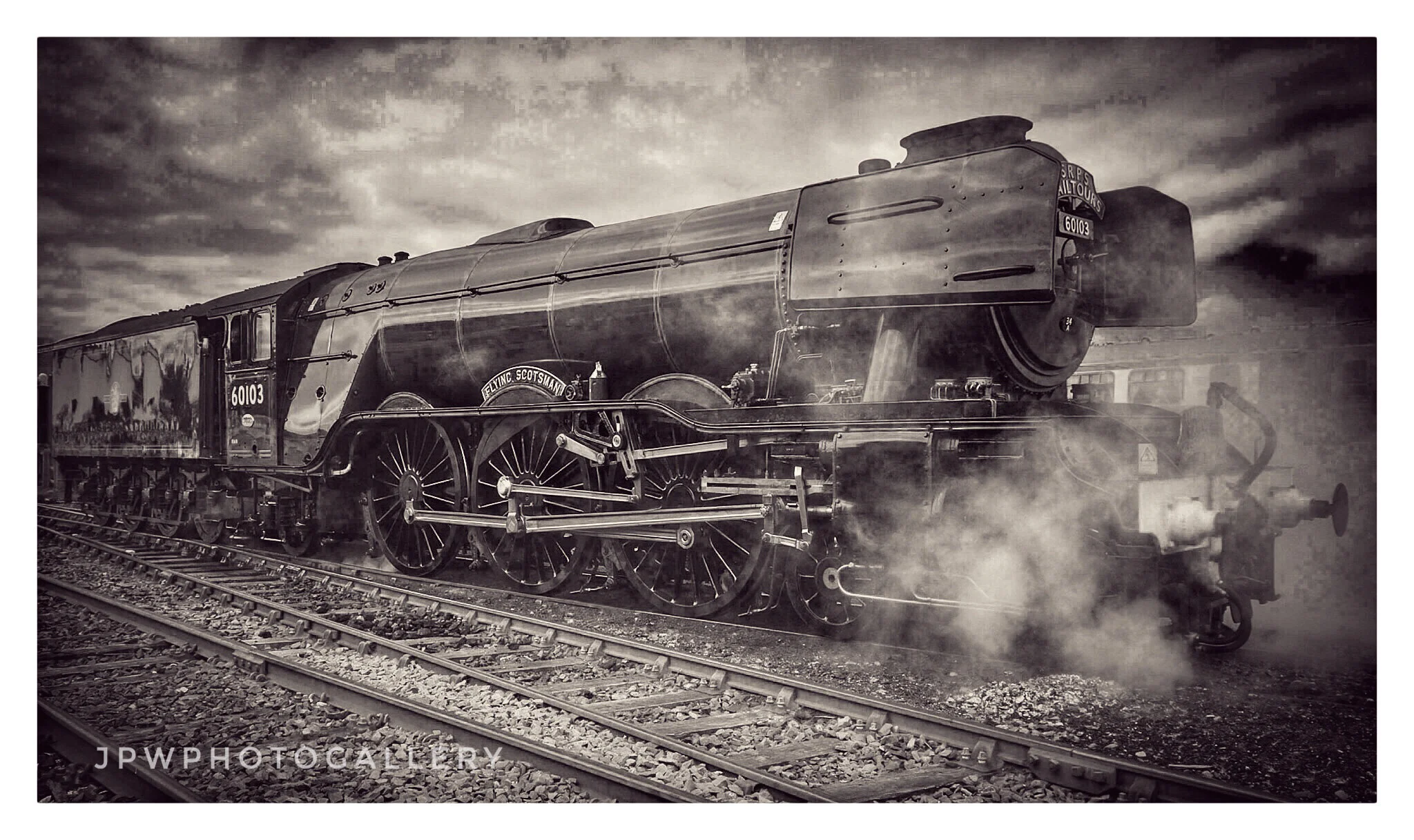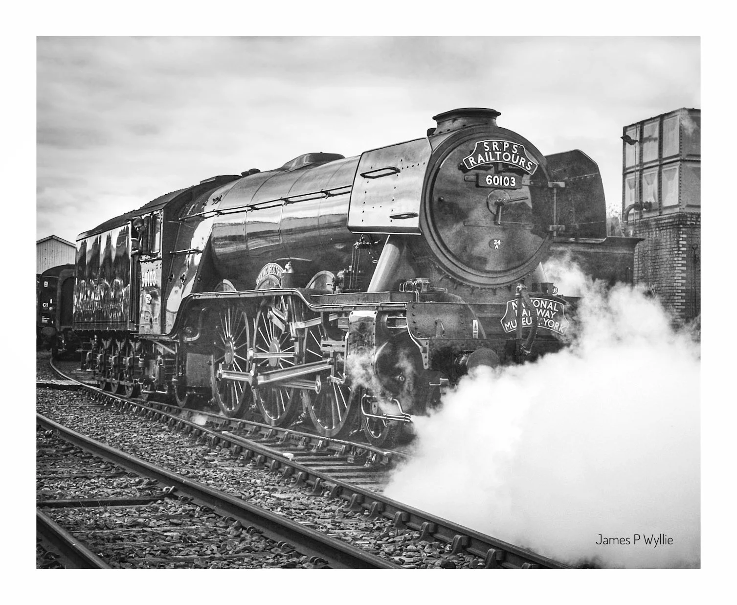 Black and white photograph of a vintage steam locomotive train labeled "SRPS Rail Tours" and numbered 60103, traveling on tracks with steam billowing from its sides. A building is visible in the background, and the name "James P Wyllie" is printed in View fullsize