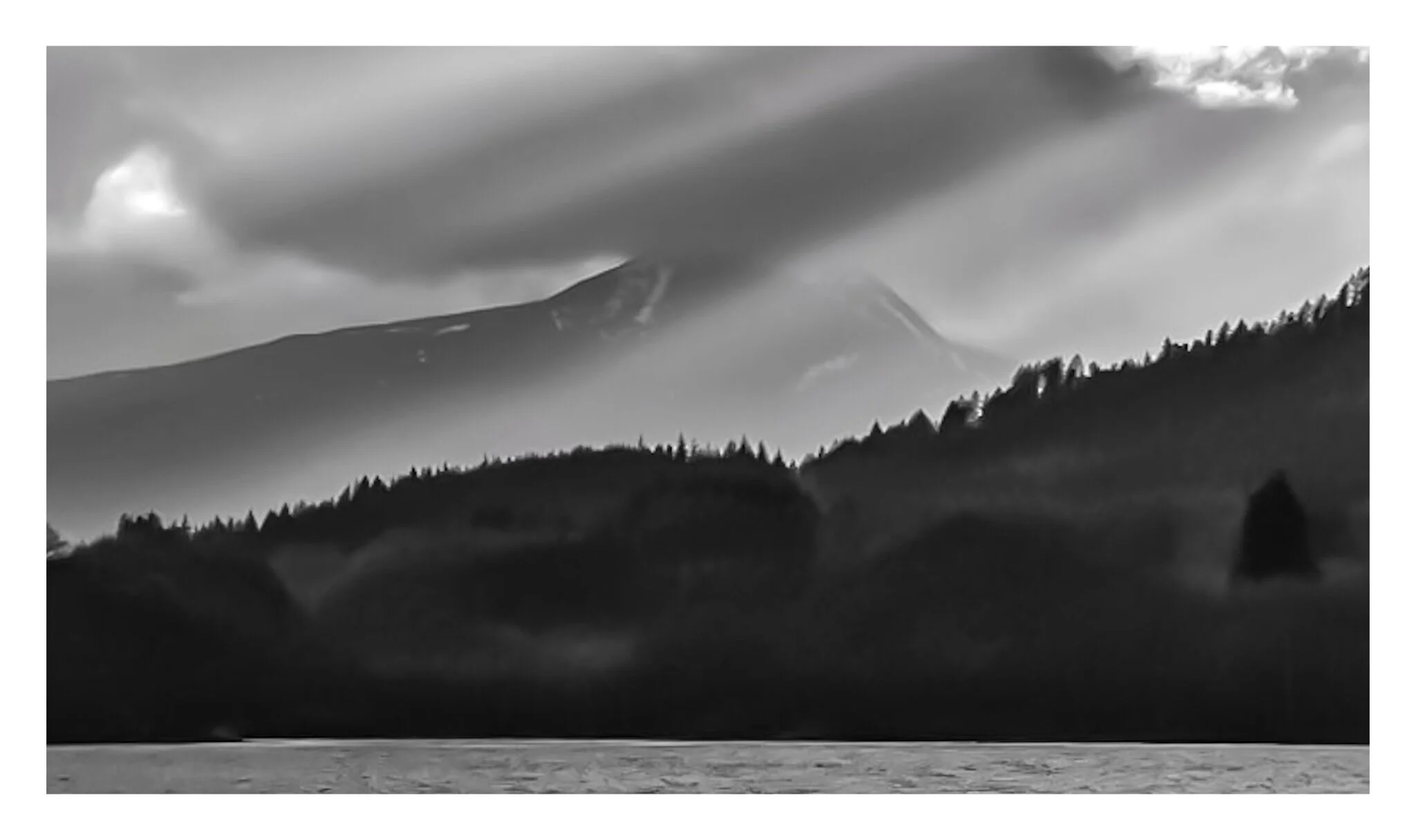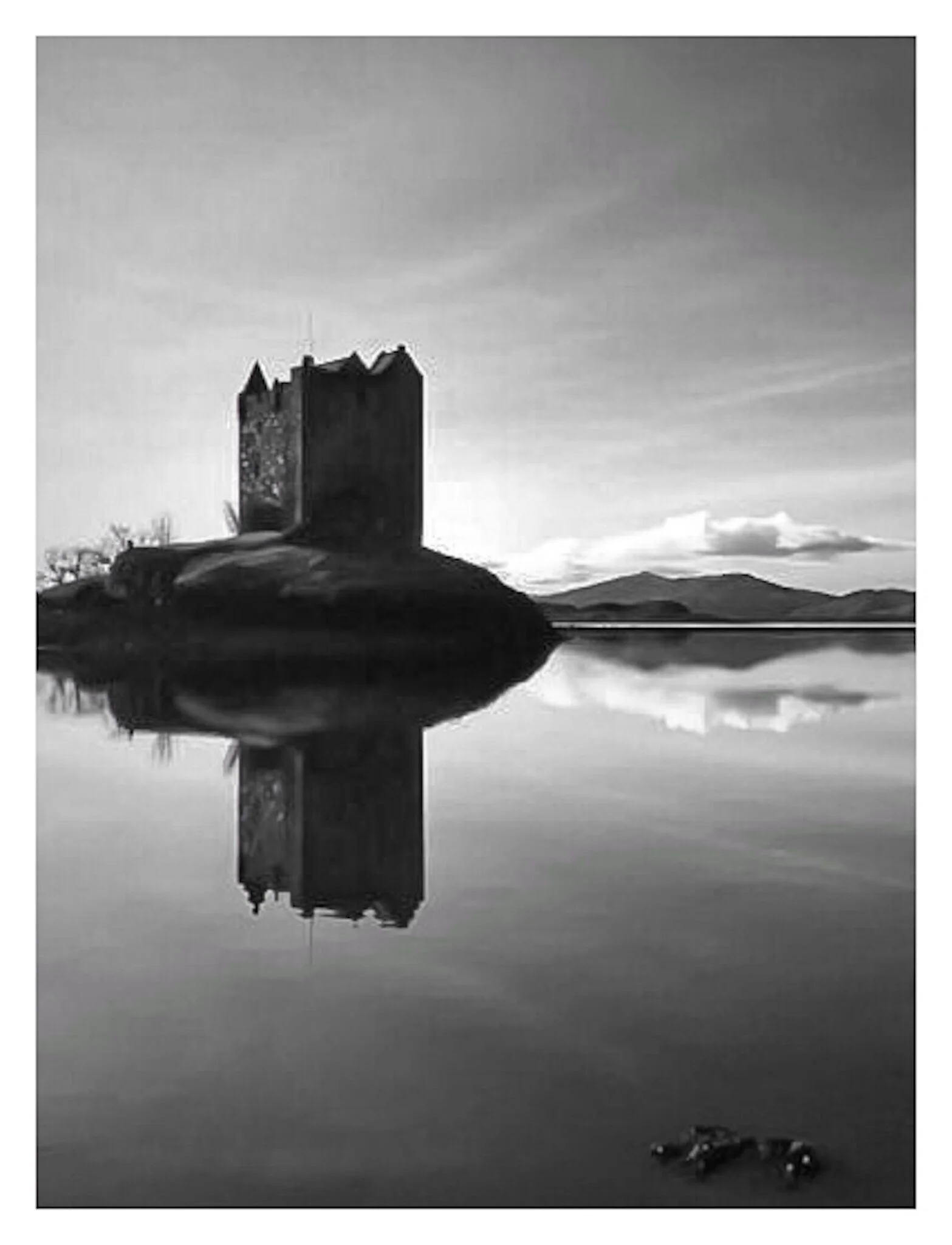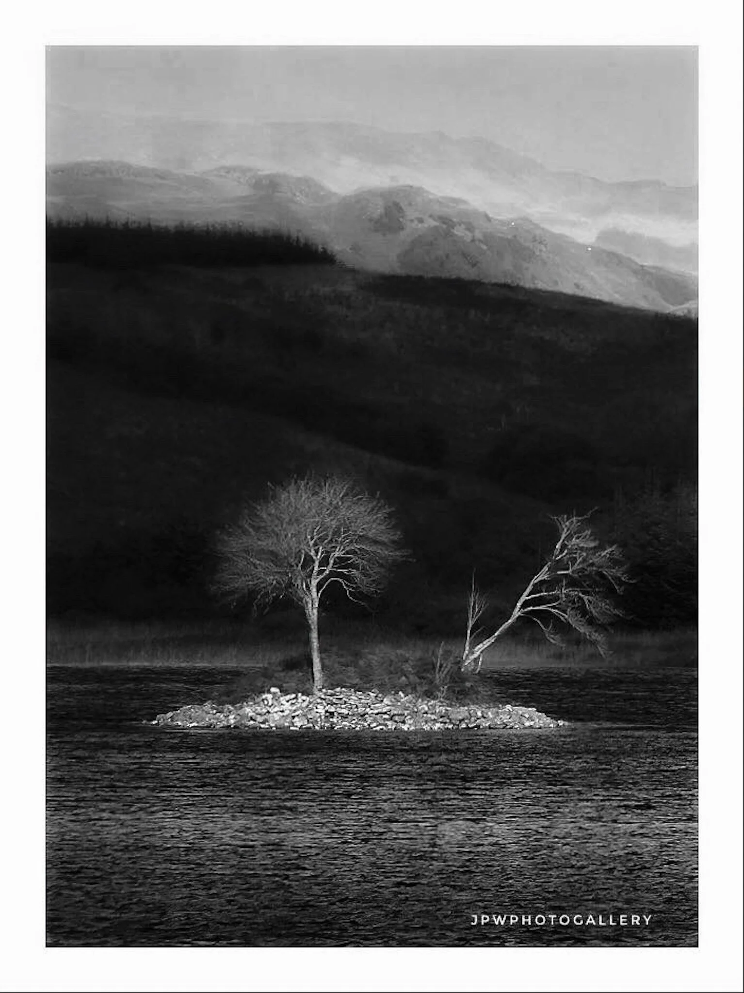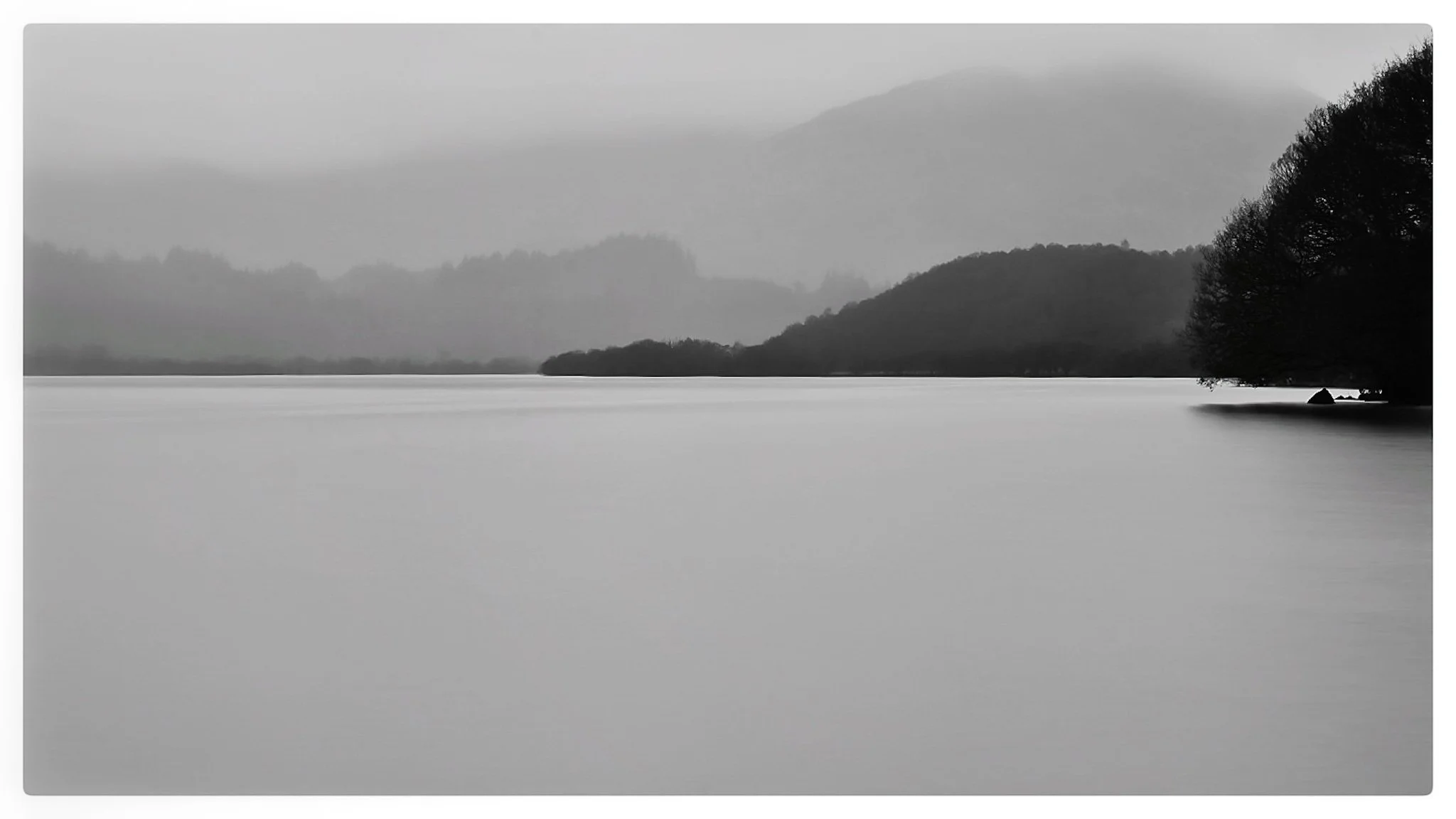 Black and white photo of a calm lake with tree-covered islands and distant mountains, tranquil and misty atmosphere. View fullsize
