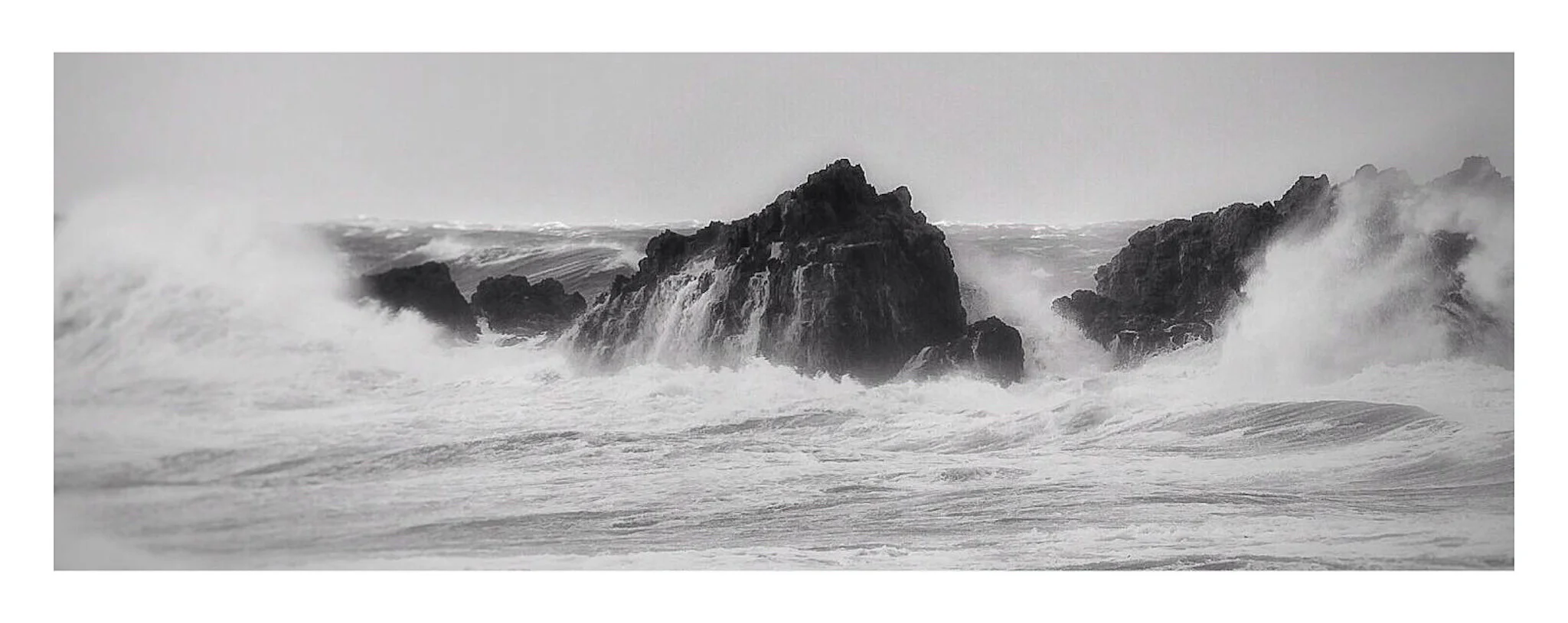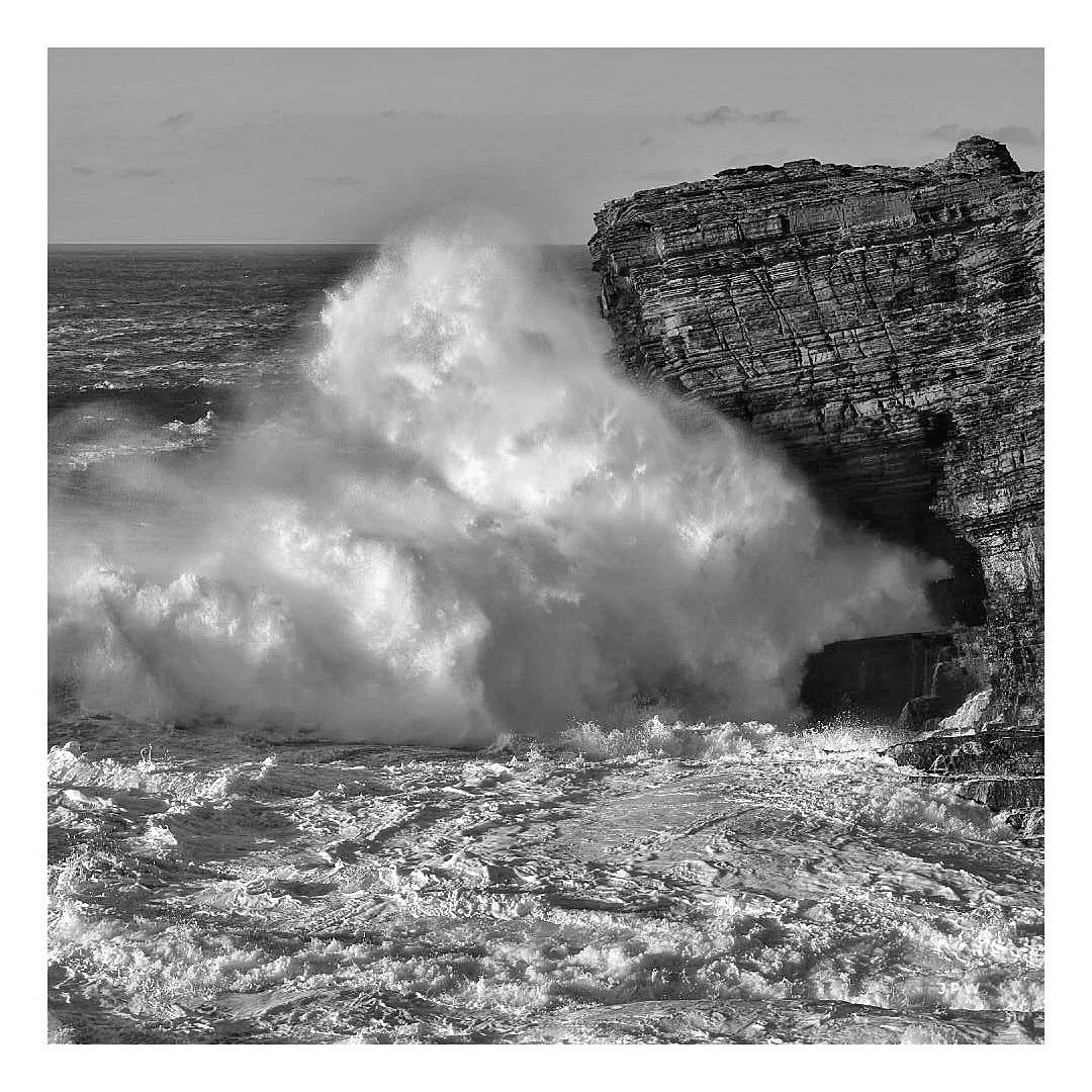Black and white photo of a large ocean wave crashing against a rocky cliff. View fullsize