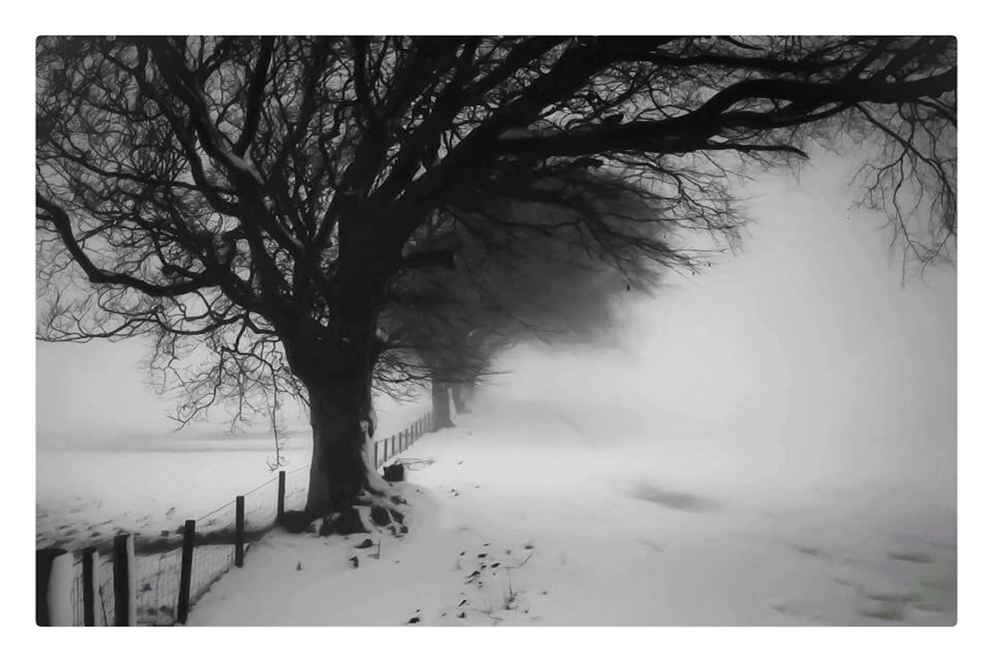 A snowy mountain landscape with a rustic white house and trees, black and white photograph. View fullsize