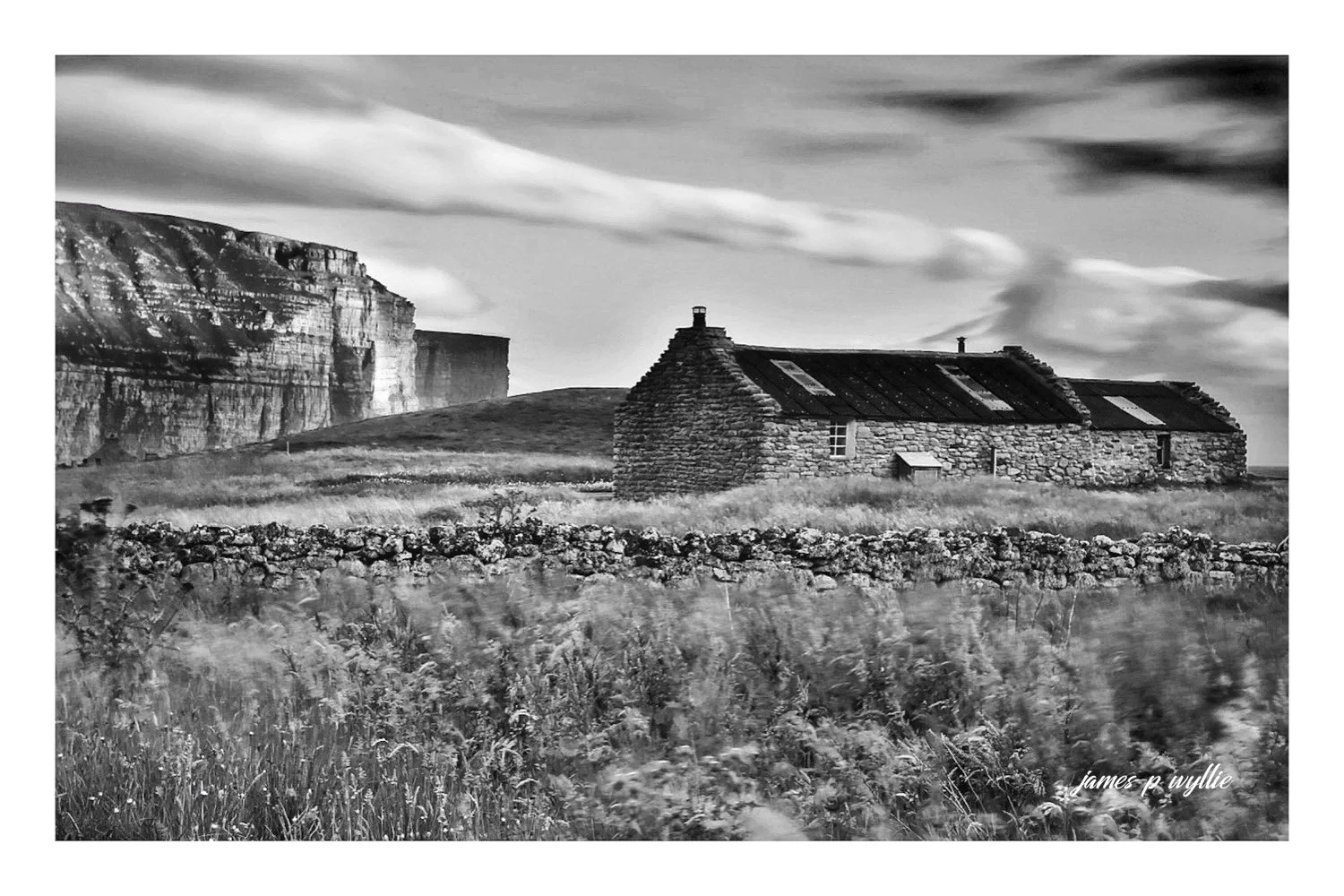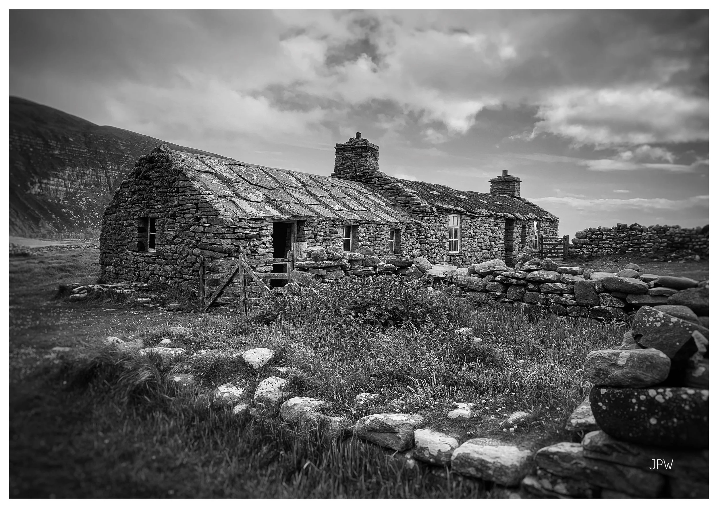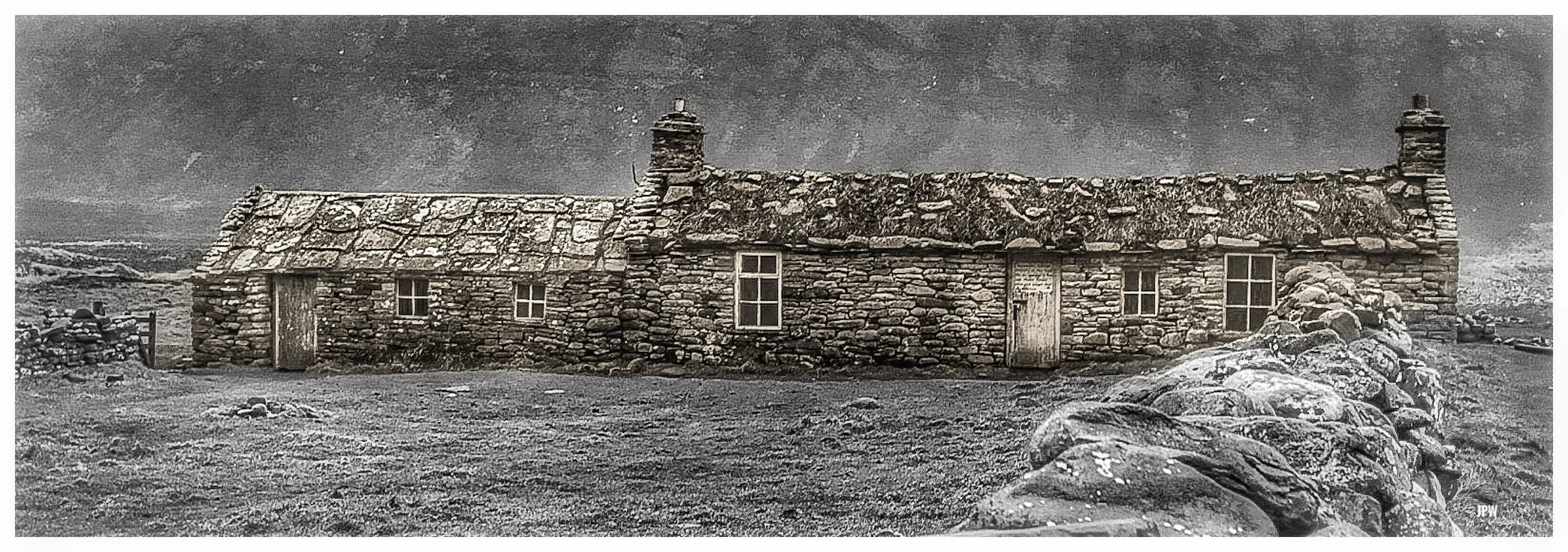 A black-and-white photo of an old stone cottage with a sloped roof and two chimneys, surrounded by a stone wall and grassy land, with hills and a cloudy sky in the background. View fullsize