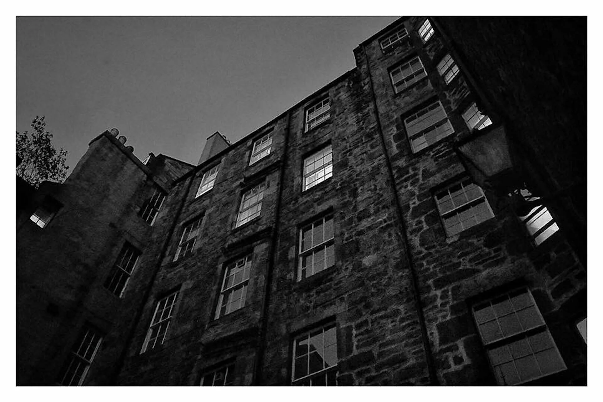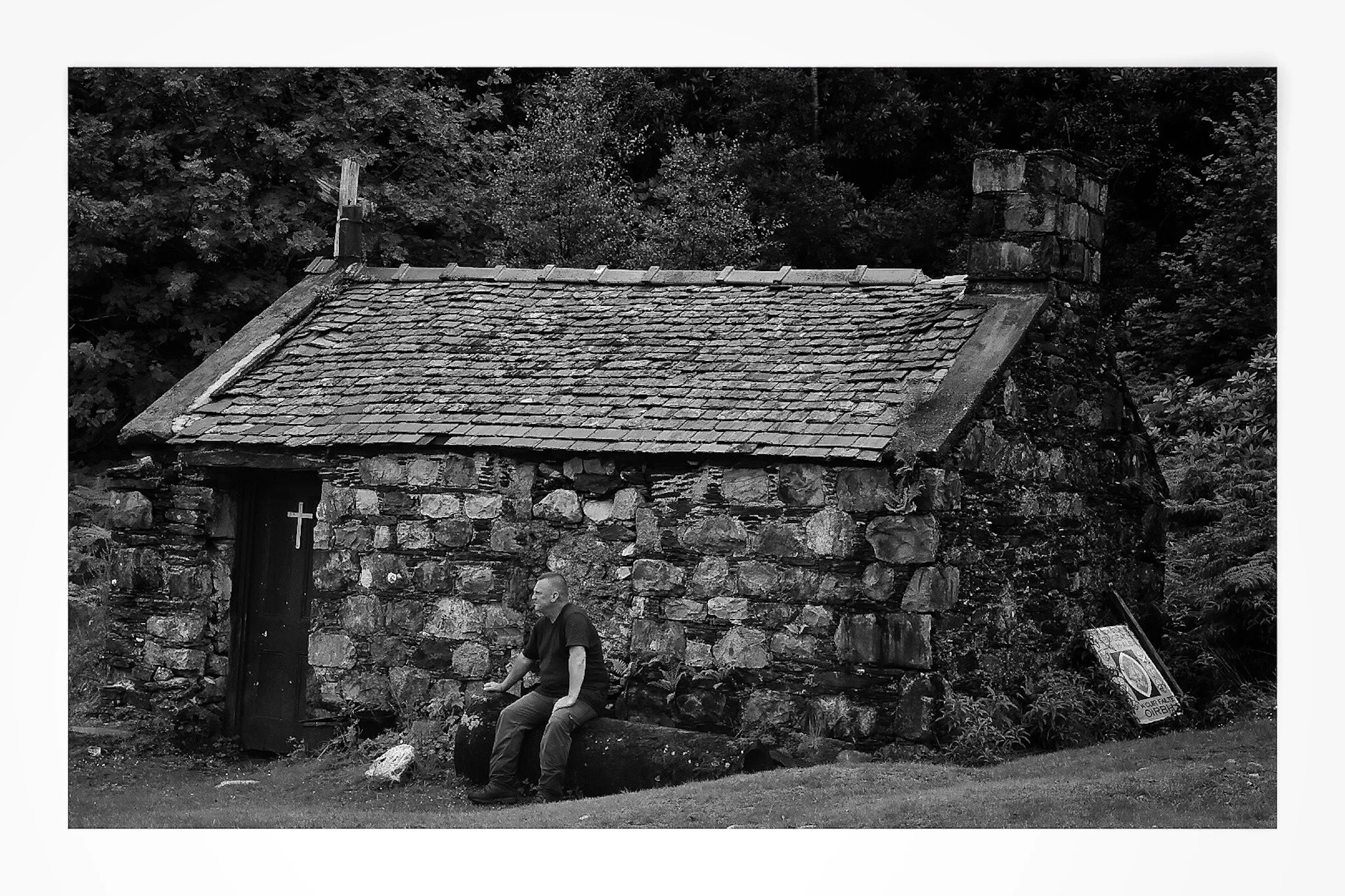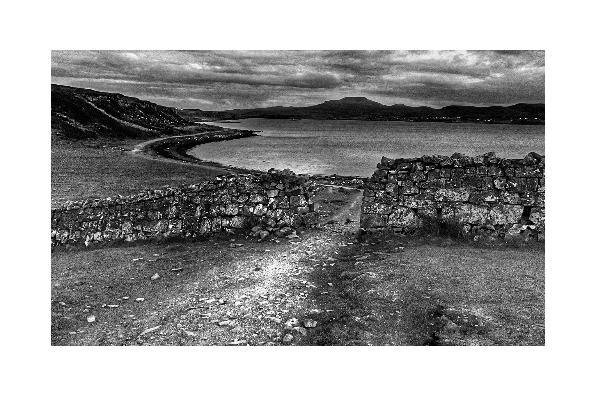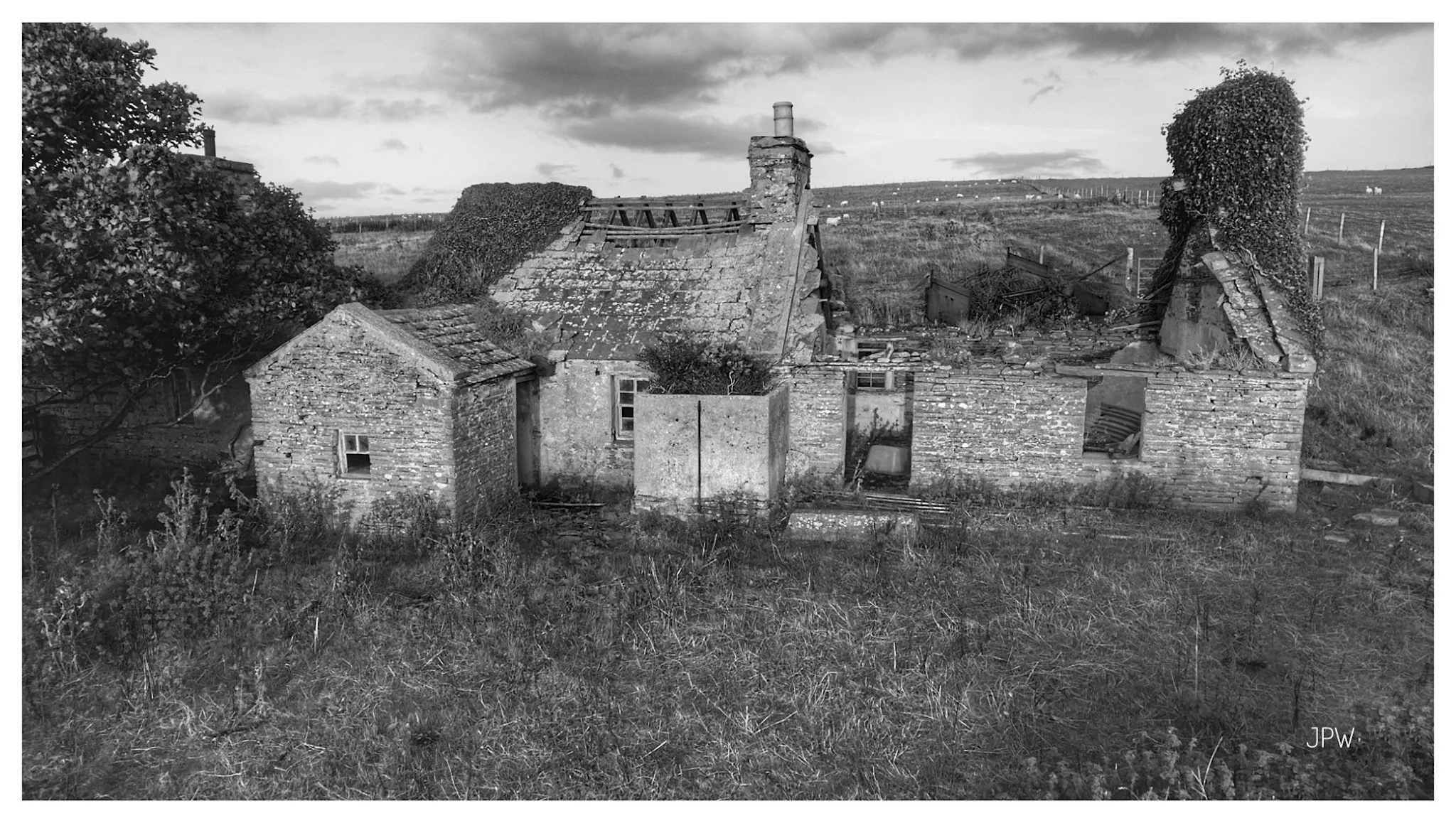 A black-and-white photo of an old stone cottage with a sloped roof and two chimneys, surrounded by a stone wall and grassy land, with hills and a cloudy sky in the background. View fullsize