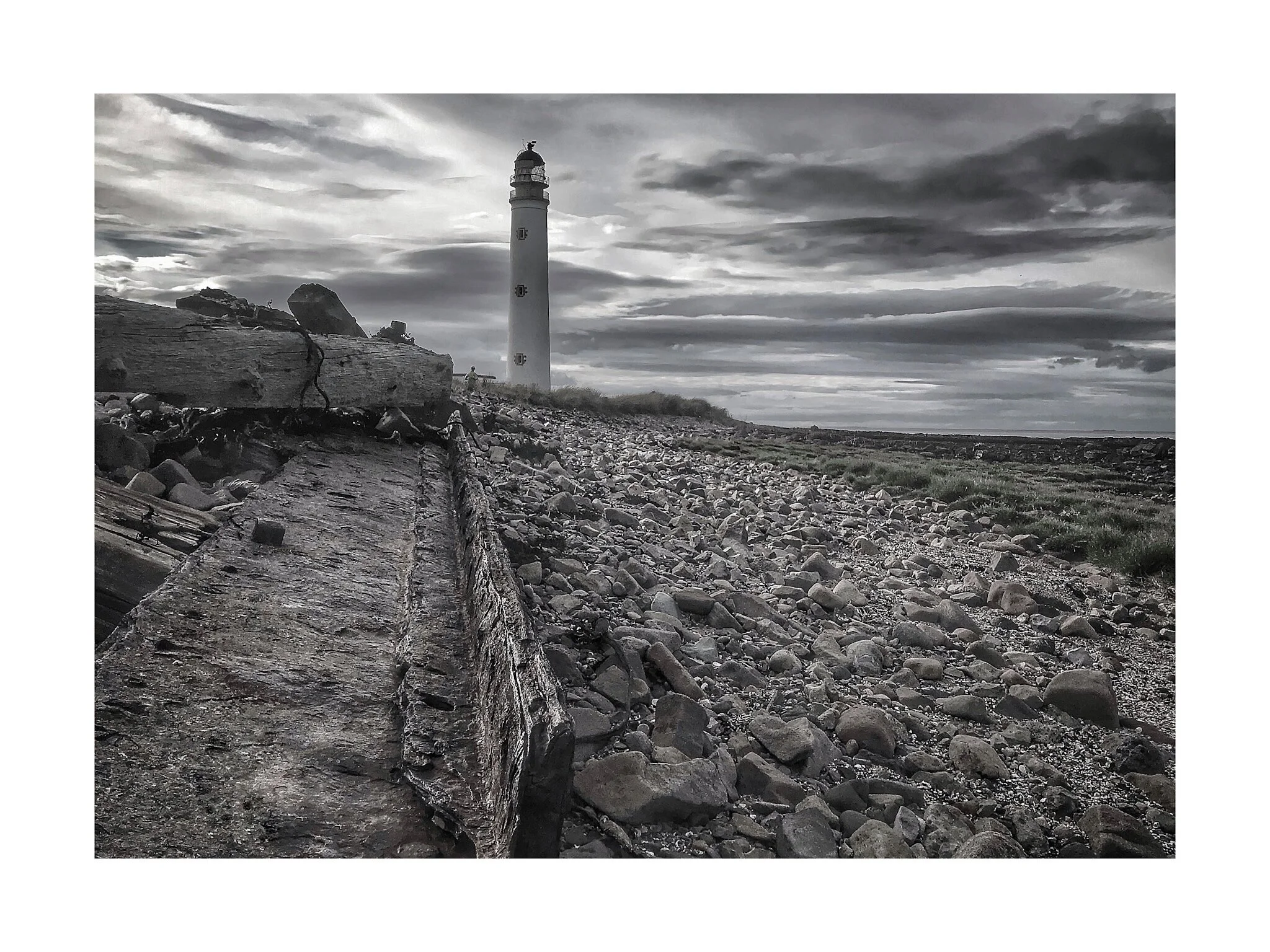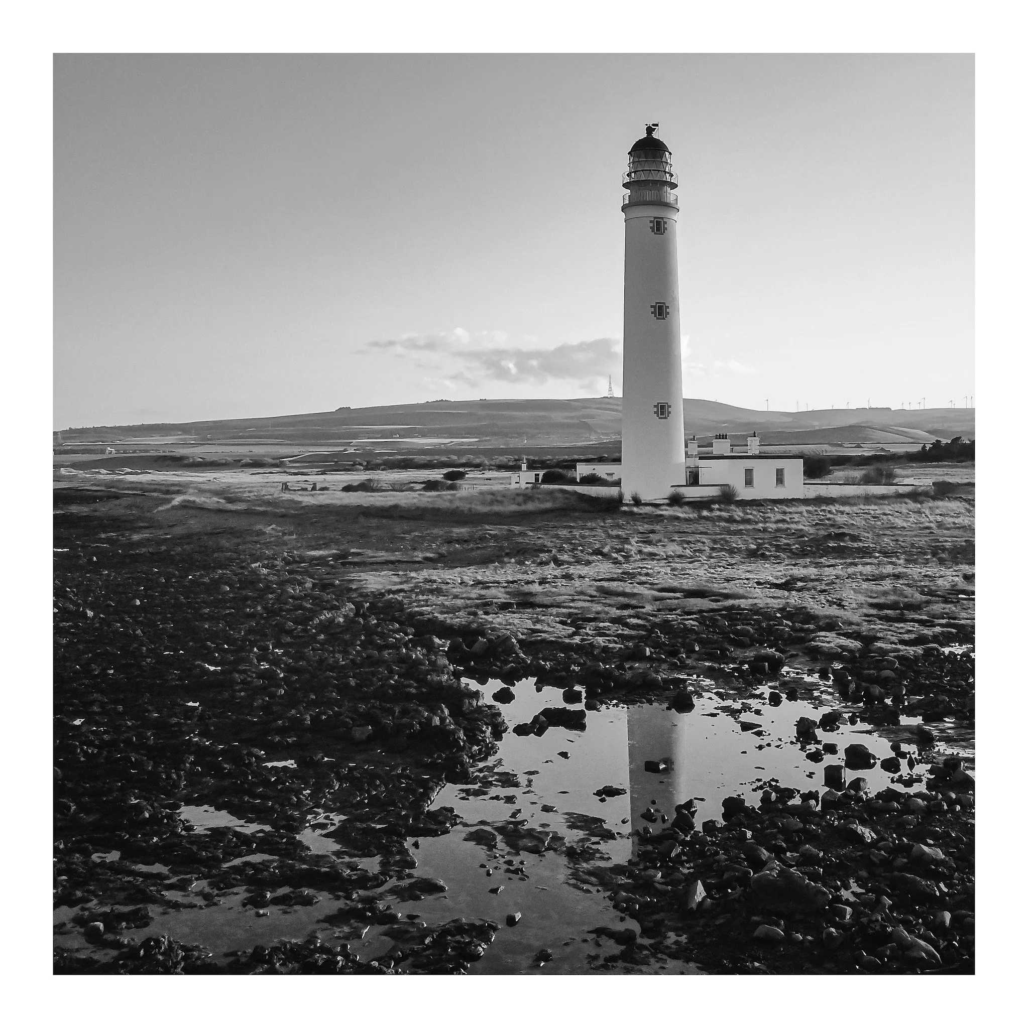 A black-and-white photo of a lighthouse on a rocky coastal landscape with water puddles, fields, and rolling hills in the background. View fullsize