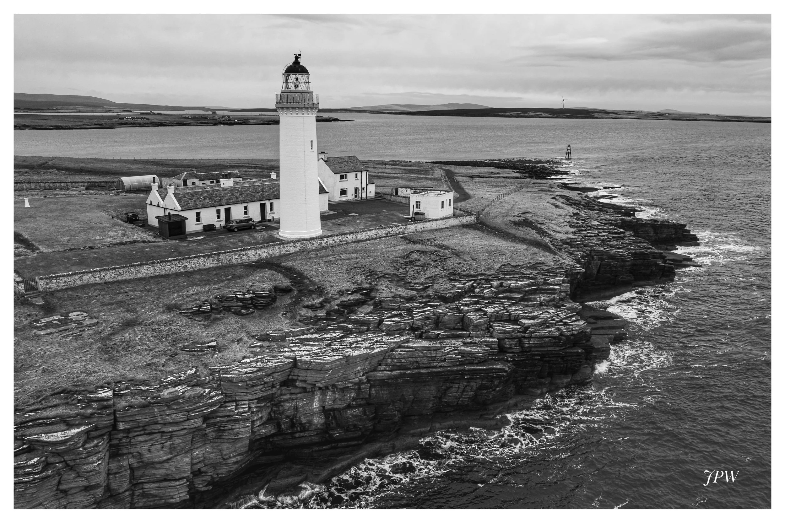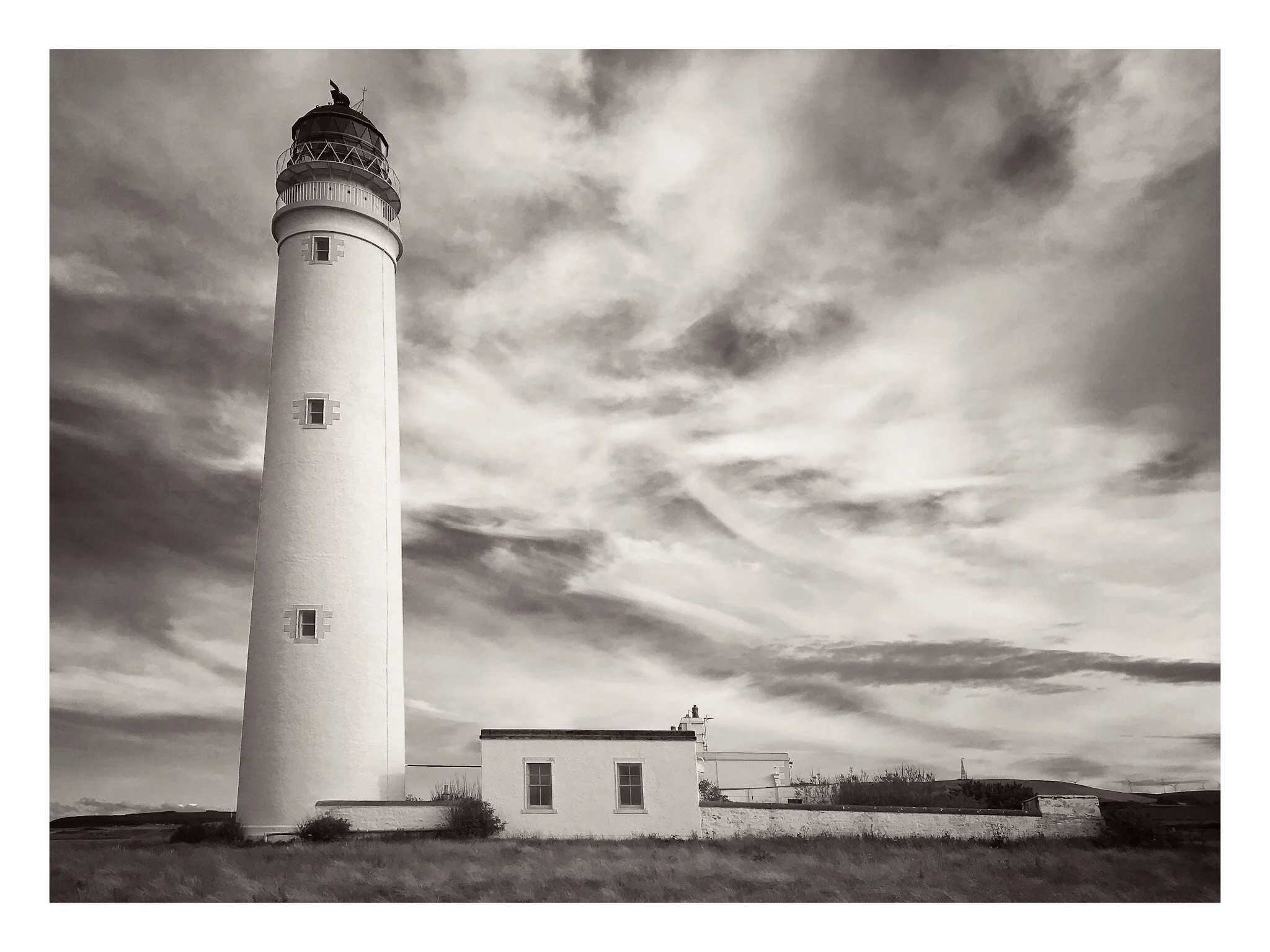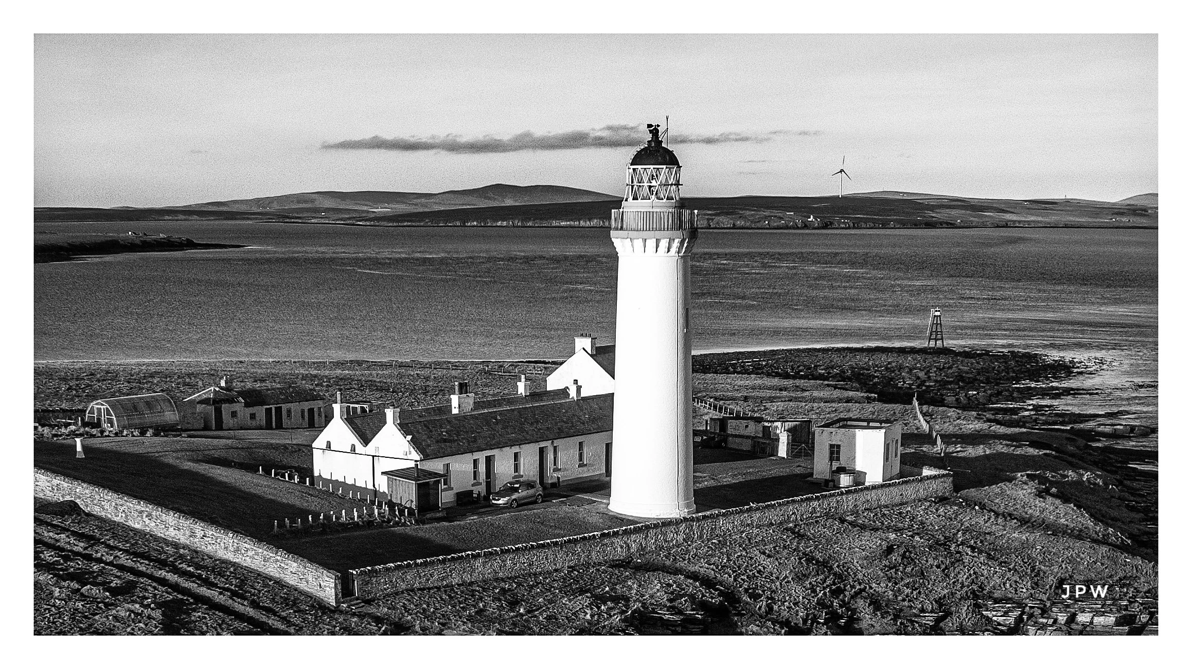 A black and white photo of a tall lighthouse with adjacent buildings on a coast, with open land and hills in the background, and wind turbines in the distance. View fullsize