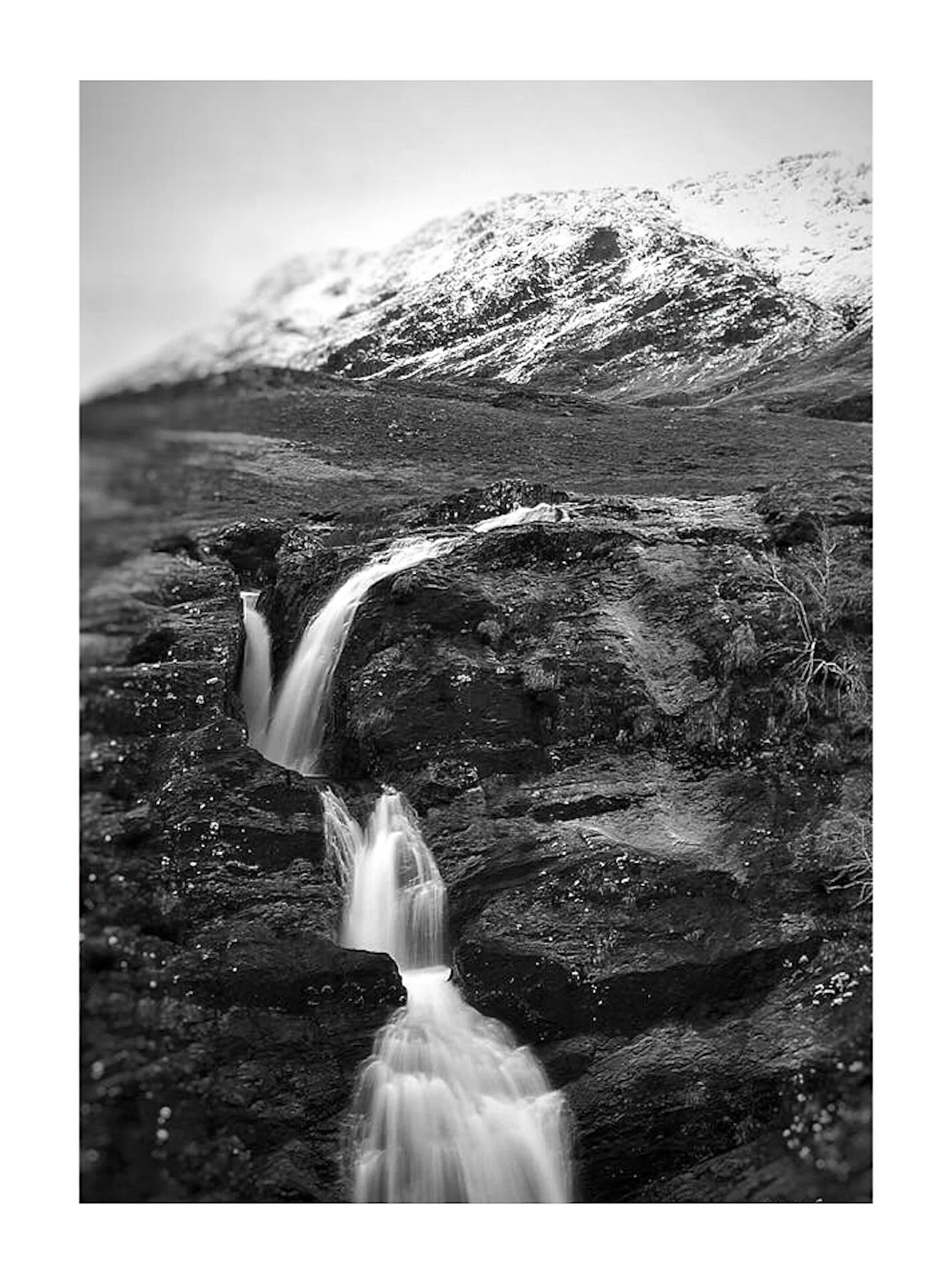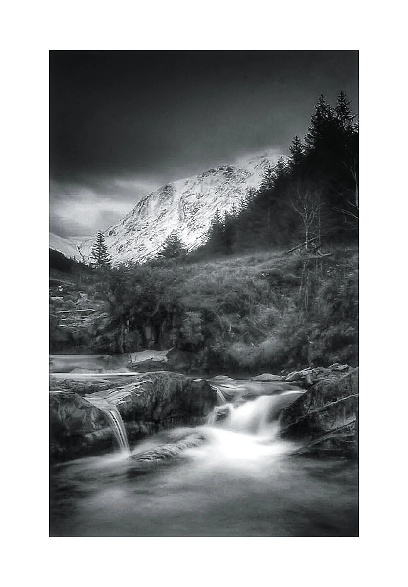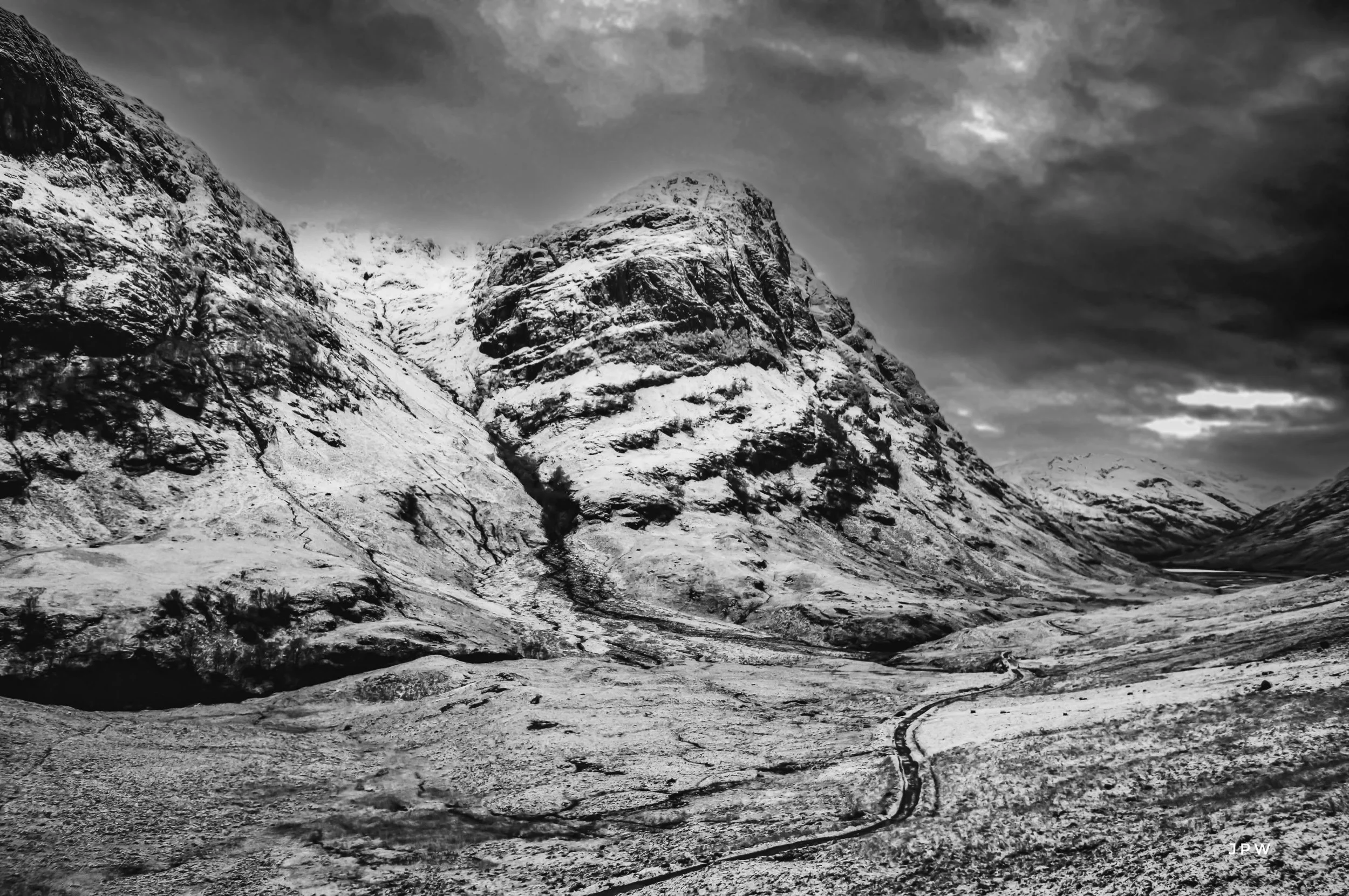 Black and white photo of a rugged mountain landscape with snow on the peaks and a cloudy sky. View fullsize
