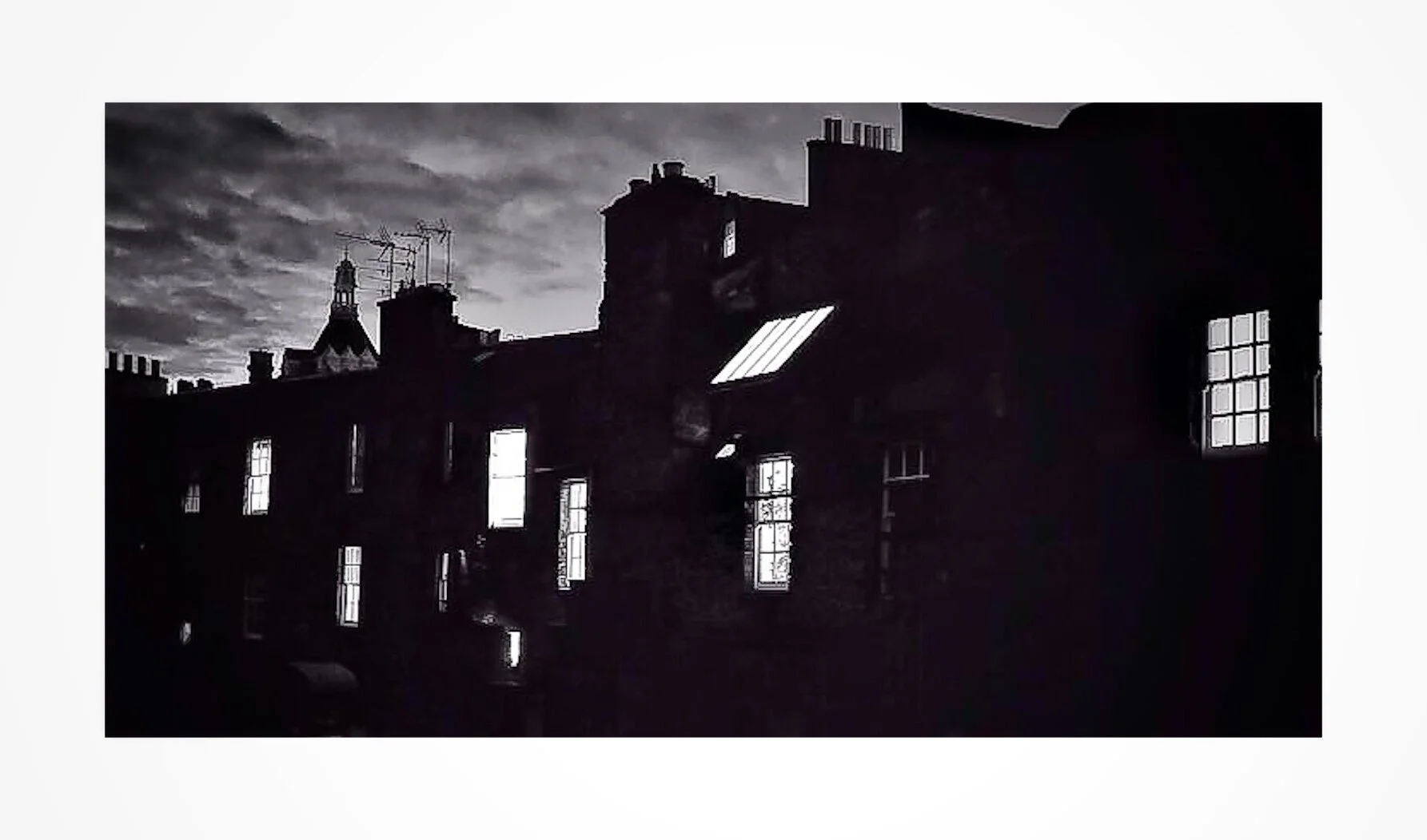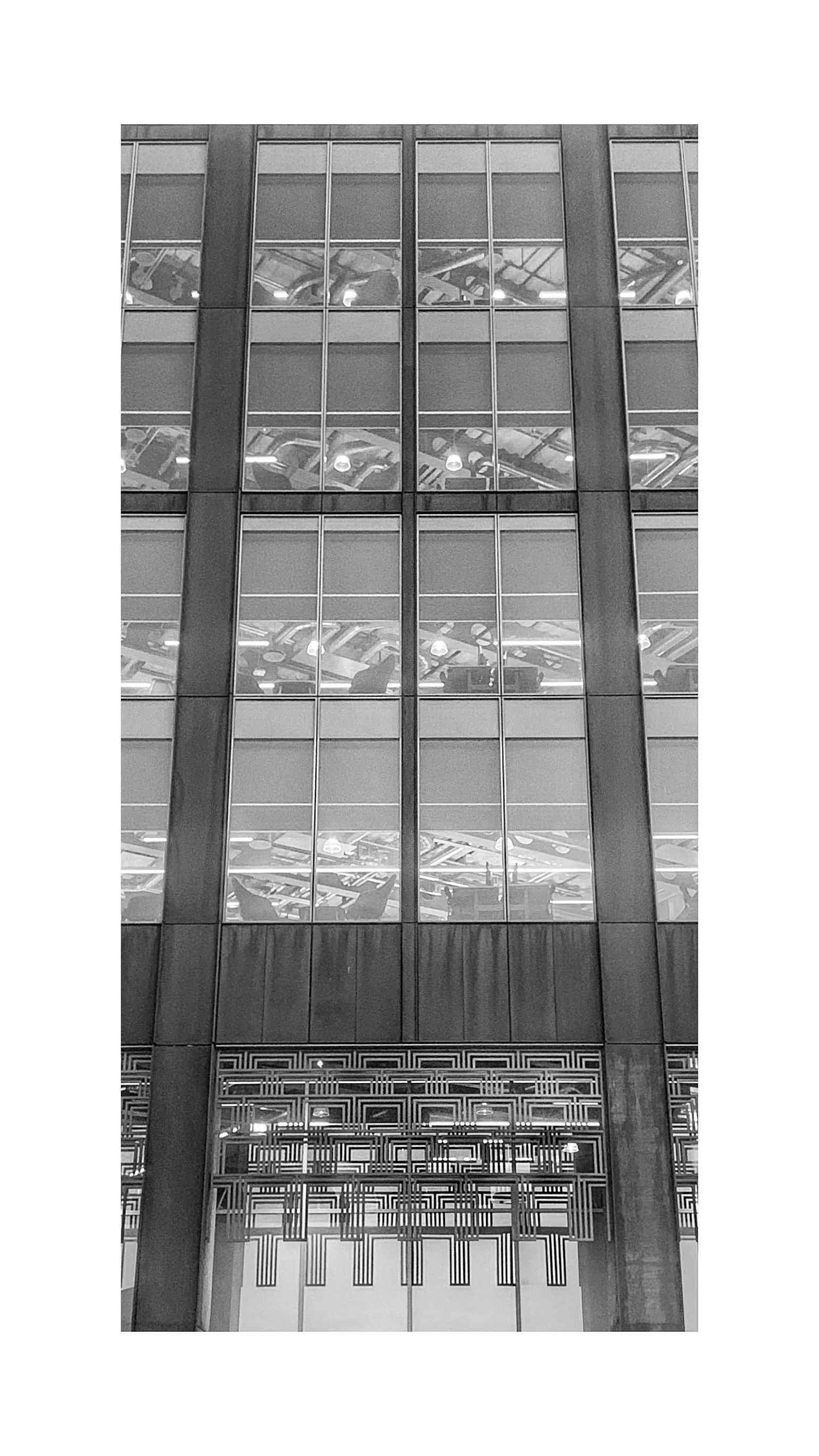 Front view of a tall building with large glass windows reflecting the interior lighting and ceiling structure, captured in black and white. View fullsize