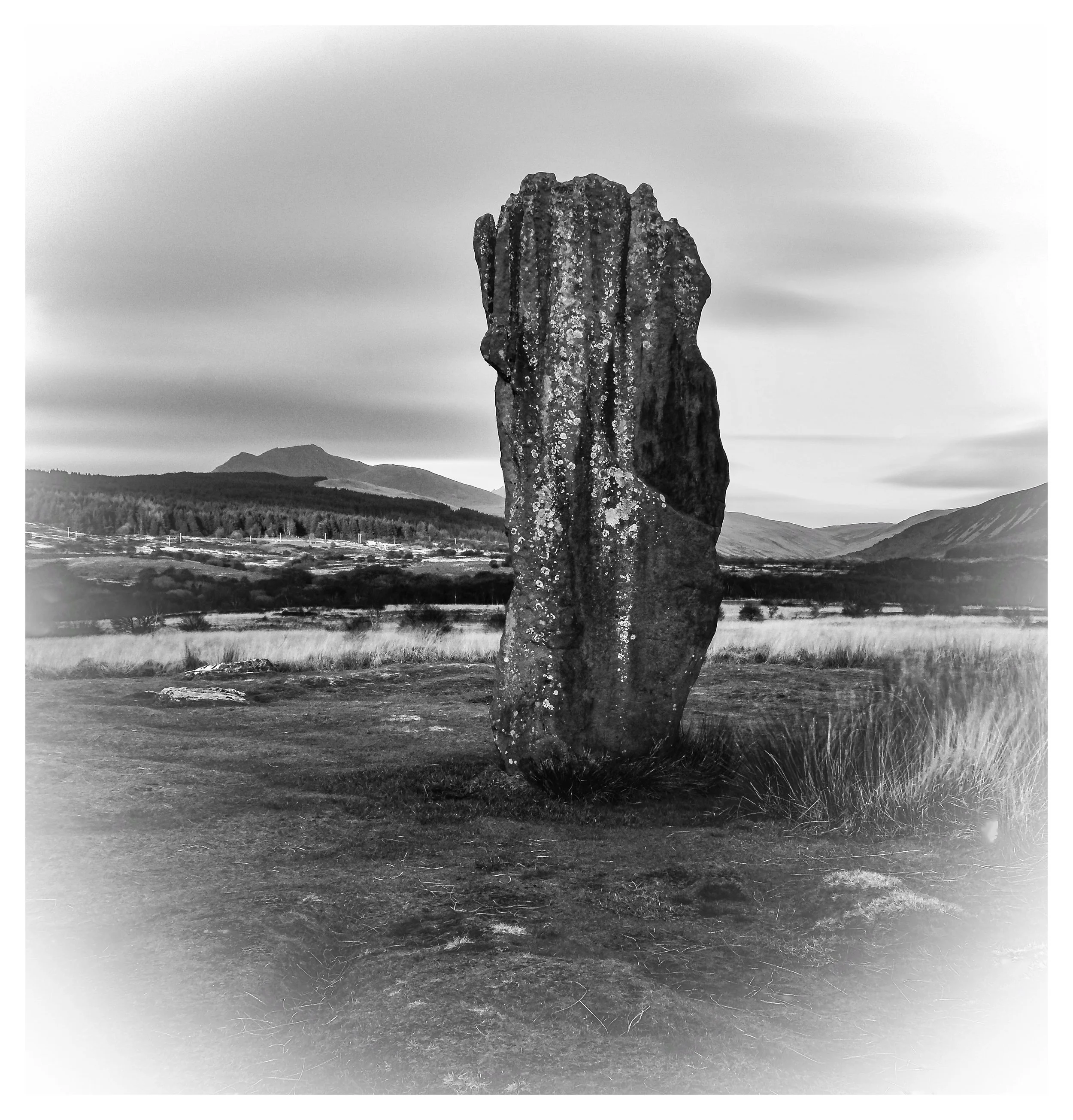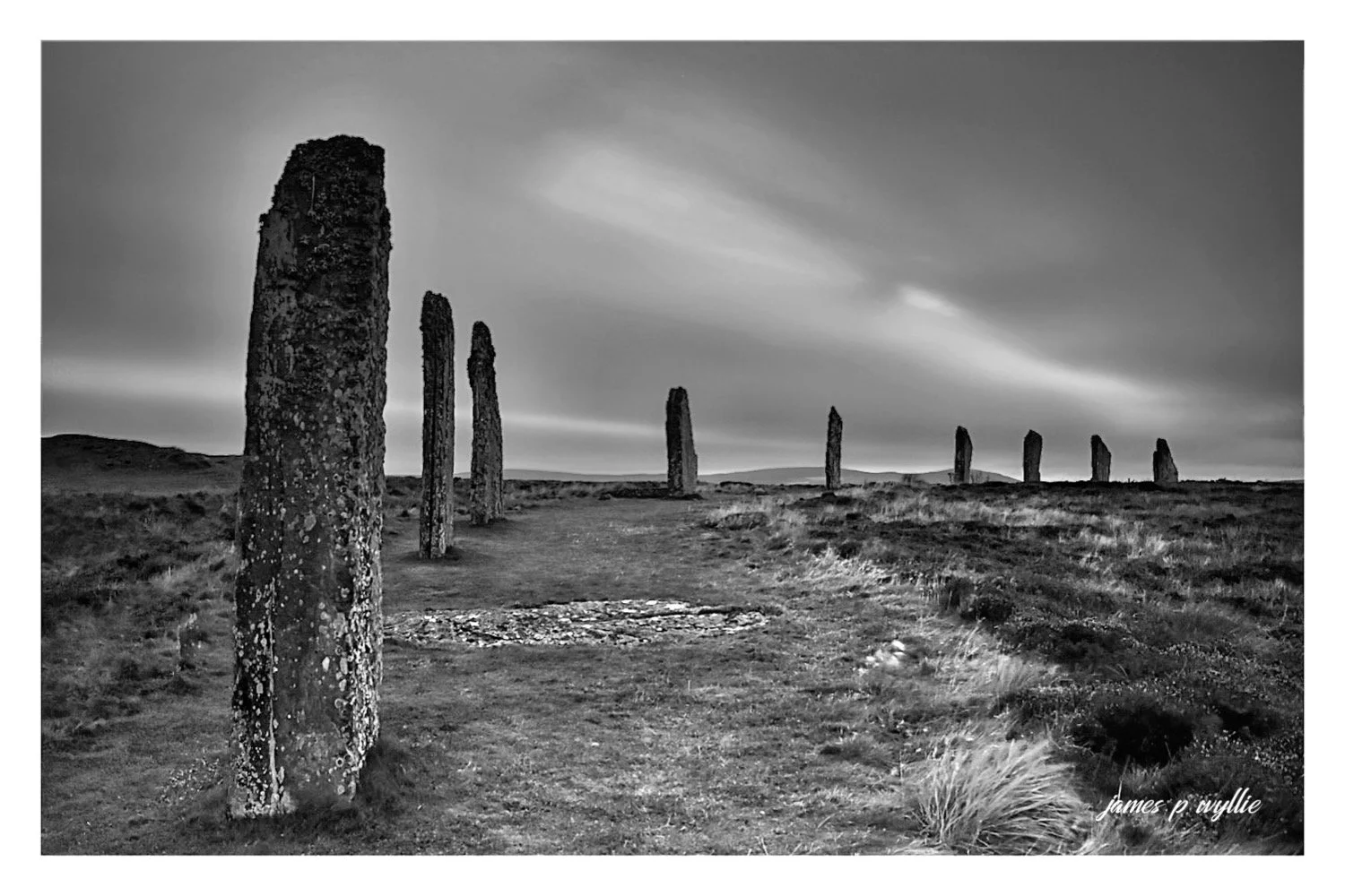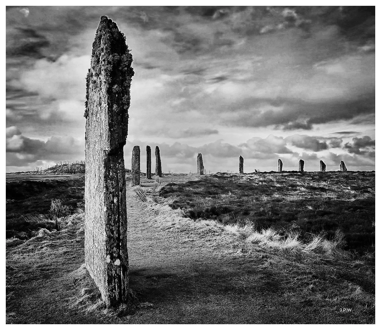 Black and white photograph of an open field with tall, weathered standing stones arranged in a row, sky filled with clouds, and a dirt path leading through the landscape. View fullsize