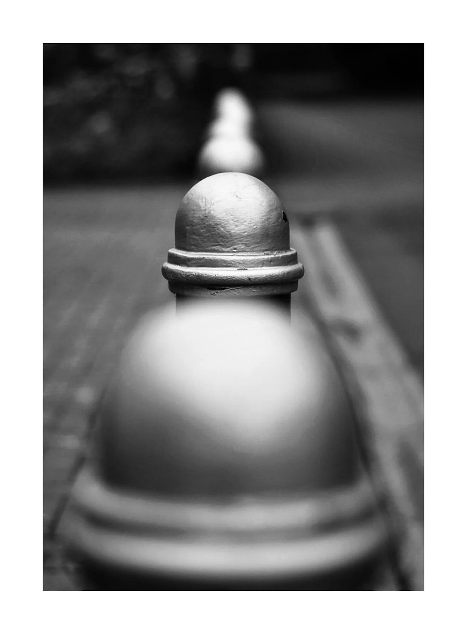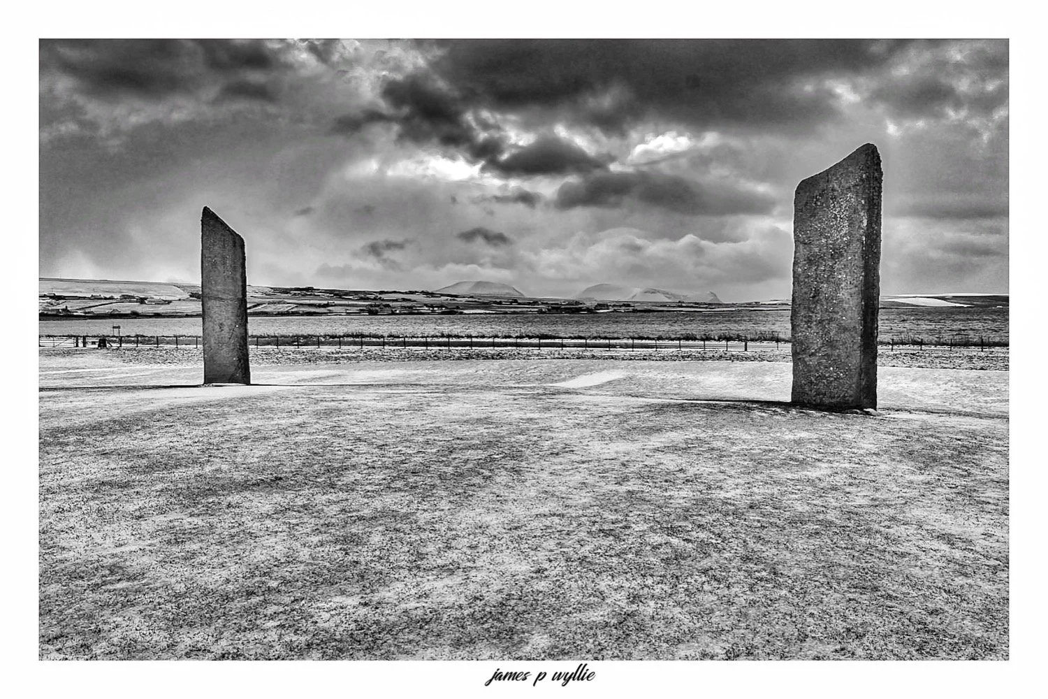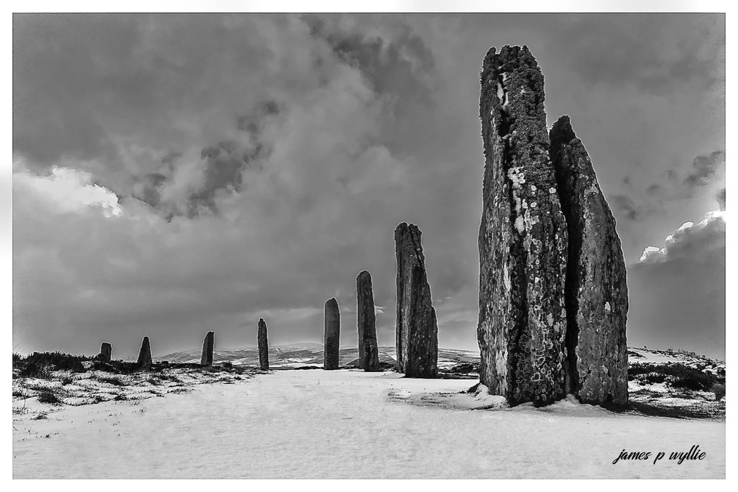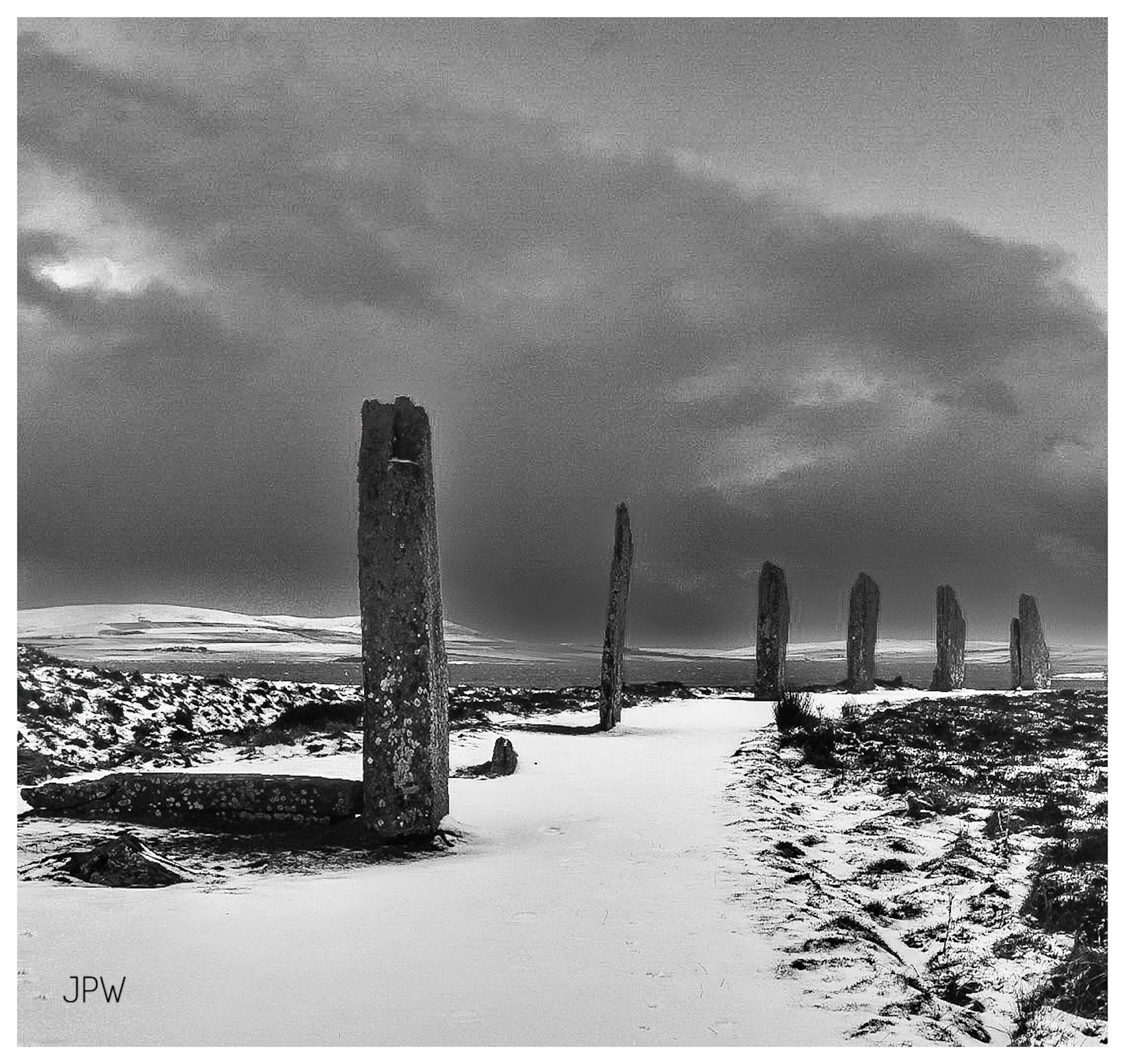 Black and white photograph of an open field with tall, weathered standing stones arranged in a row, sky filled with clouds, and a dirt path leading through the landscape. View fullsize