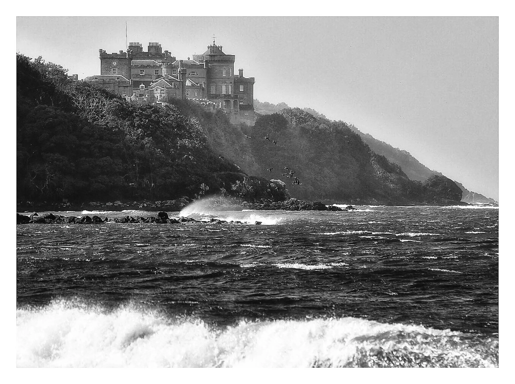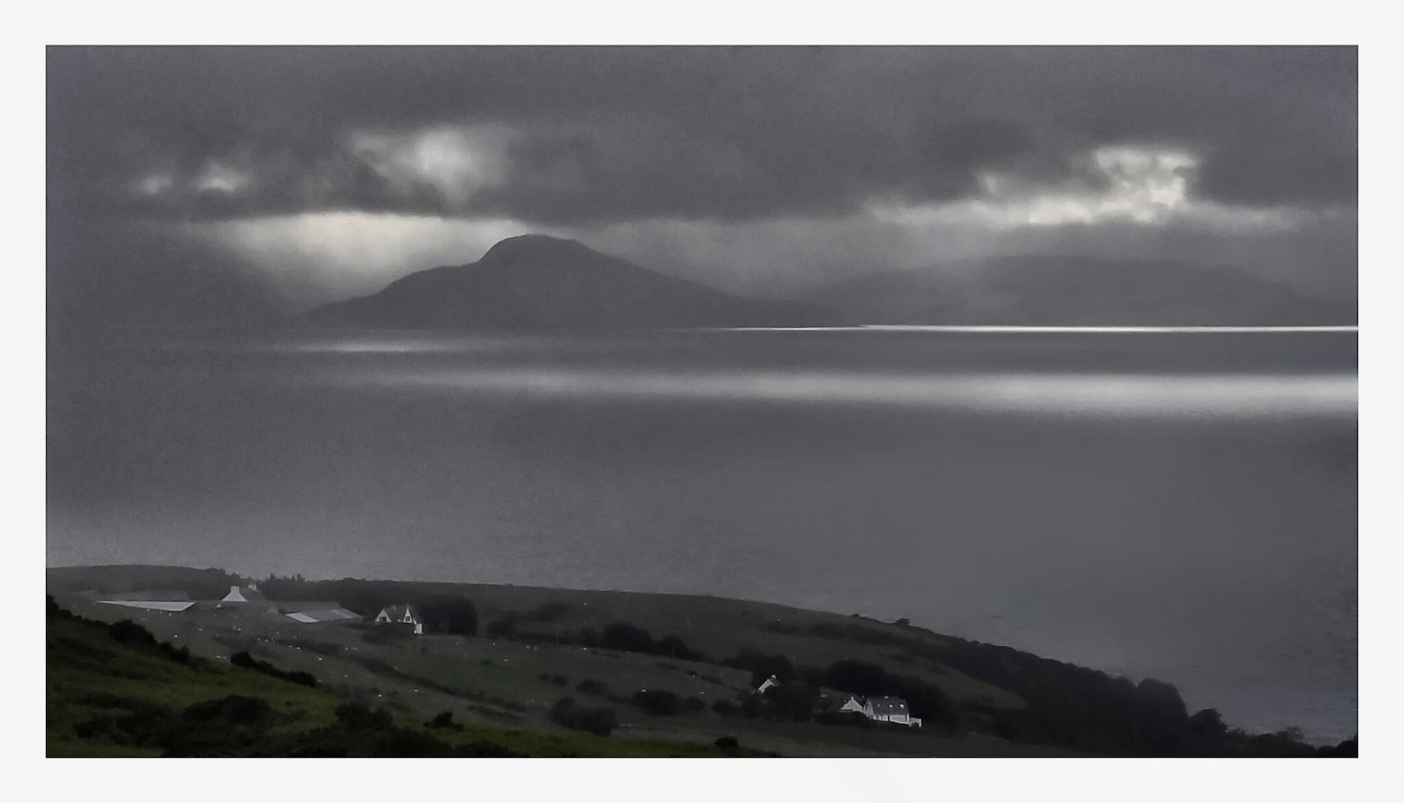 A black and white photo of an old house on a grassy hill next to a body of water with land and hills in the background. View fullsize