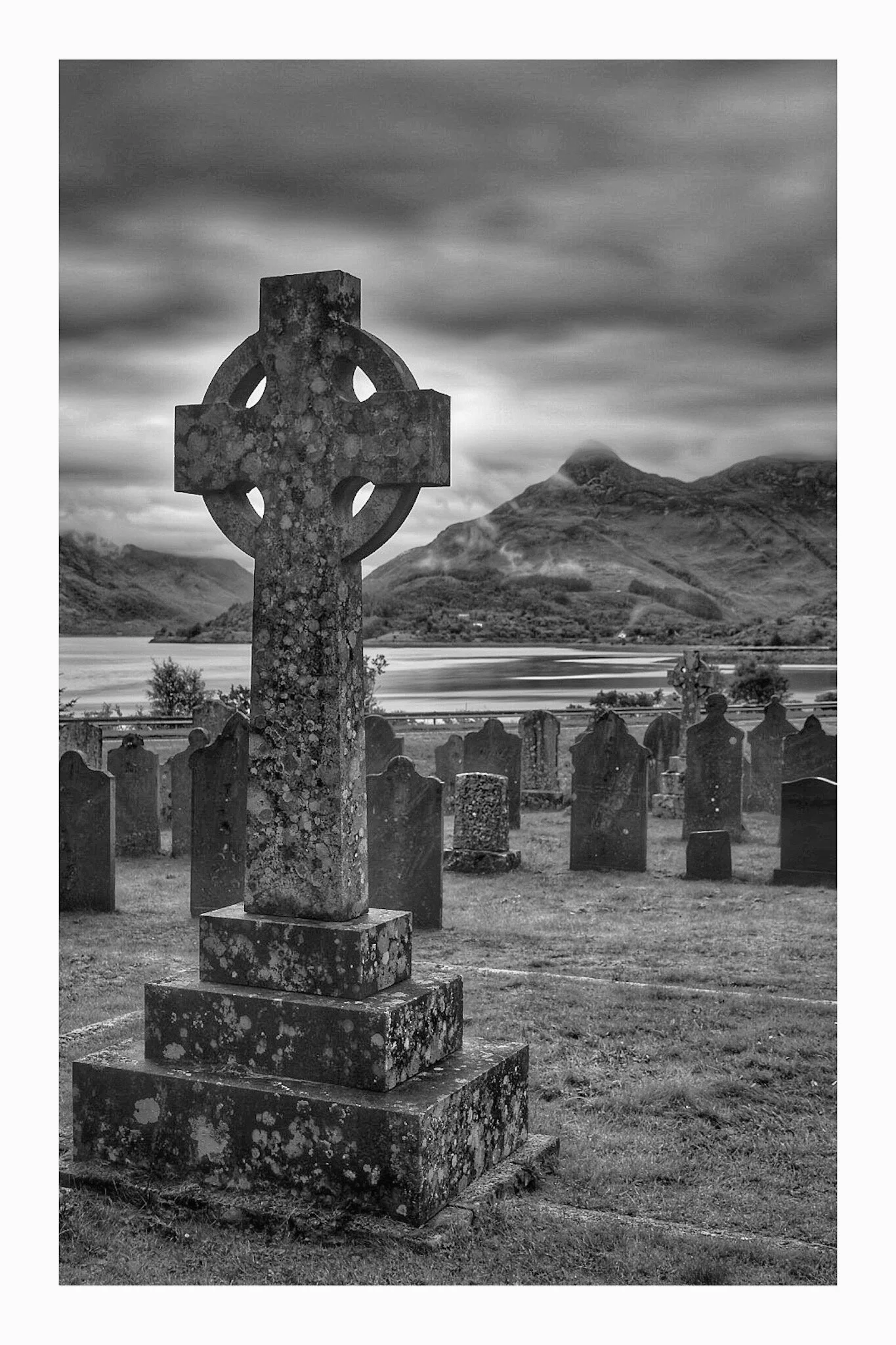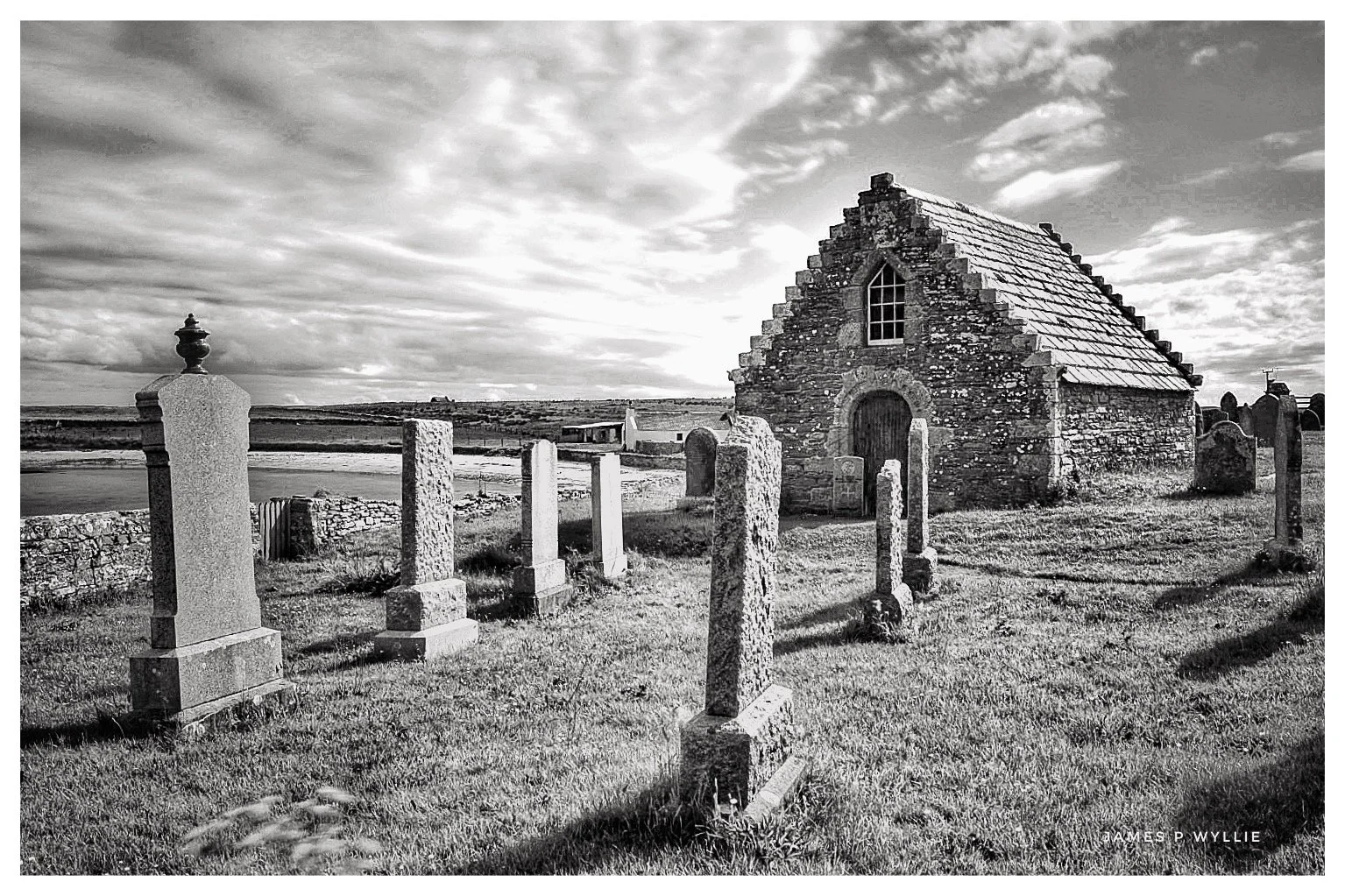 Black and white photo of an old stone church with a pitched roof, surrounded by a graveyard with various tombstones, under a cloudy sky. View fullsize