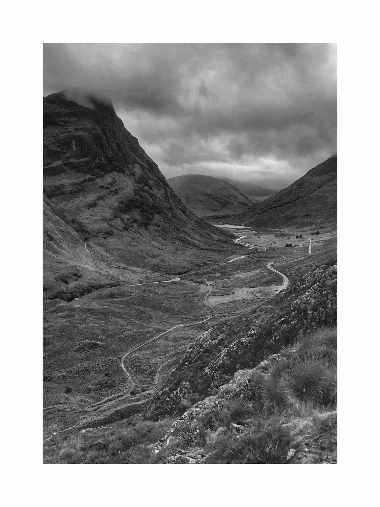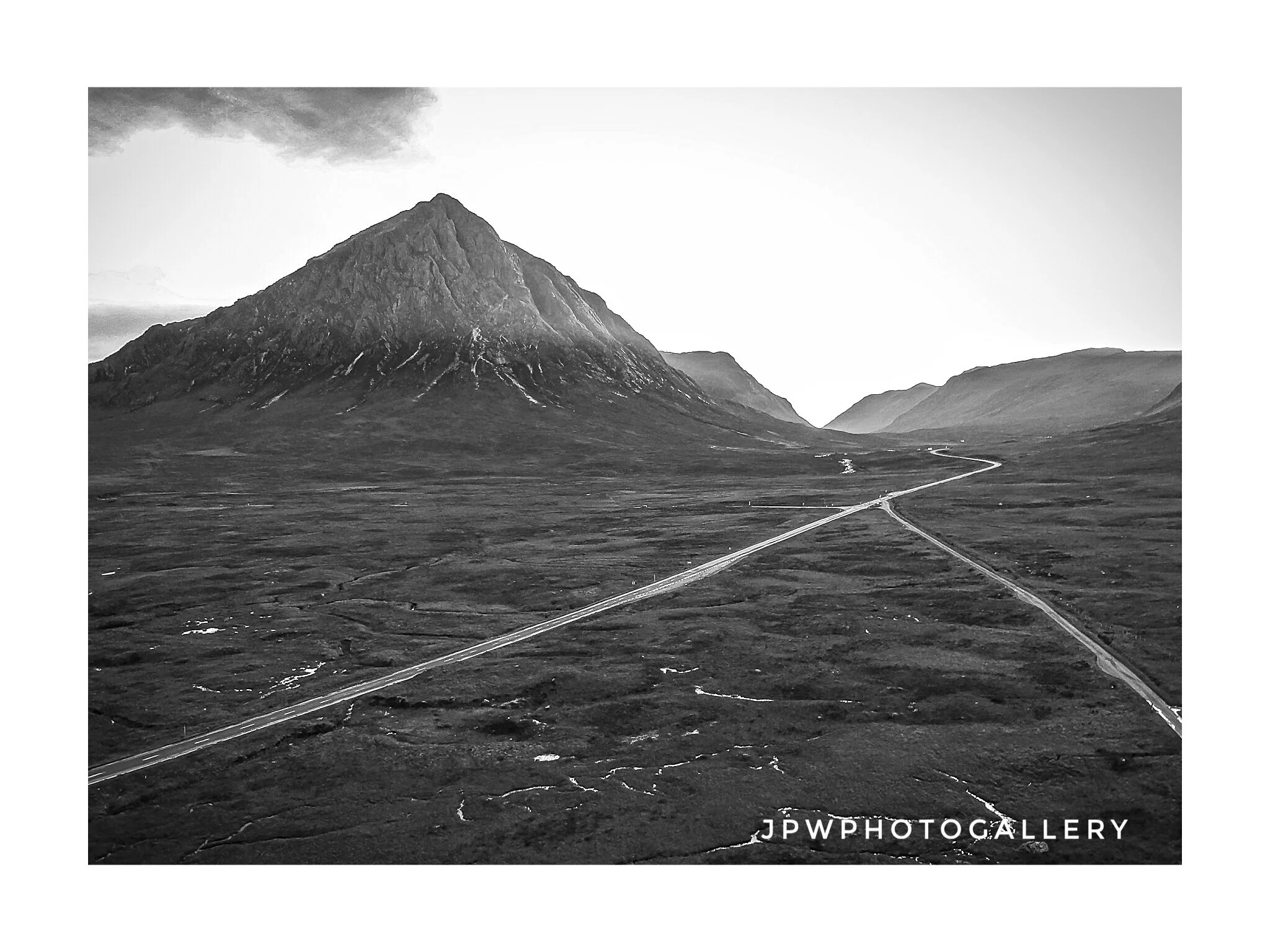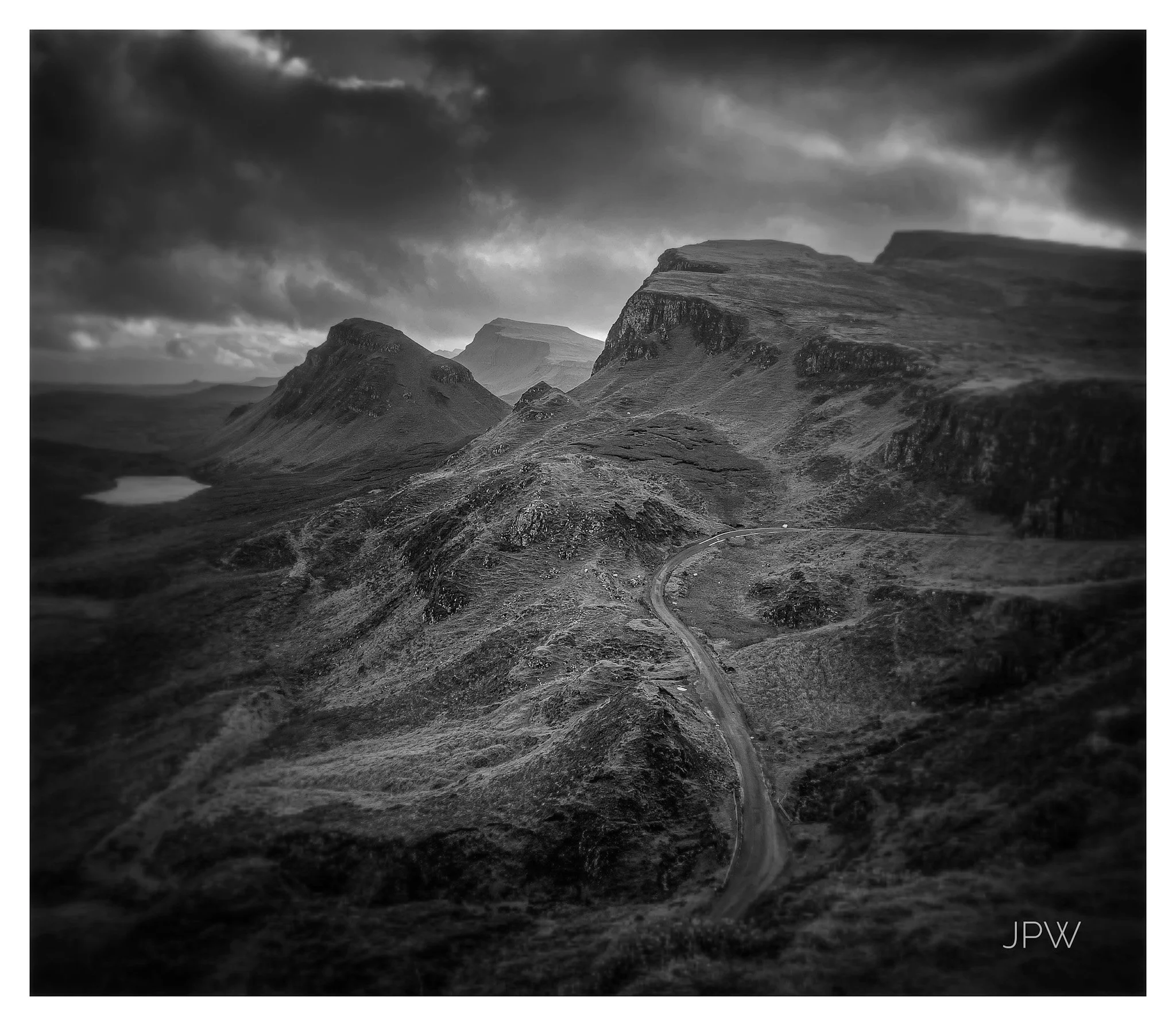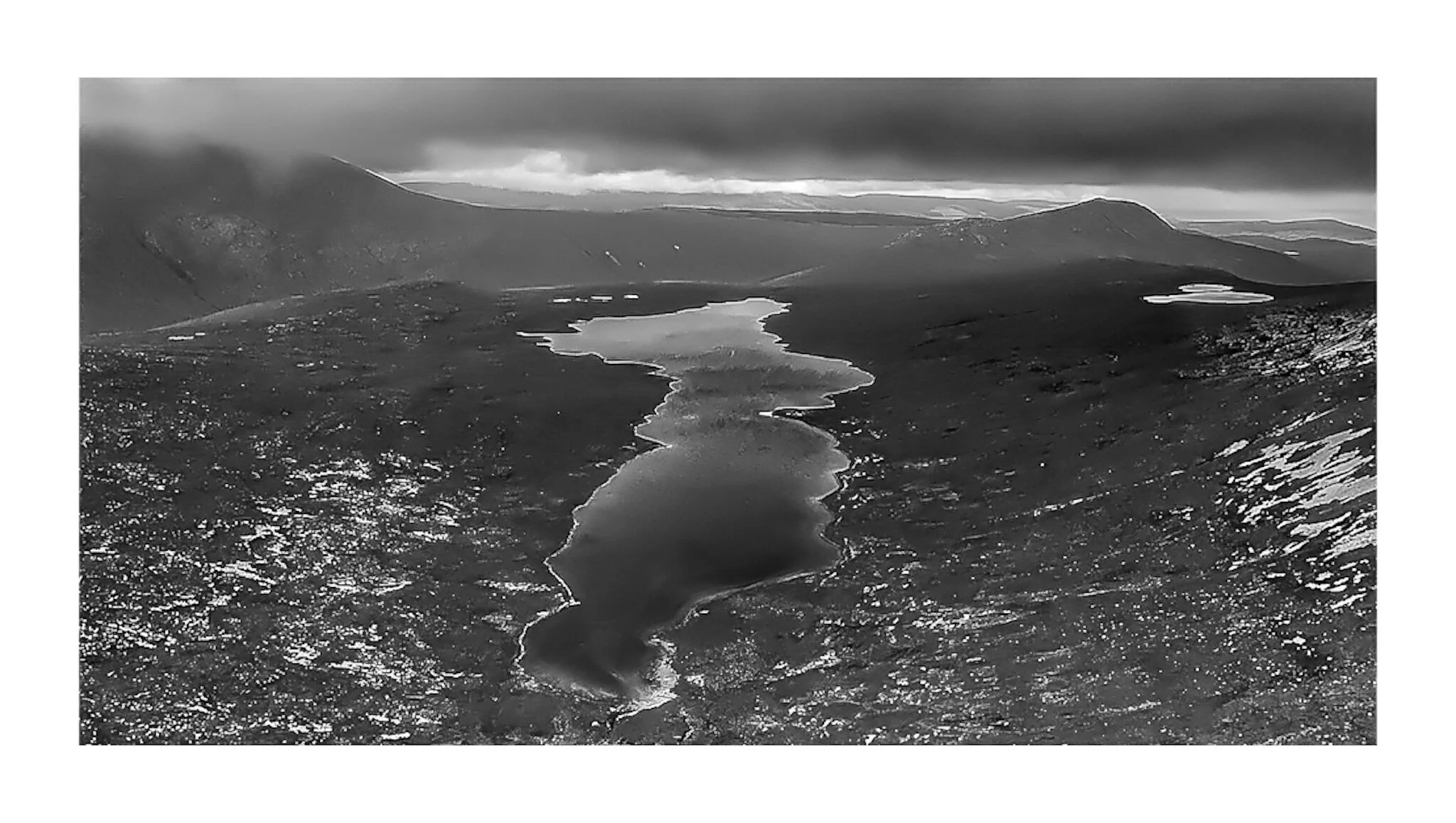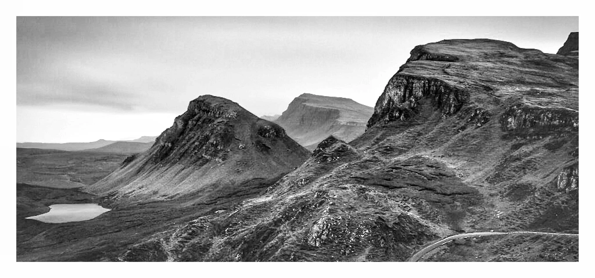 Black and white photo of rugged mountains with steep slopes, a small lake, and a winding road in a remote landscape. View fullsize