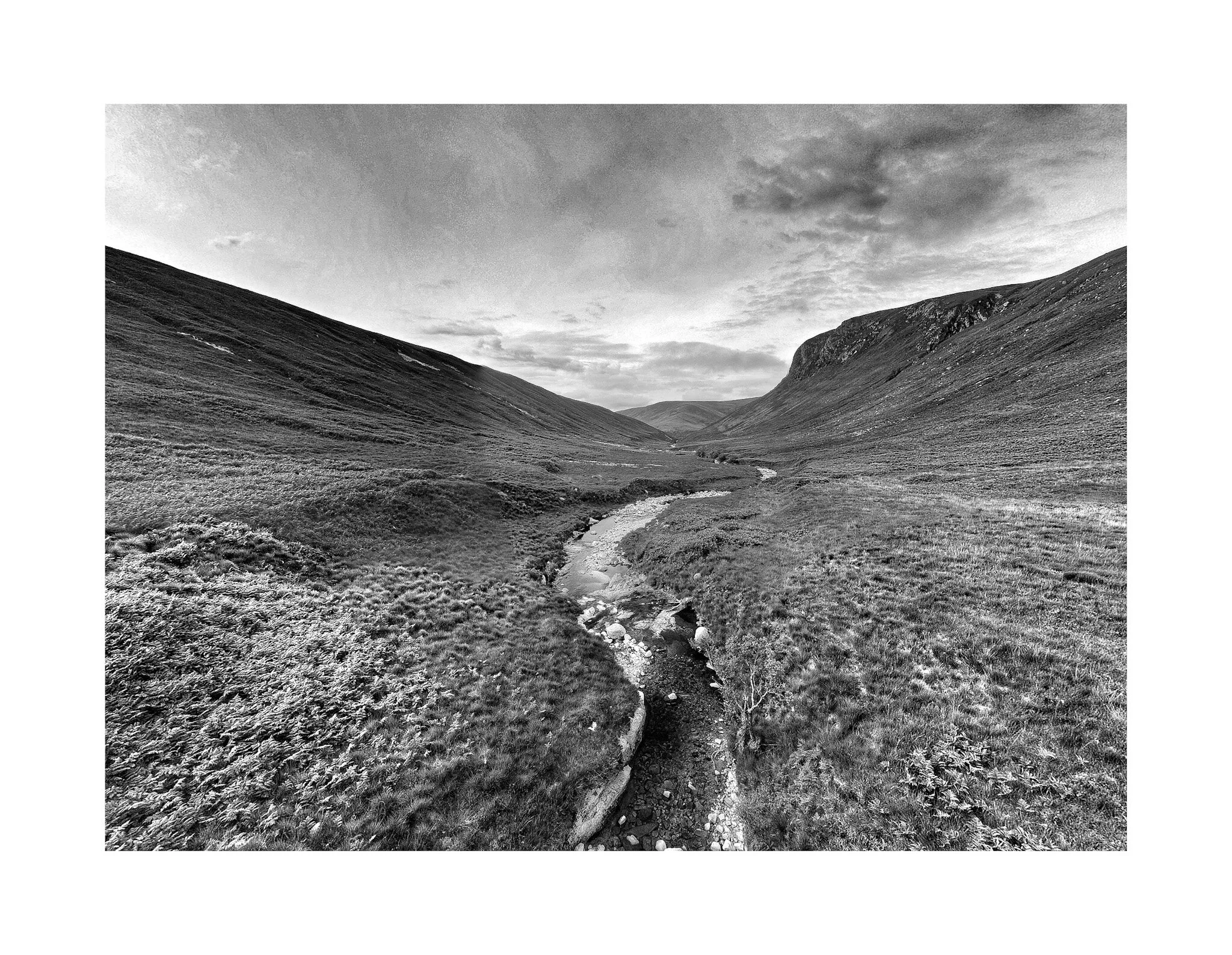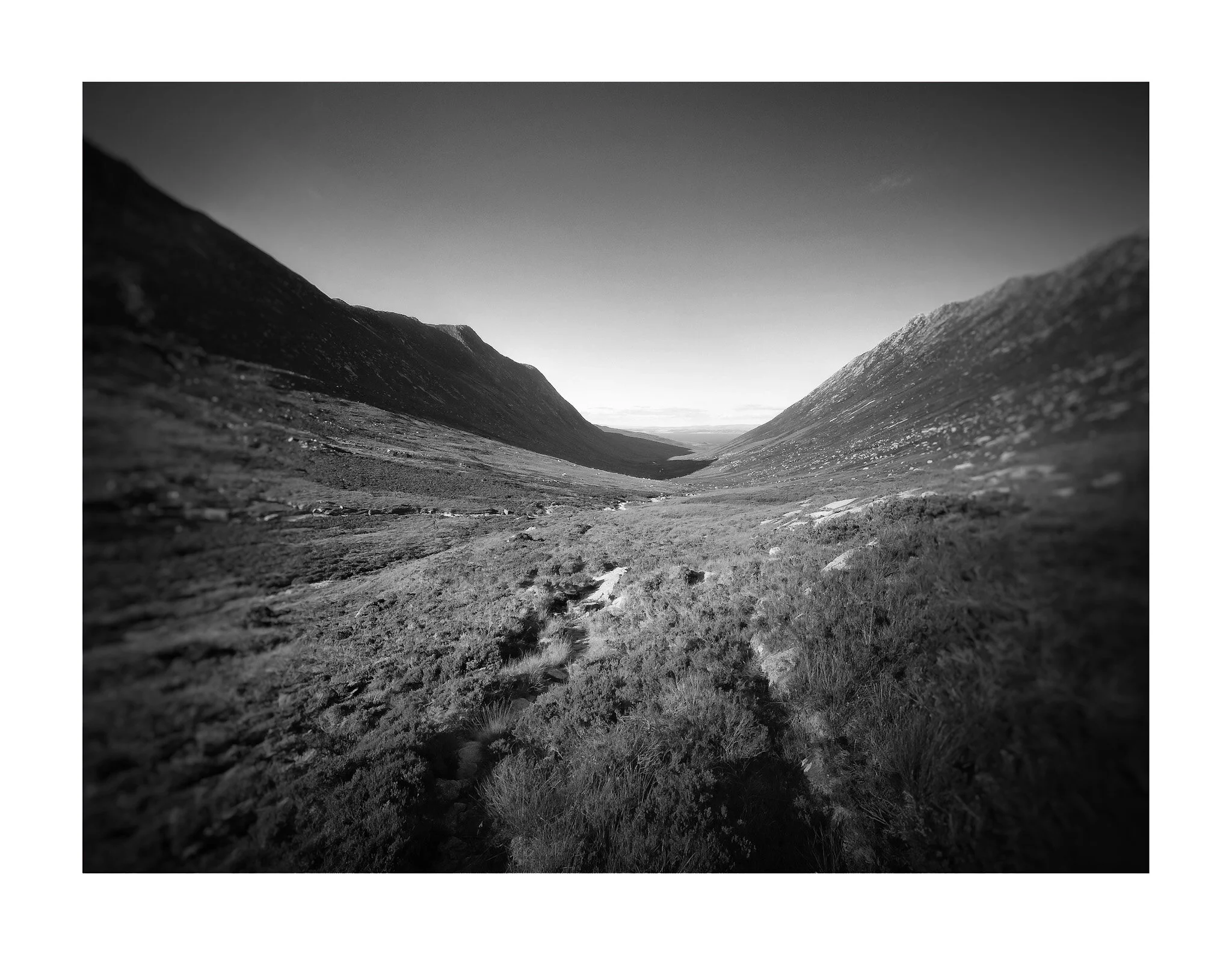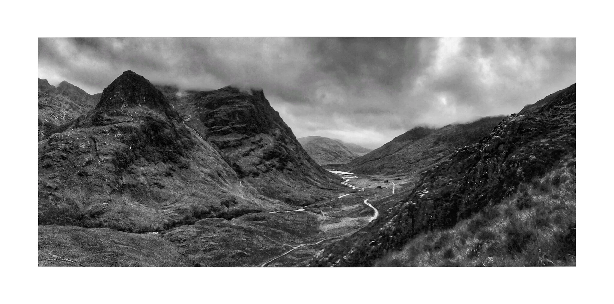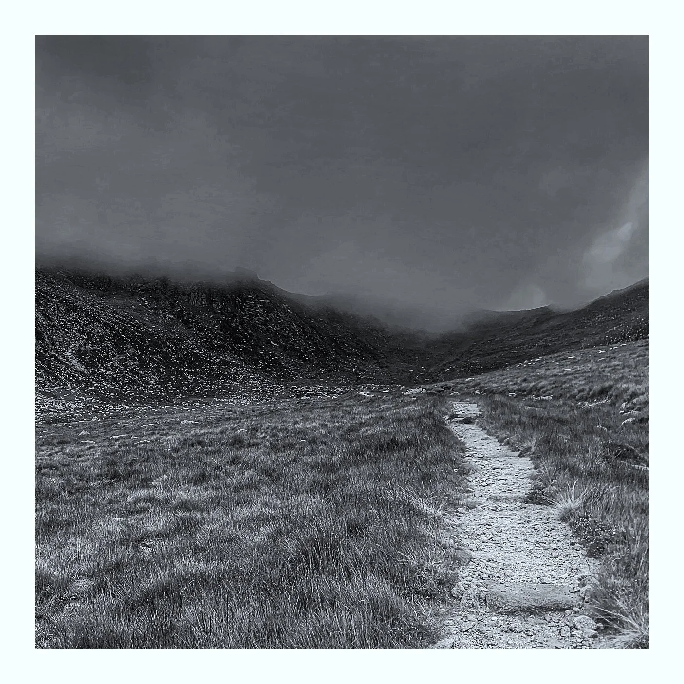 A black and white photograph of a rugged mountain landscape with a dirt trail running through grassy plains, leading towards distant hills under a cloudy sky. View fullsize