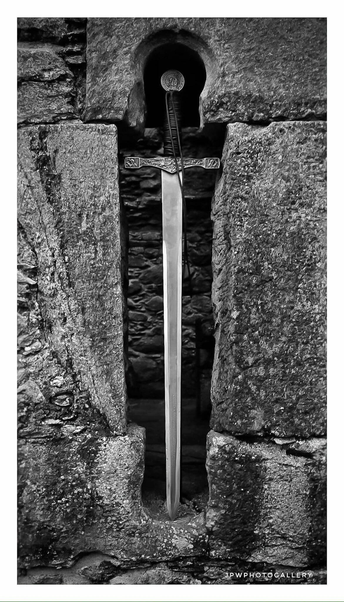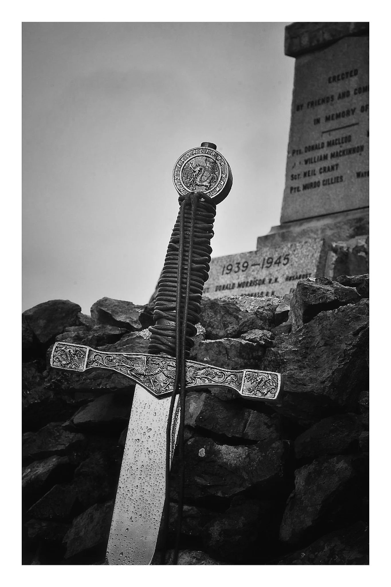 A close-up black-and-white photograph of a sword with a detailed hilt, planted among rocks at a memorial site. The background shows a memorial plaque with names and dates, and the sky is clear. View fullsize