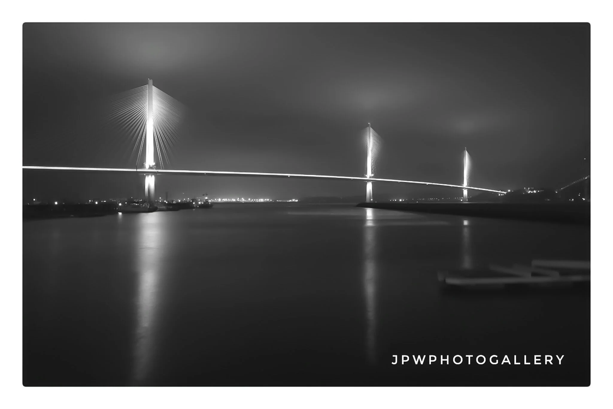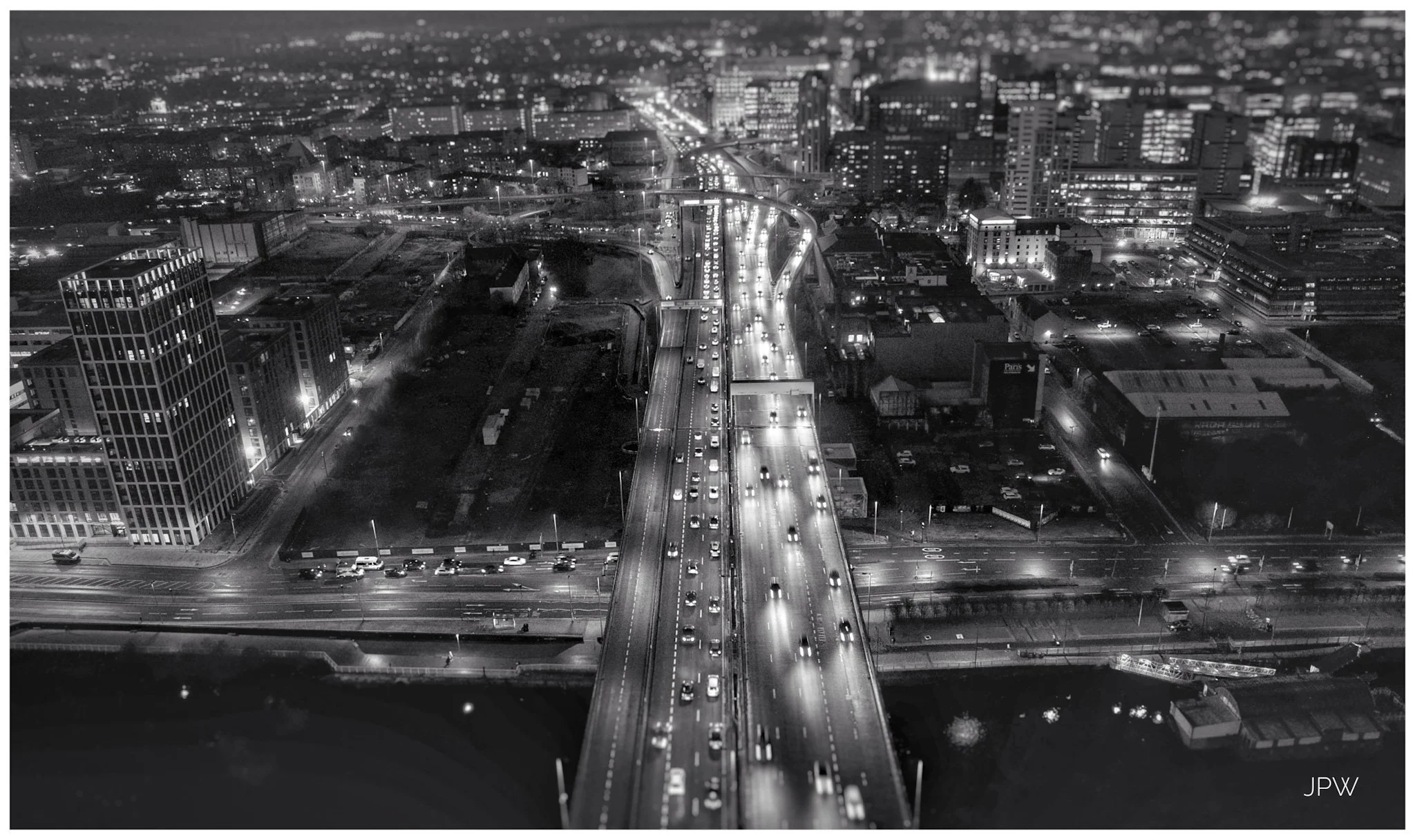 A black-and-white aerial night view of a city with a river running through it, illuminated buildings, roads with moving vehicles, and a cloudy sky. View fullsize
