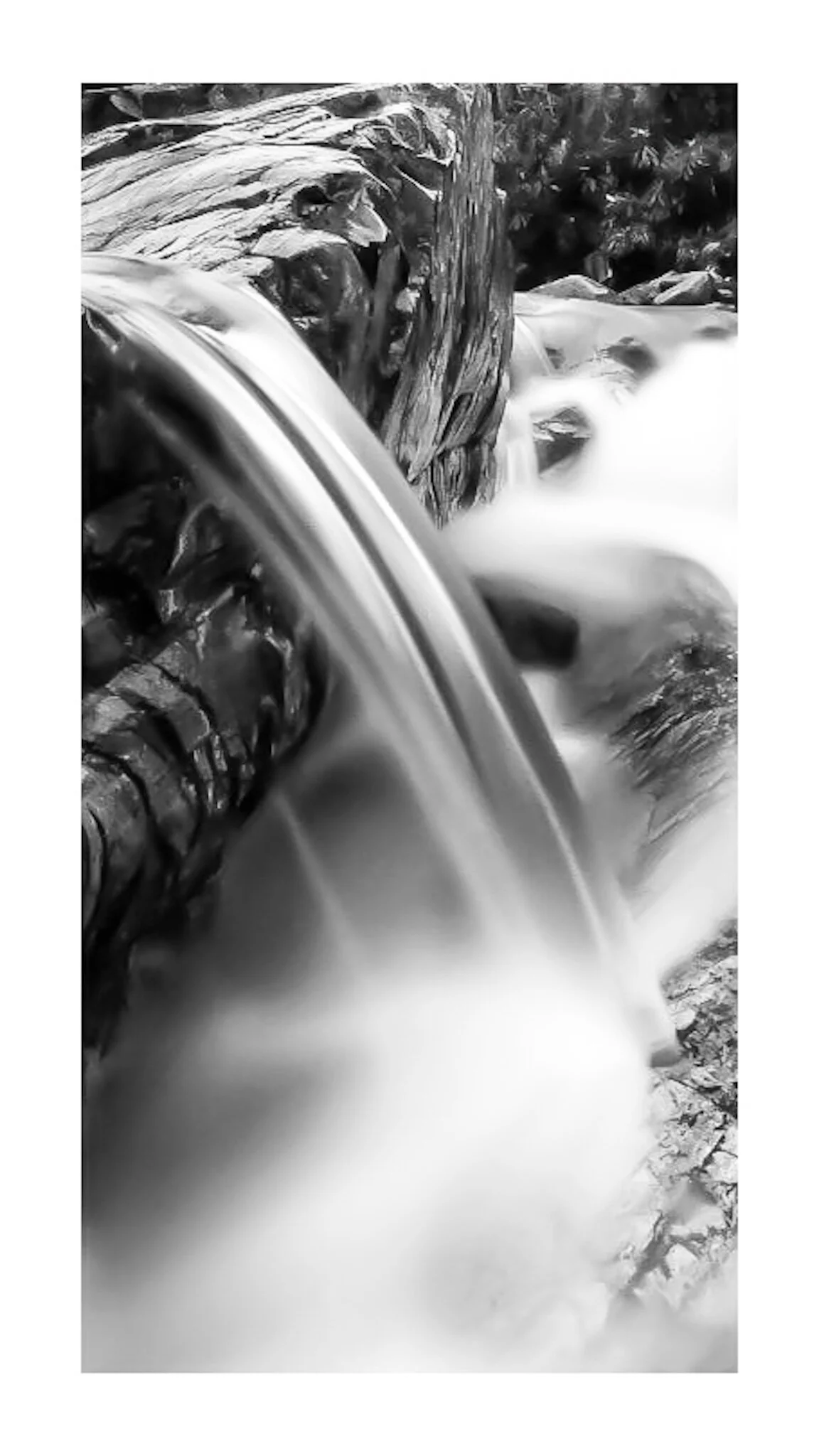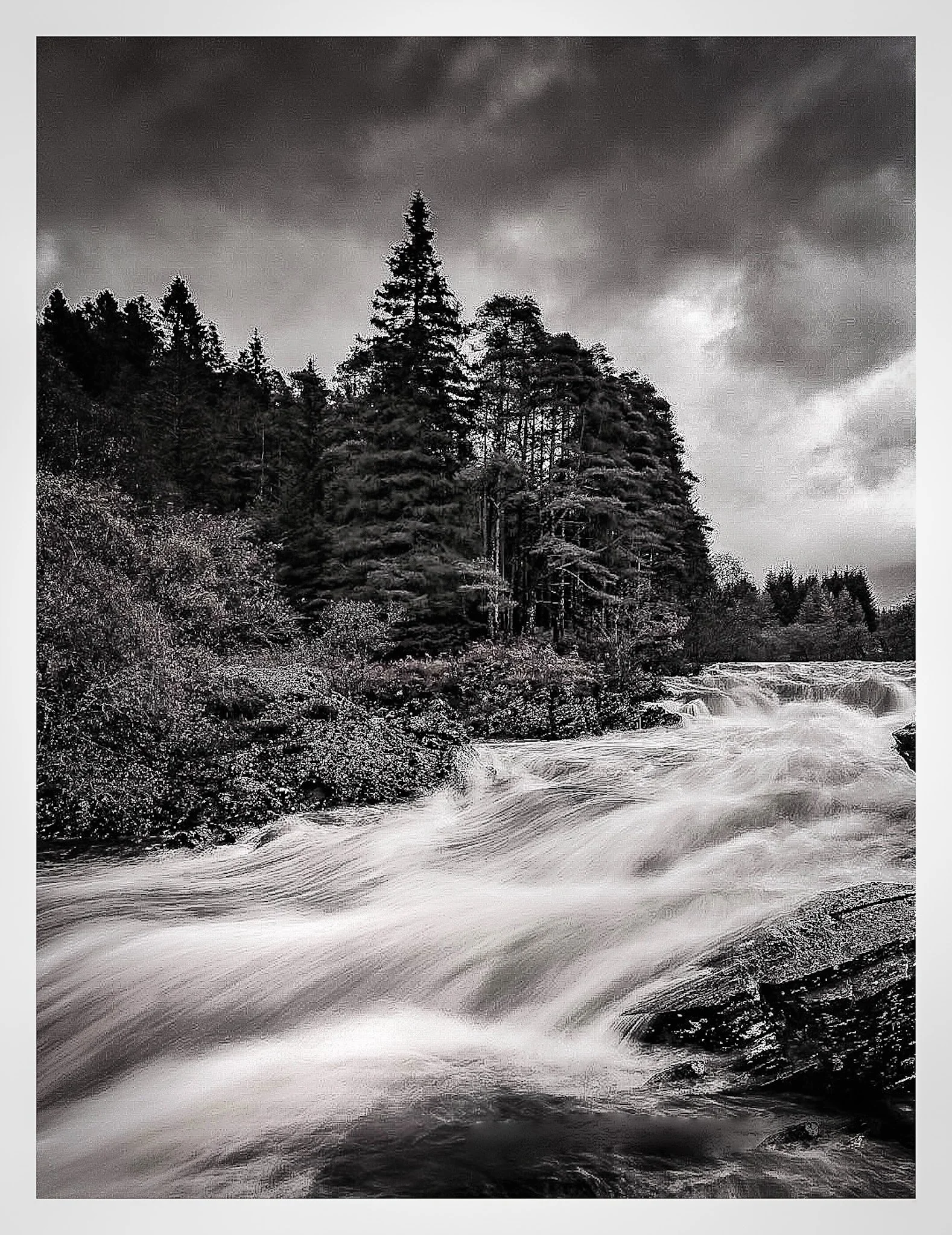Black and white photograph of a fast-flowing river with trees and cloudy sky in the background. View fullsize