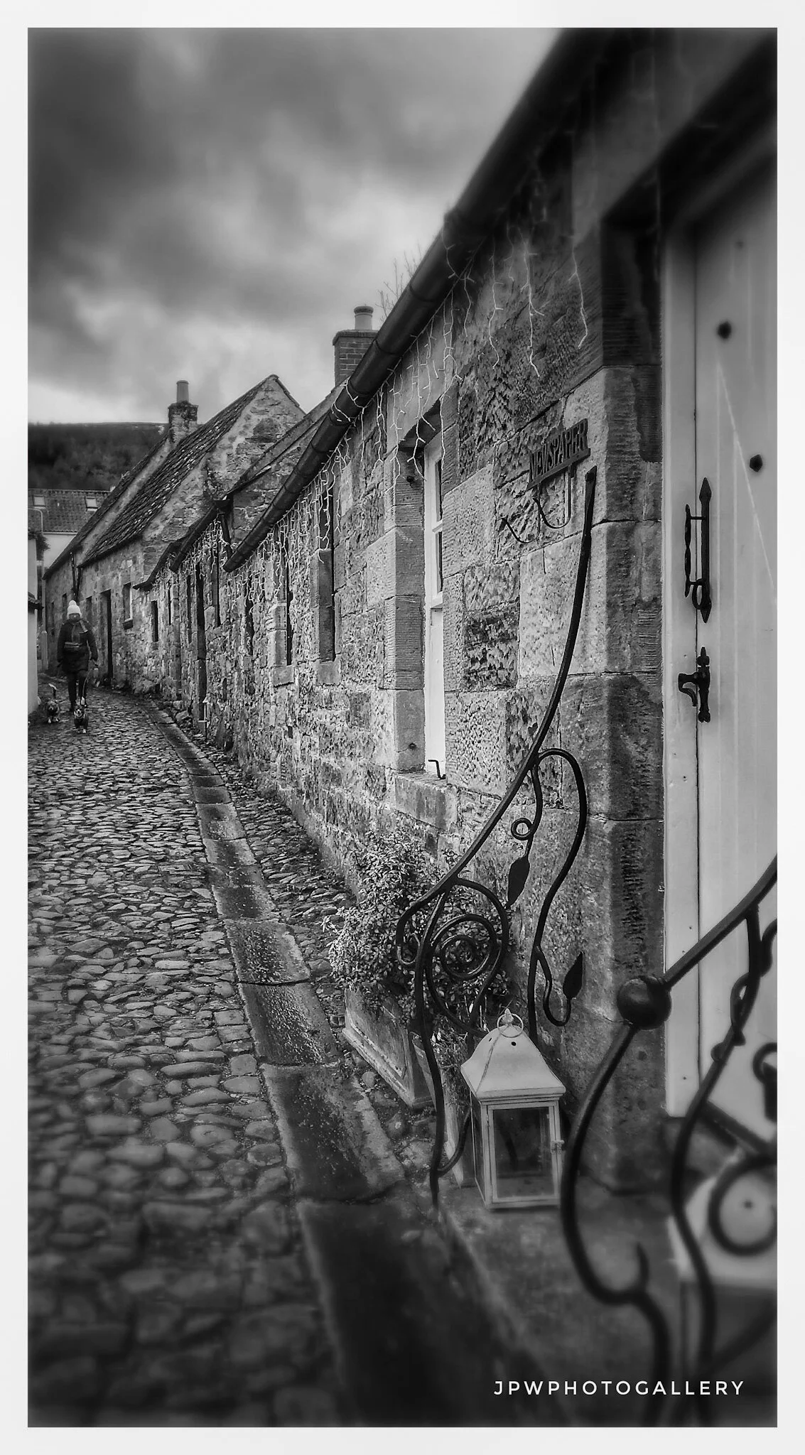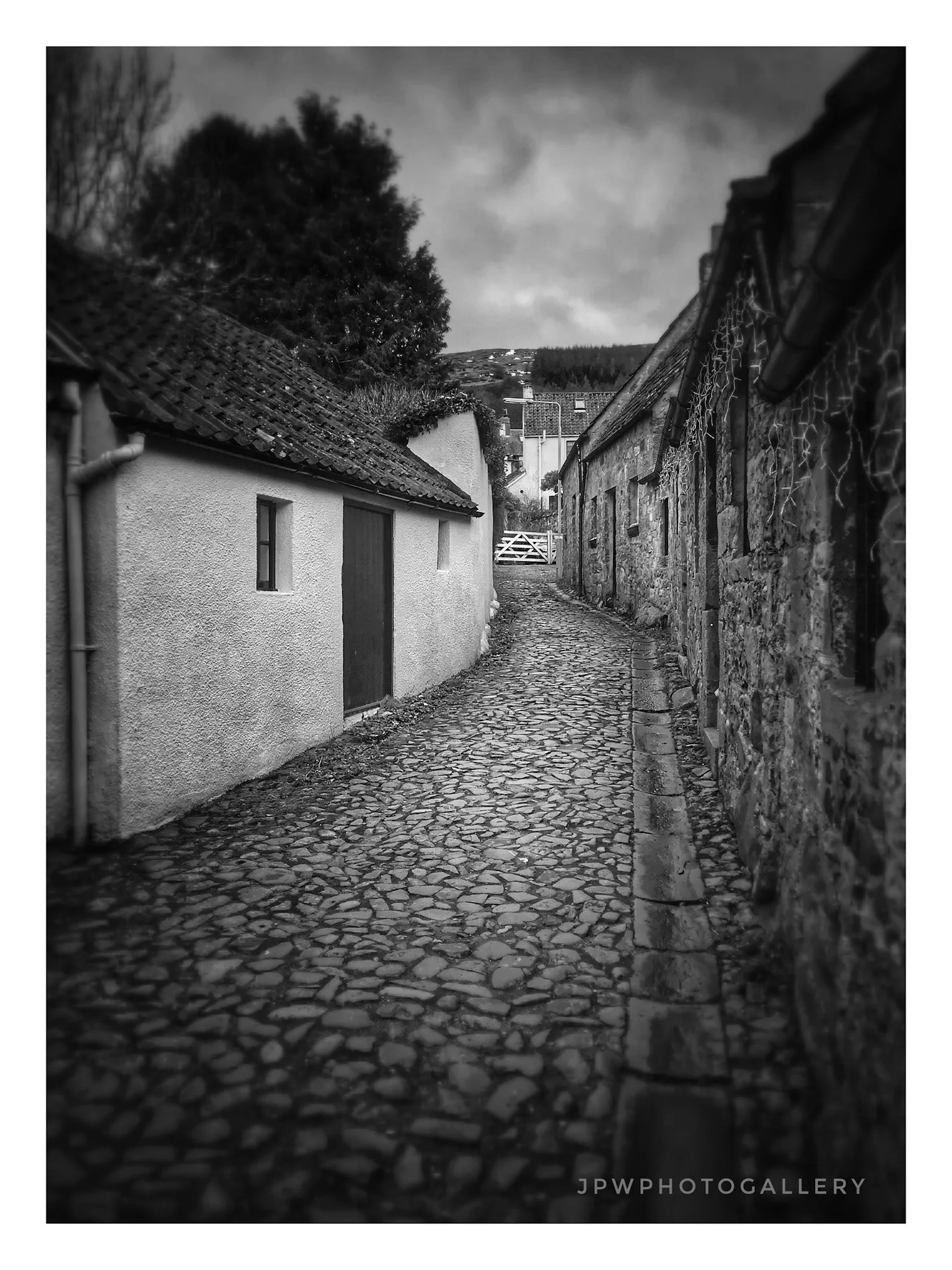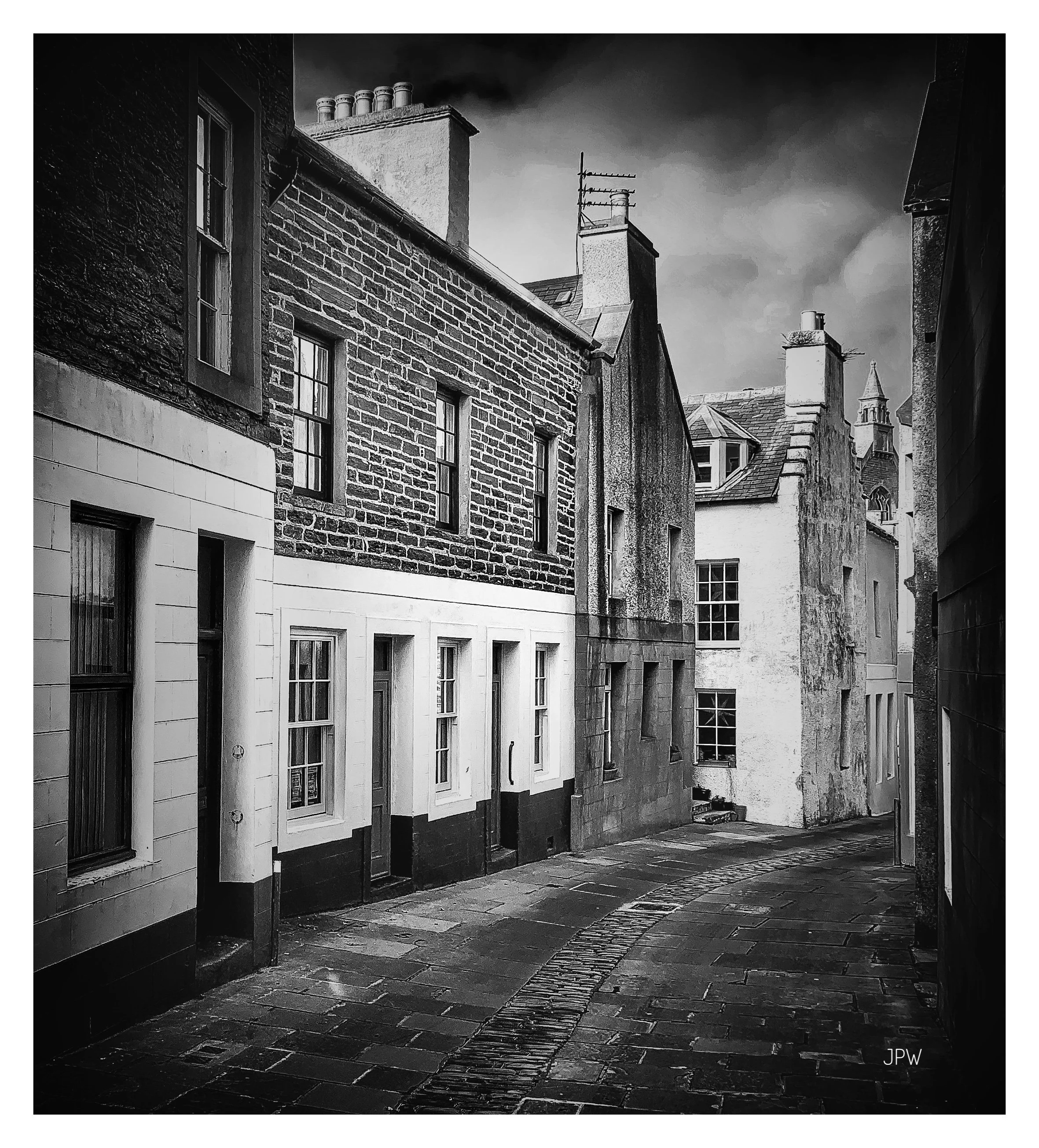 Black and white photo of an alleyway with old brick and stone buildings, some with chimney stacks, narrow and curving with a wet cobblestone street. View fullsize