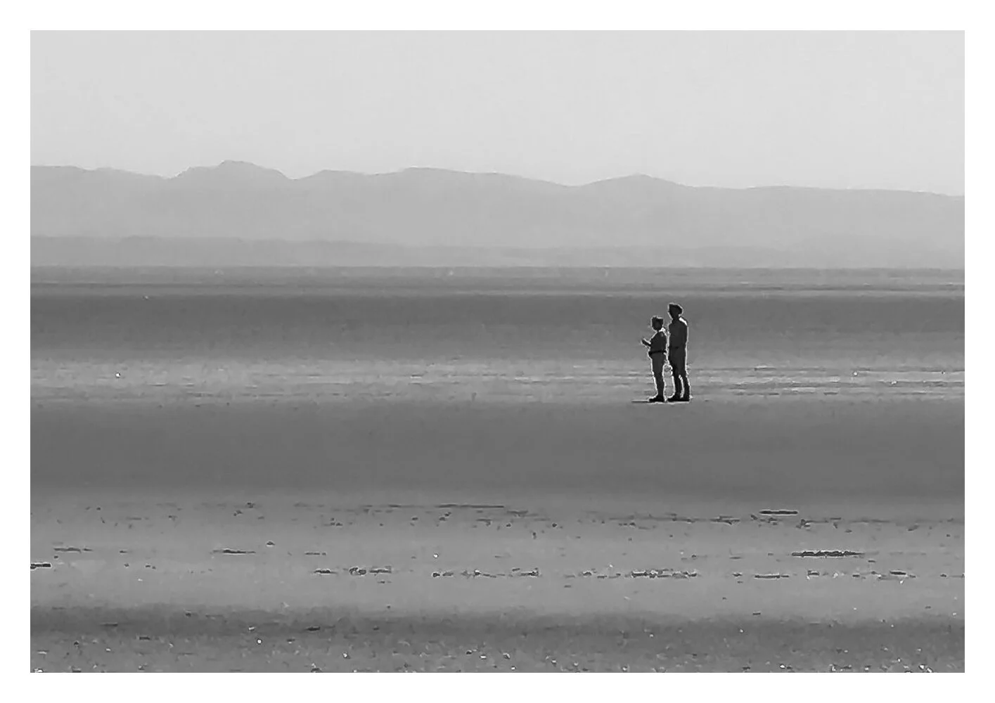 Two people walking on a vast, empty desert landscape with mountains in the background, one holding a paper or small object, shown in black and white. View fullsize