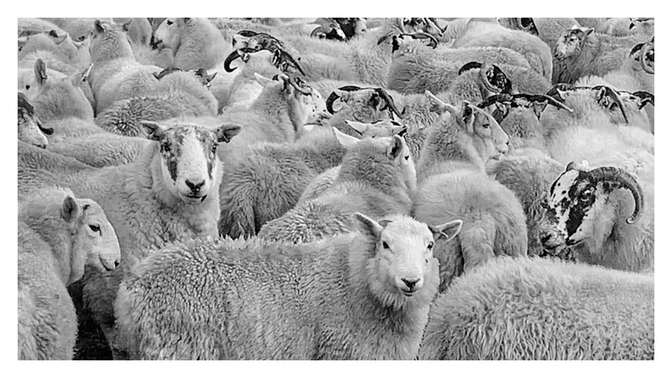 A black and white photo of a large herd of sheep and goats closely gathered together. View fullsize