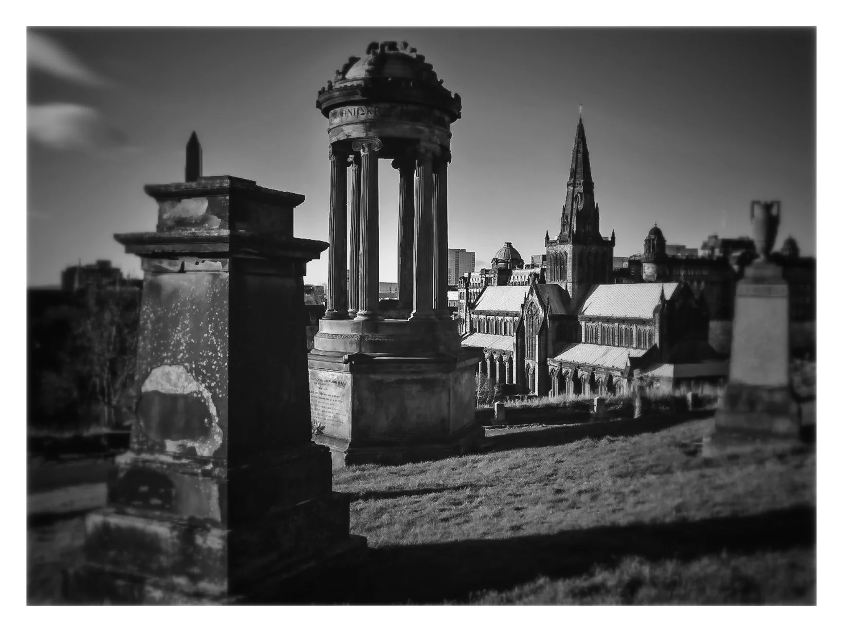 Black and white photo of a historic cityscape featuring a church with a tall spire, and a monument on a hill in the foreground. View fullsize