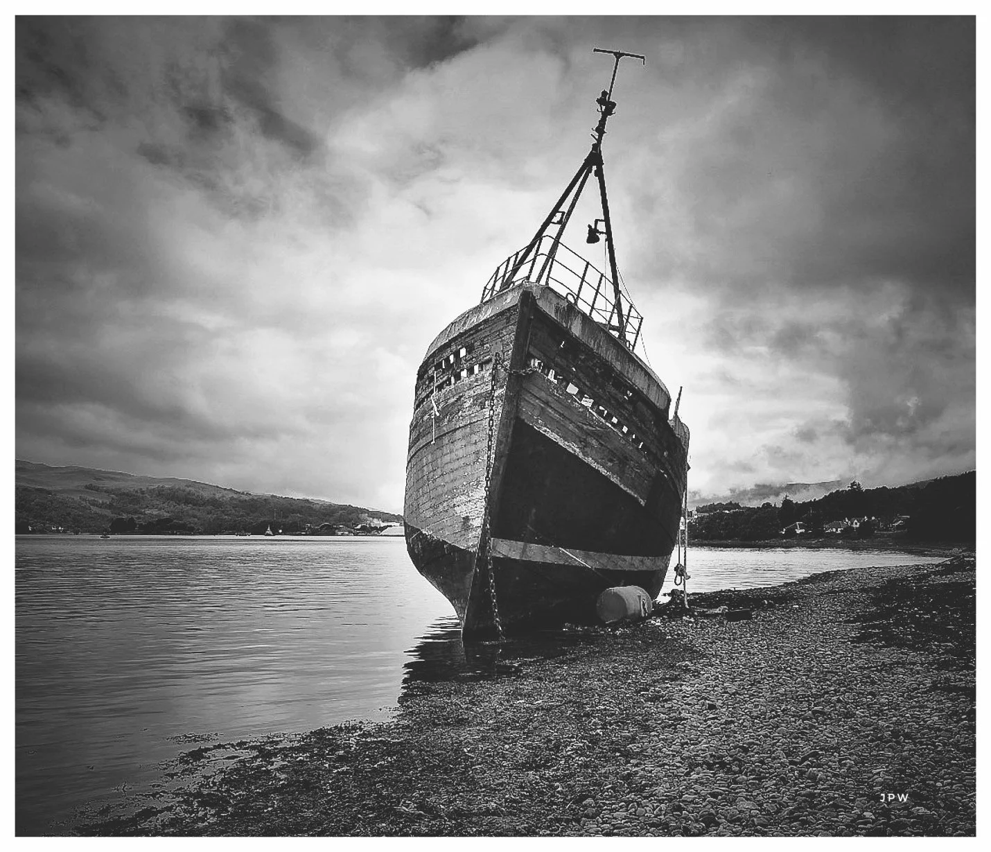 Black and white photo of an abandoned, rusted boat resting on a pebbled shoreline with water and hills in the background and a cloudy sky overhead. View fullsize