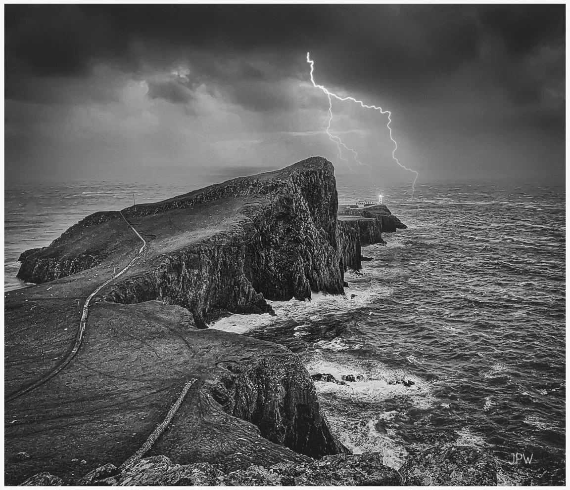 Black and white photo of a rugged coastline with steep cliffs, a pathway along the edge, and lightning striking in the stormy sky over the ocean. View fullsize
