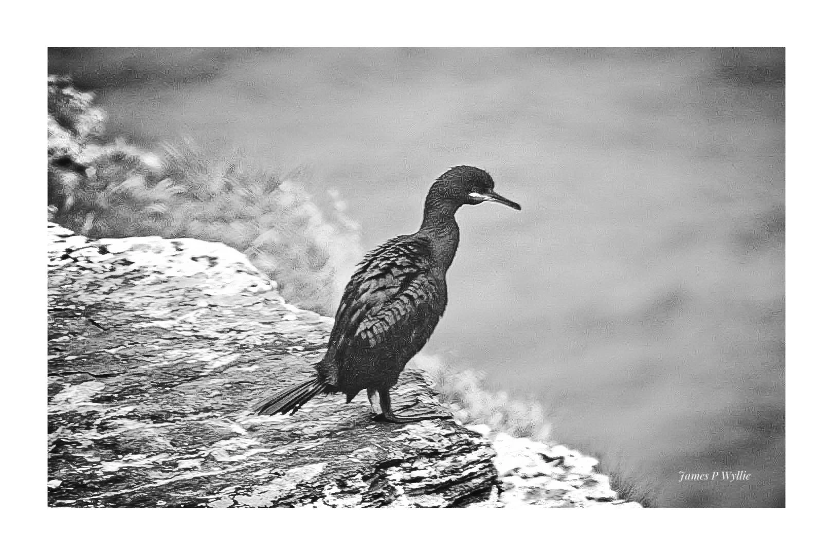 A black and white photograph of a bird standing on a rocky ledge near water. The bird appears to be a cormorant, with a long neck and beak, and its feathers are wet. View fullsize