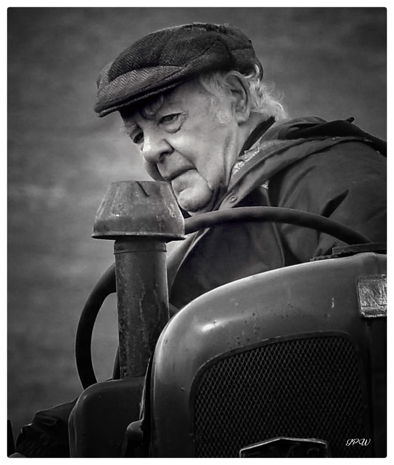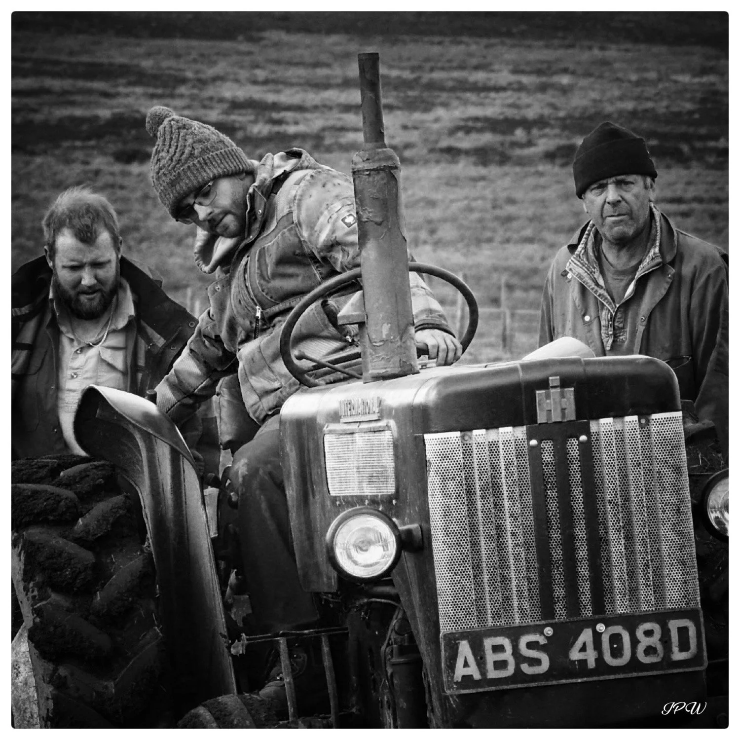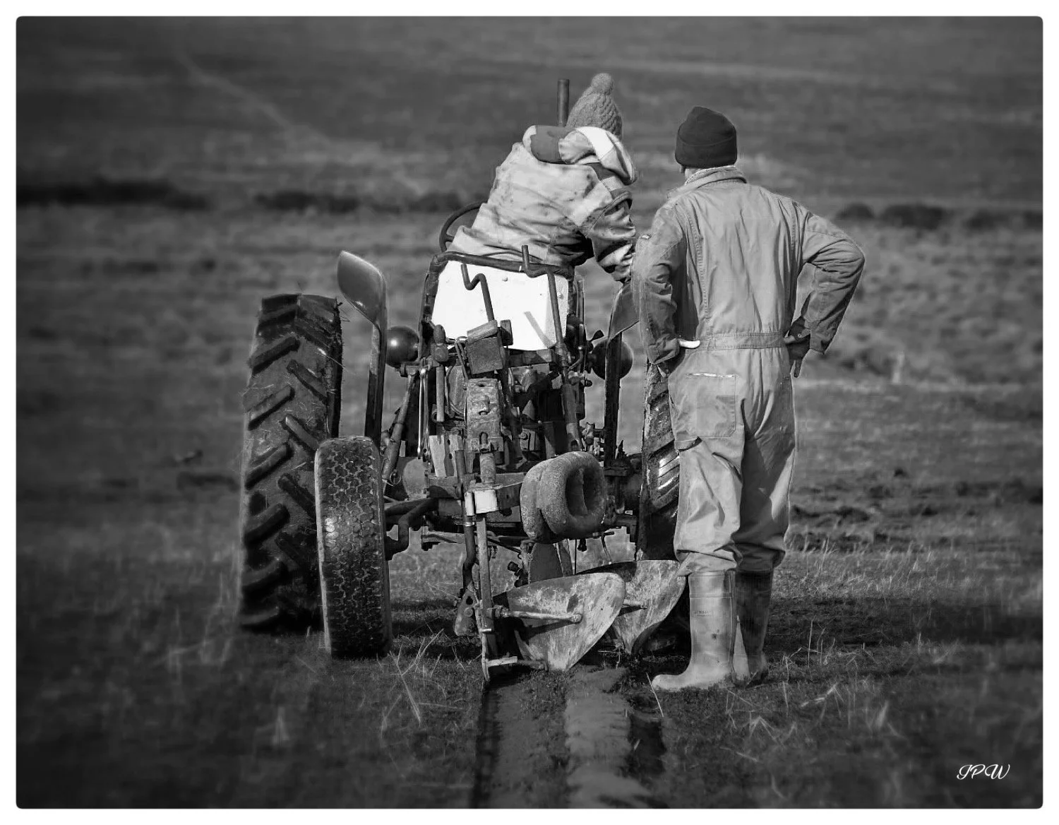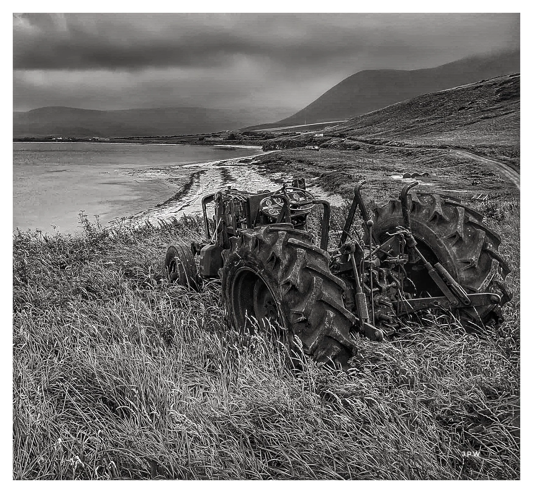 Black and white photo of an old tractor abandoned in tall grass beside a coastal shoreline with hills and mountains in the background under a cloudy sky. View fullsize