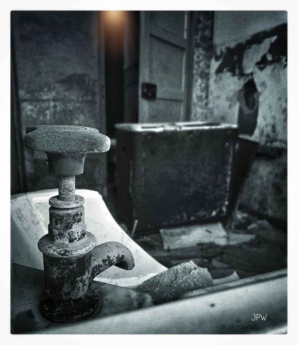 An old rusty faucet on a sink in a dilapidated, abandoned building with peeling walls and debris on the floor. View fullsize