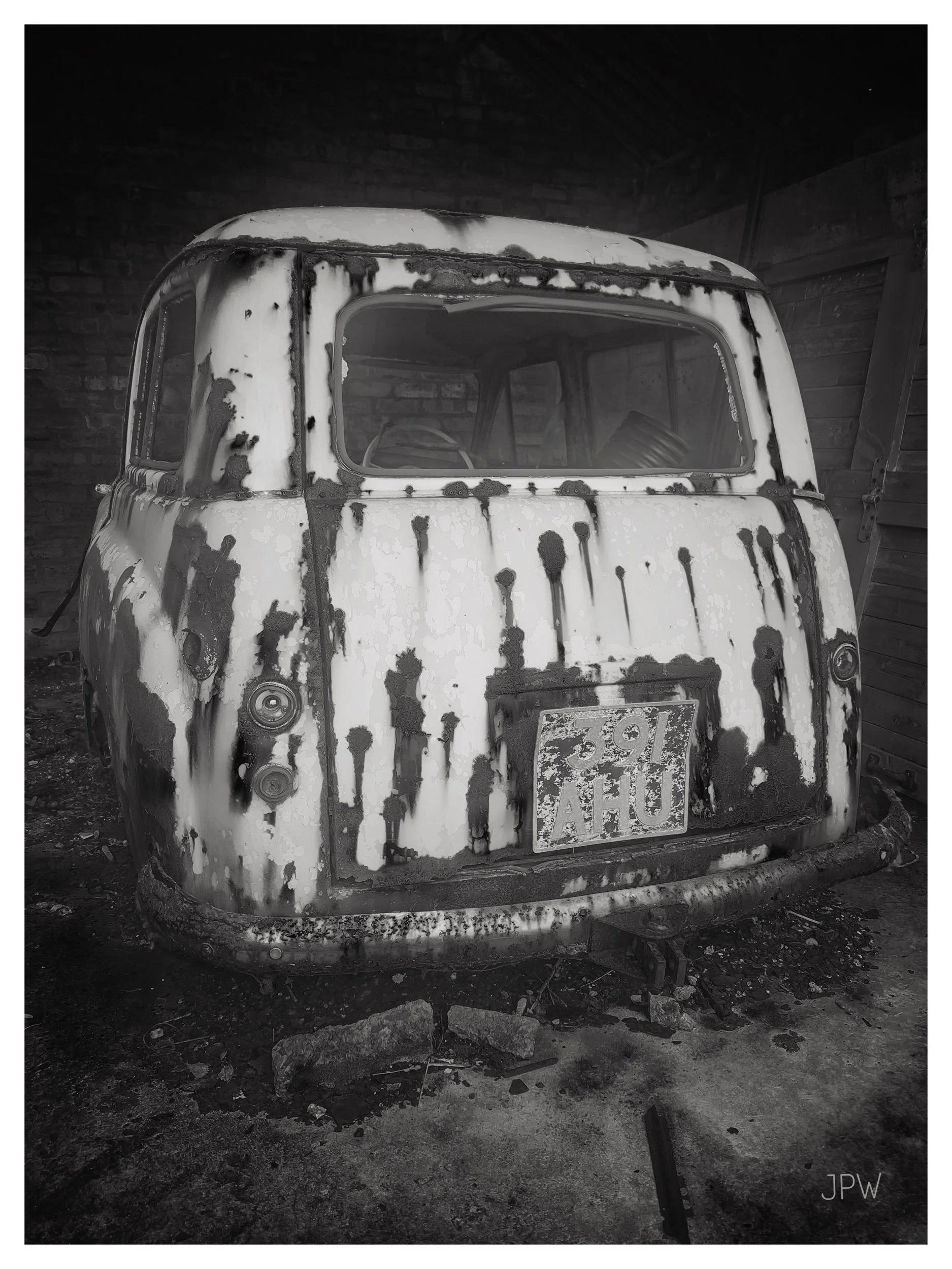 Old, rusted vehicle with damaged paint and a Canada license plate, parked in a garage or storage area, black and white photograph. View fullsize