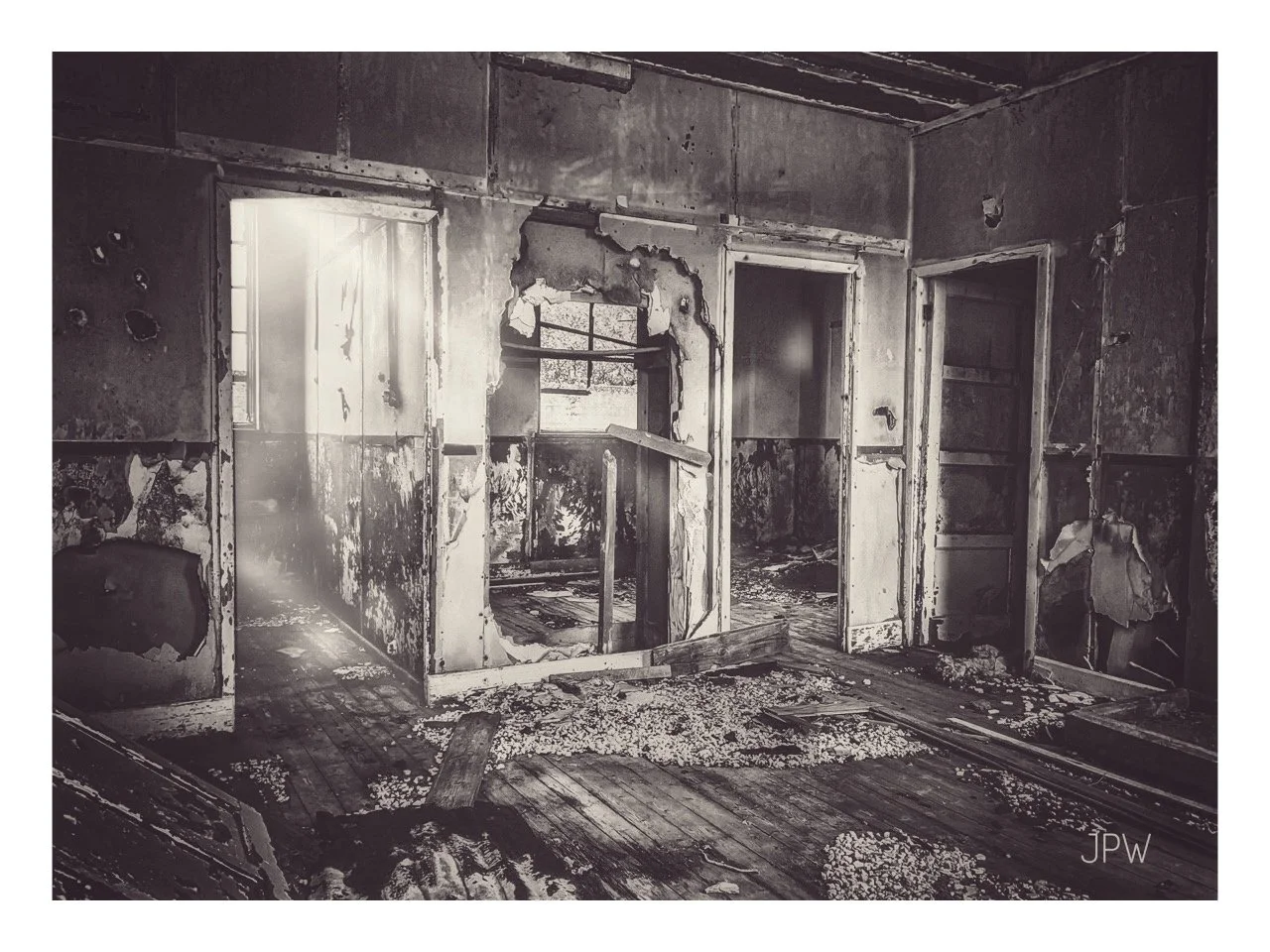 A black and white photo of an abandoned, severely damaged interior room with peeling walls, broken windows, damaged doors, and debris on the wooden floor. View fullsize