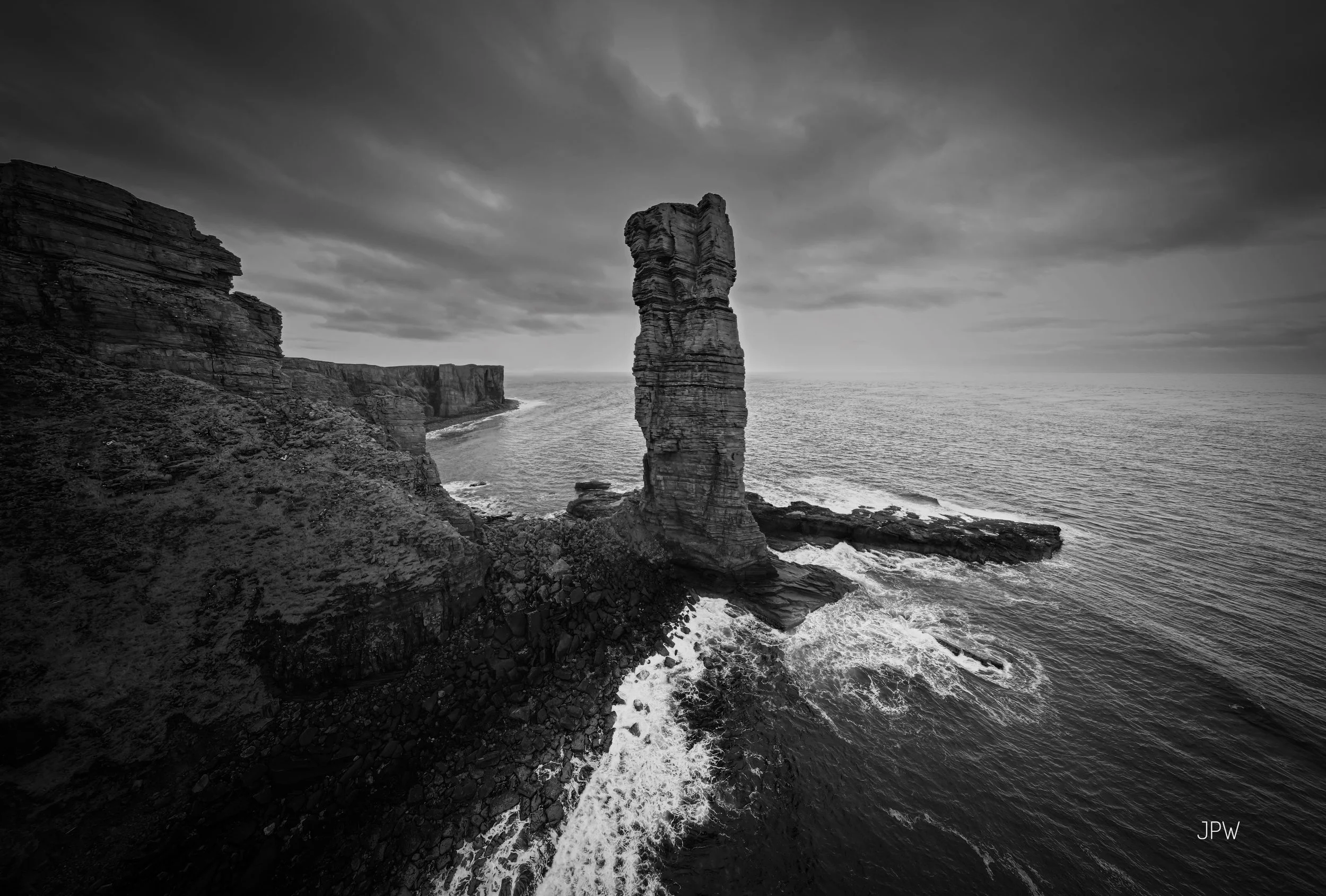 A black and white photo of steep cliffs and a tall, narrow sea stack formation rising from the ocean near a rocky shoreline, under a cloudy sky. View fullsize