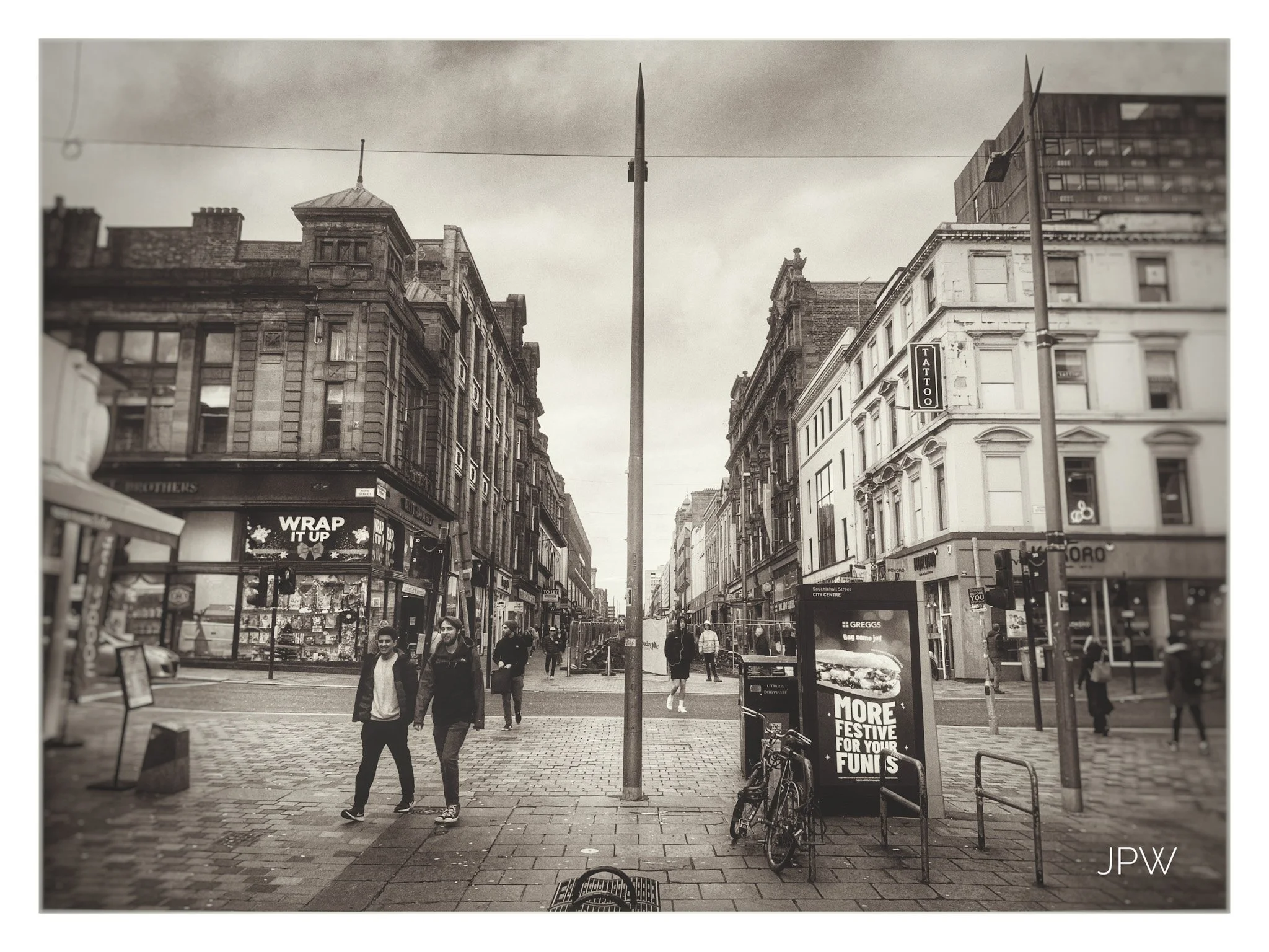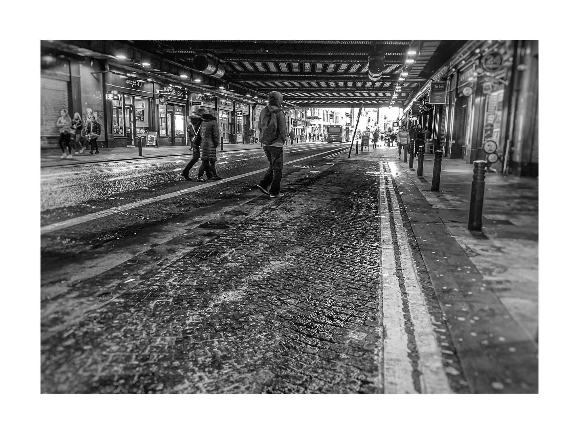 People crossing a wet city street under a covered walkway, with shops and streetcars in the background, in black and white. View fullsize