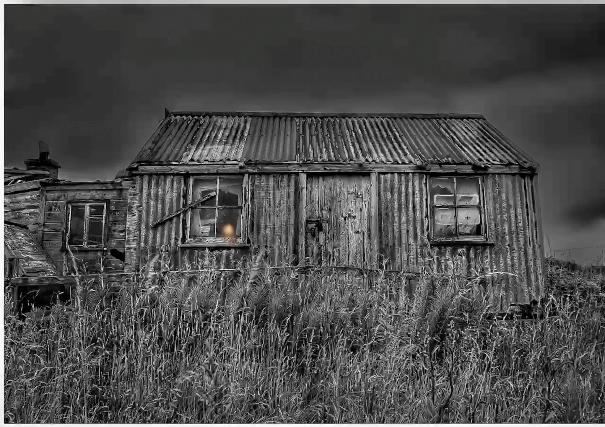 An abandoned, weathered wooden barn with missing roof sections, standing in tall grass under a cloudy, dark sky. View fullsize