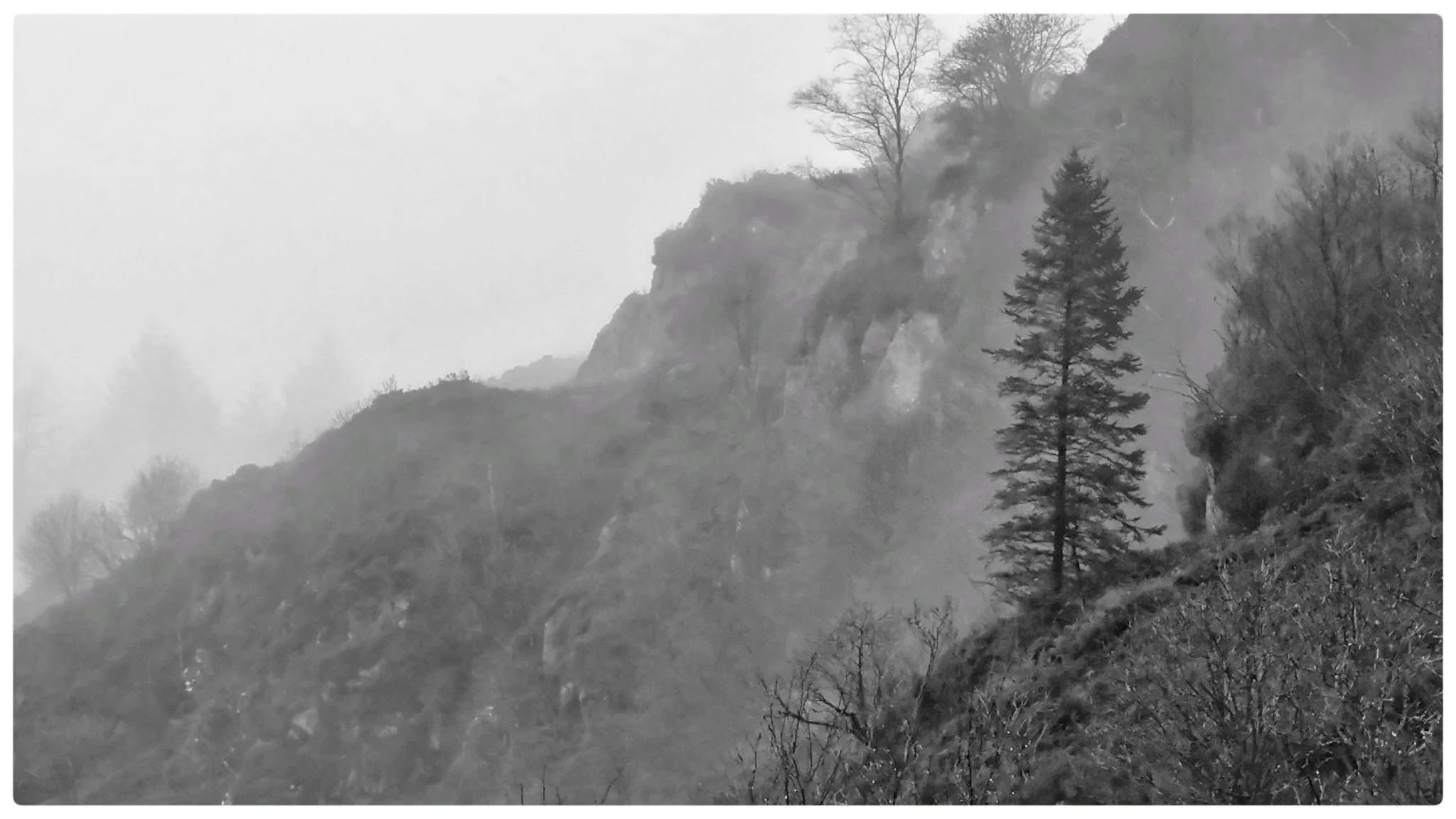 Black and white photo of a foggy mountain landscape with trees and rocky cliffs. View fullsize