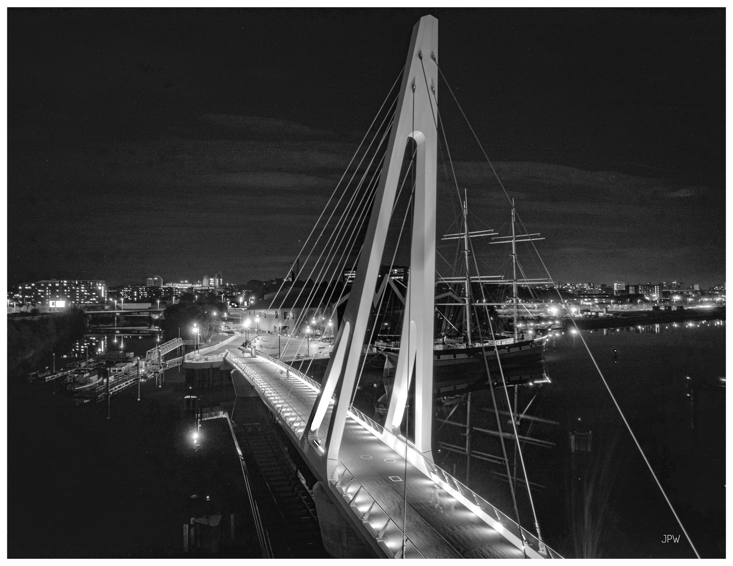 Night view of a modern, illuminated pedestrian bridge over a river, with a docked sailboat and city skyline in the background. View fullsize